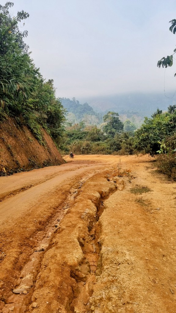 Le chemin est rougi de soleil et d’argile, et contraste avec les eaux opalines du Nam Nu lorsque parfois, il s’en approche. La rivière descend lentement et hormis quelques menus rapides en effleurant un rocher acariâtre et frondeur, un îlot de verdure barrant la route au flot régulier, l’eau forme presqu’un lac d’huile étiré en longueur entre les montagnes. Nous sillonnons la piste sur une trentaine de kilomètres. Vers midi, nous nous arrêtons sur un banc miniature coincé entre les murs de deux maisons d’un village croisé à mi-chemin.