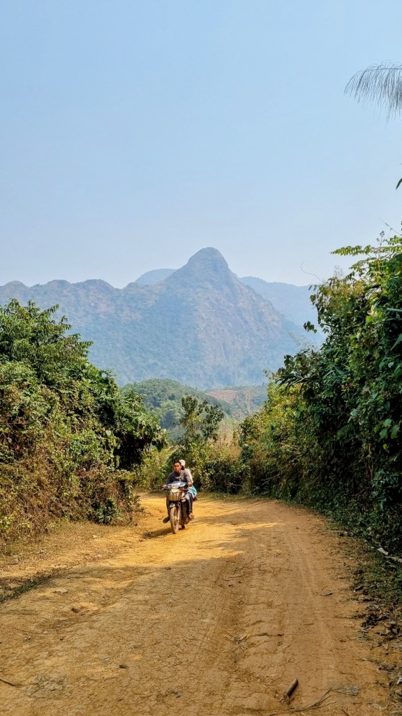 Le jour suivant, souhaitant rejoindre le village de Muang Ngoi au nord sans emprunter le cours d’eau, nous choisissons la piste qui longe la rivière, docile à cette époque de l’année. Nous allons apprivoiser une solitude minérale sinuant entre l’eau et la forêt, loin d’une effervescence touristique qui ne manquera pas d’animer le bourg en fin de matinée. Dans le brouillard de l’aurore, dans les brumes de chaleur qui succèdent, les montagnes du karst impressionnent par leurs tailles et leurs pentes acerbes. Elles se découpent en ombres chinoises sur une ligne d’horizon pastel, déclinant une élégante palette de gris ou de bleus tirant en fond de tableau sur un indécis blanc en coton. Puis elles se fondent dans le ciel scellant l’union entre deux continents.