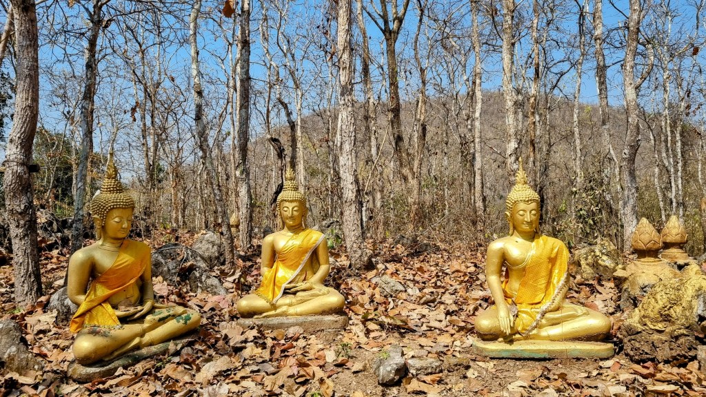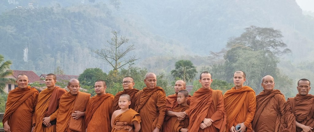 On reprend la route faite de plis et de lacets noués, vaporeuse sous un soleil chauffé à blanc. Un verger de pamplemoussiers chargés de fruits fripés où paissent des buffles gris et blancs longent le chemin un temps. Puis c’est une parcelle de bois de teck qui alignent ses troncs monotones. Nous marchons avec un infini plaisir sur le bord de la rivière Nam Nu. Elle coule et nous avec, au milieu d’une forteresse de calcaire.