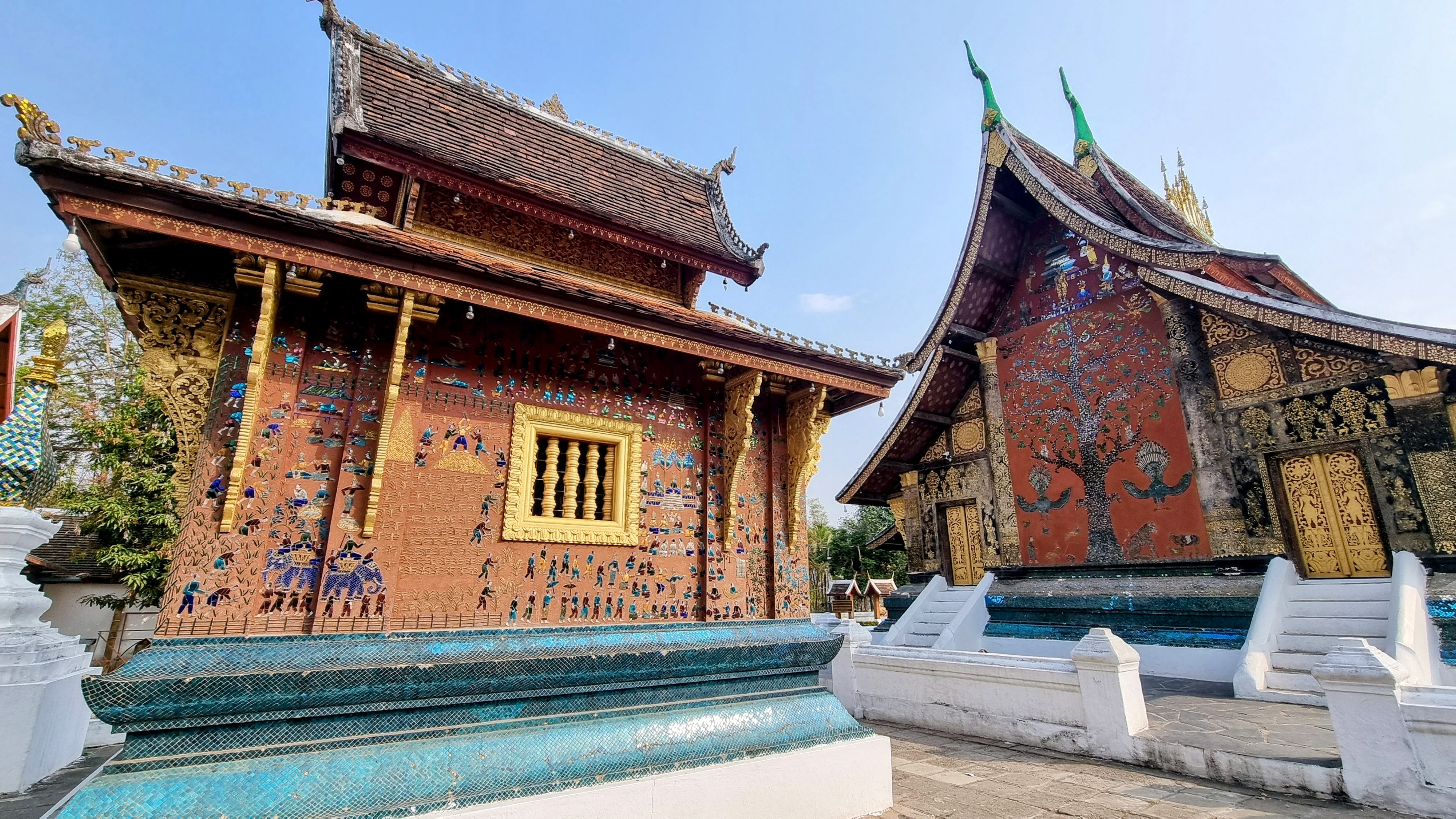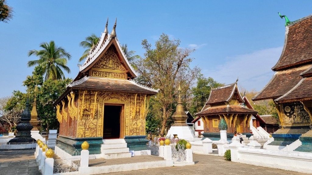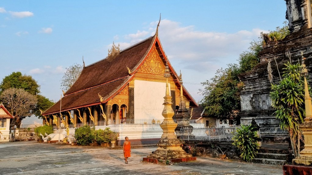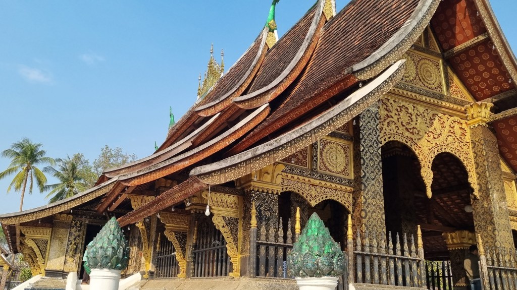 Luang Prabang, capitale du royaume Lao entre Mékong et Nam Khan. Elle est une perle posée au-dessus des eaux, au bout d’une péninsule de fin du monde. Les temples à l’esthétique Lao caractéristique semblent débarquer d’une ère lointaine. Parures d’or sur fond de bois sombres comme brûlés de soleil, enluminures éblouissantes, arabesques végétales et mosaïques colorées de personnages de légendes, façonnent le récit du royaume du million d’éléphants. Il fût un temps où temples et monastères occupaient la majeure partie de la cité. Une multitude de moines bouddhistes à la robe safran s’éparpille toujours dans la ville au milieu des visiteurs.