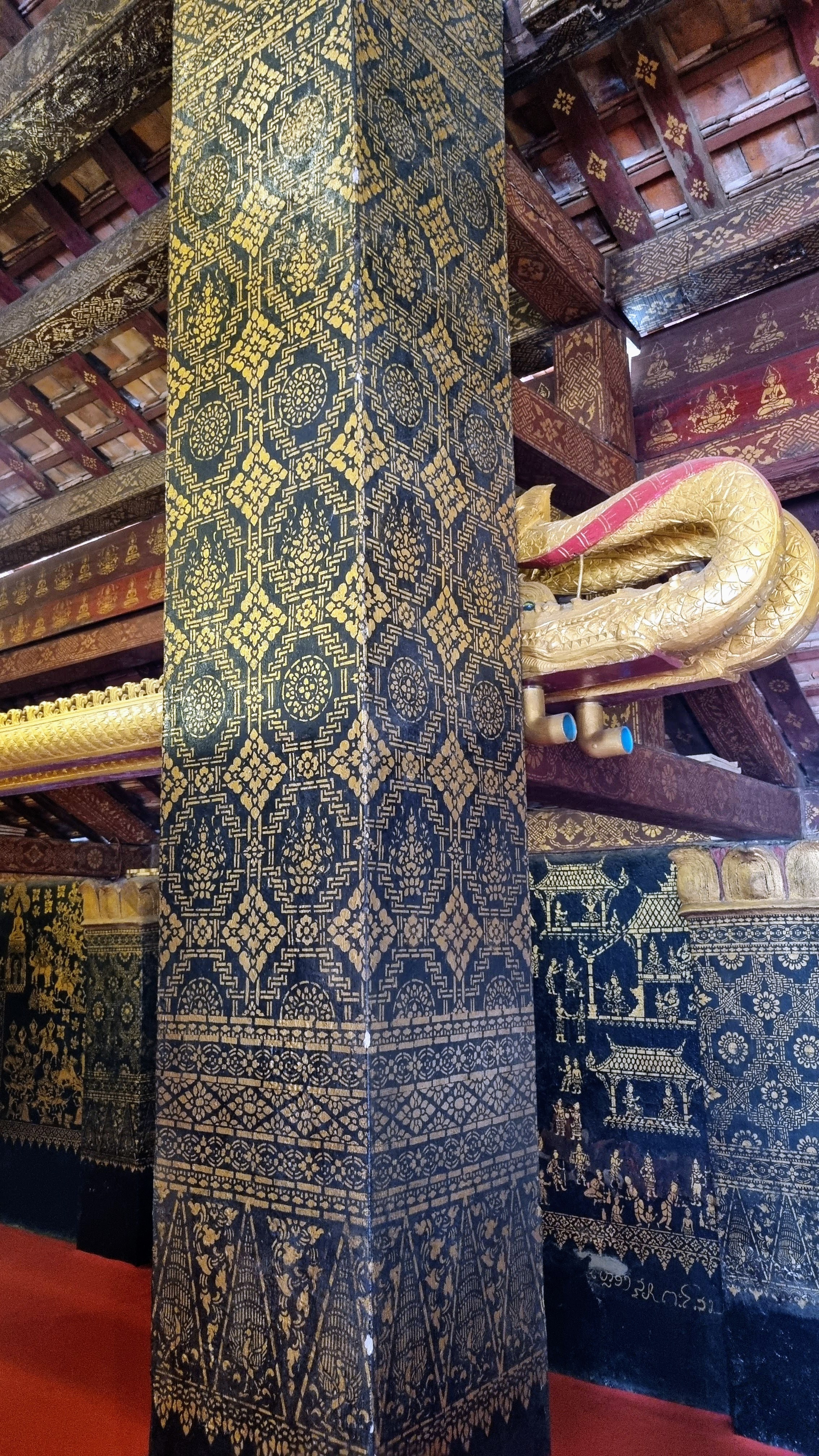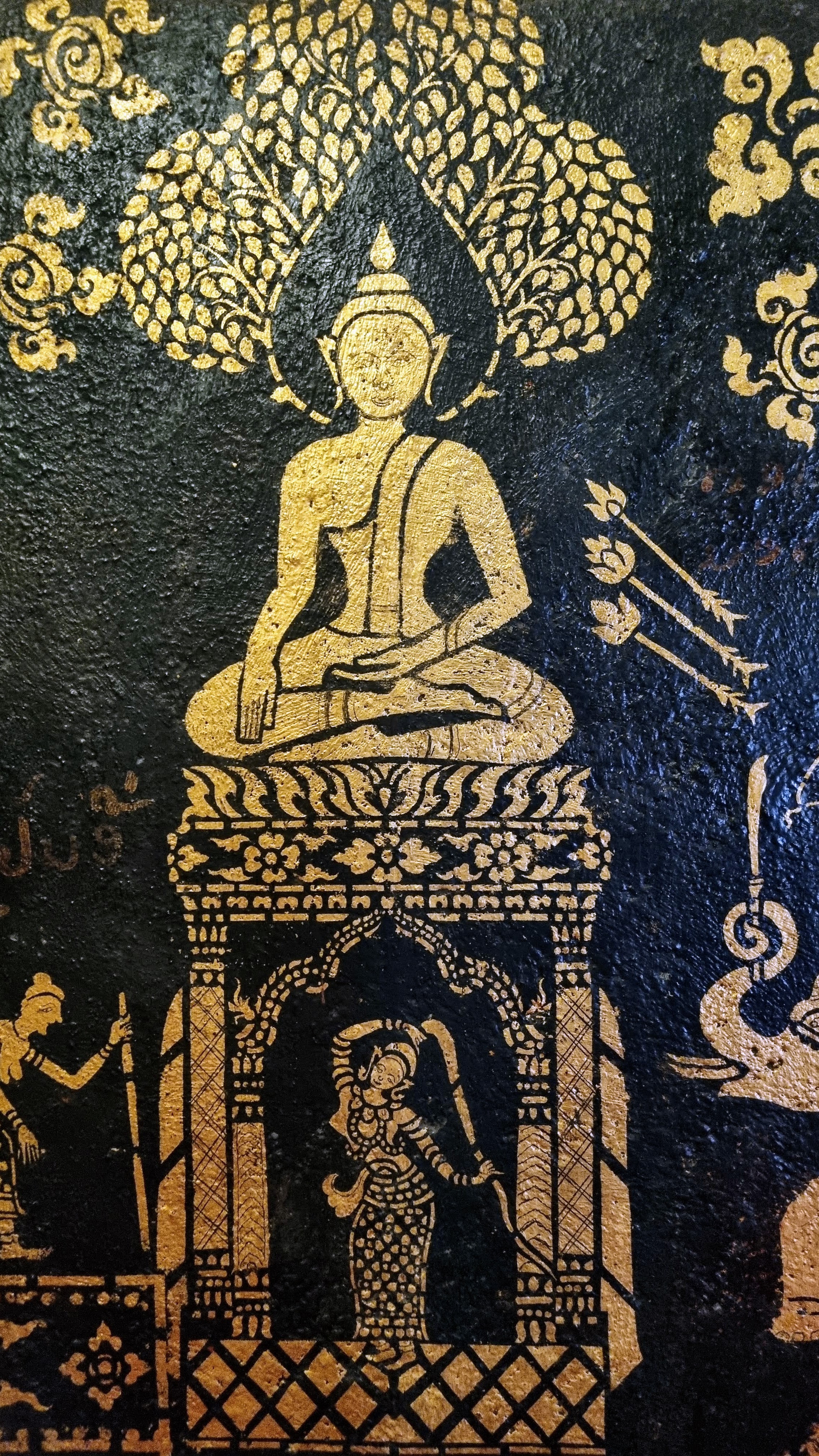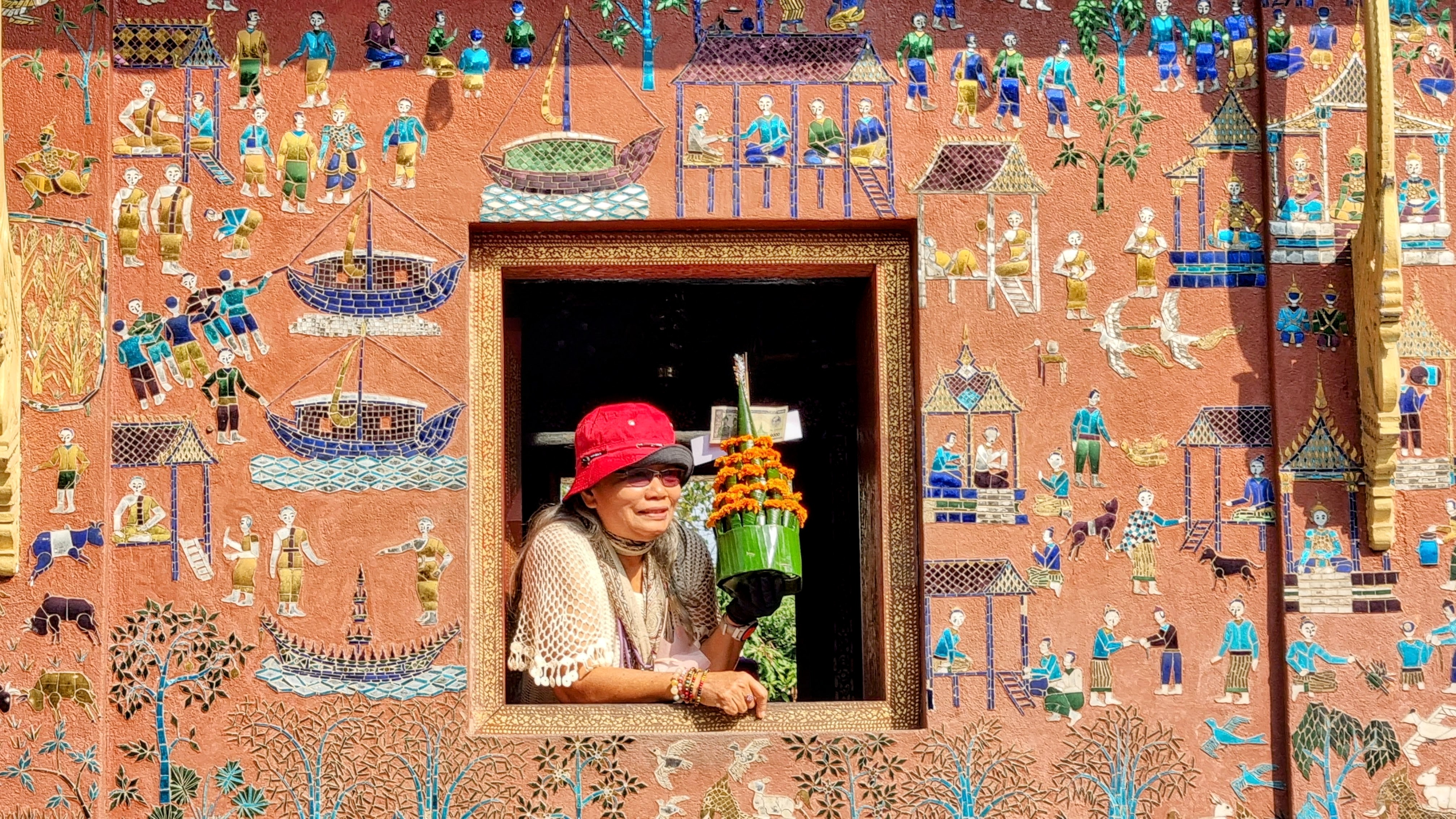 Luang Prabang, capitale du royaume Lao entre Mékong et Nam Khan. Elle est une perle posée au-dessus des eaux, au bout d’une péninsule de fin du monde. Les temples à l’esthétique Lao caractéristique semblent débarquer d’une ère lointaine. Parures d’or sur fond de bois sombres comme brûlés de soleil, enluminures éblouissantes, arabesques végétales et mosaïques colorées de personnages de légendes, façonnent le récit du royaume du million d’éléphants. Il fût un temps où temples et monastères occupaient la majeure partie de la cité. Une multitude de moines bouddhistes à la robe safran s’éparpille toujours dans la ville au milieu des visiteurs.