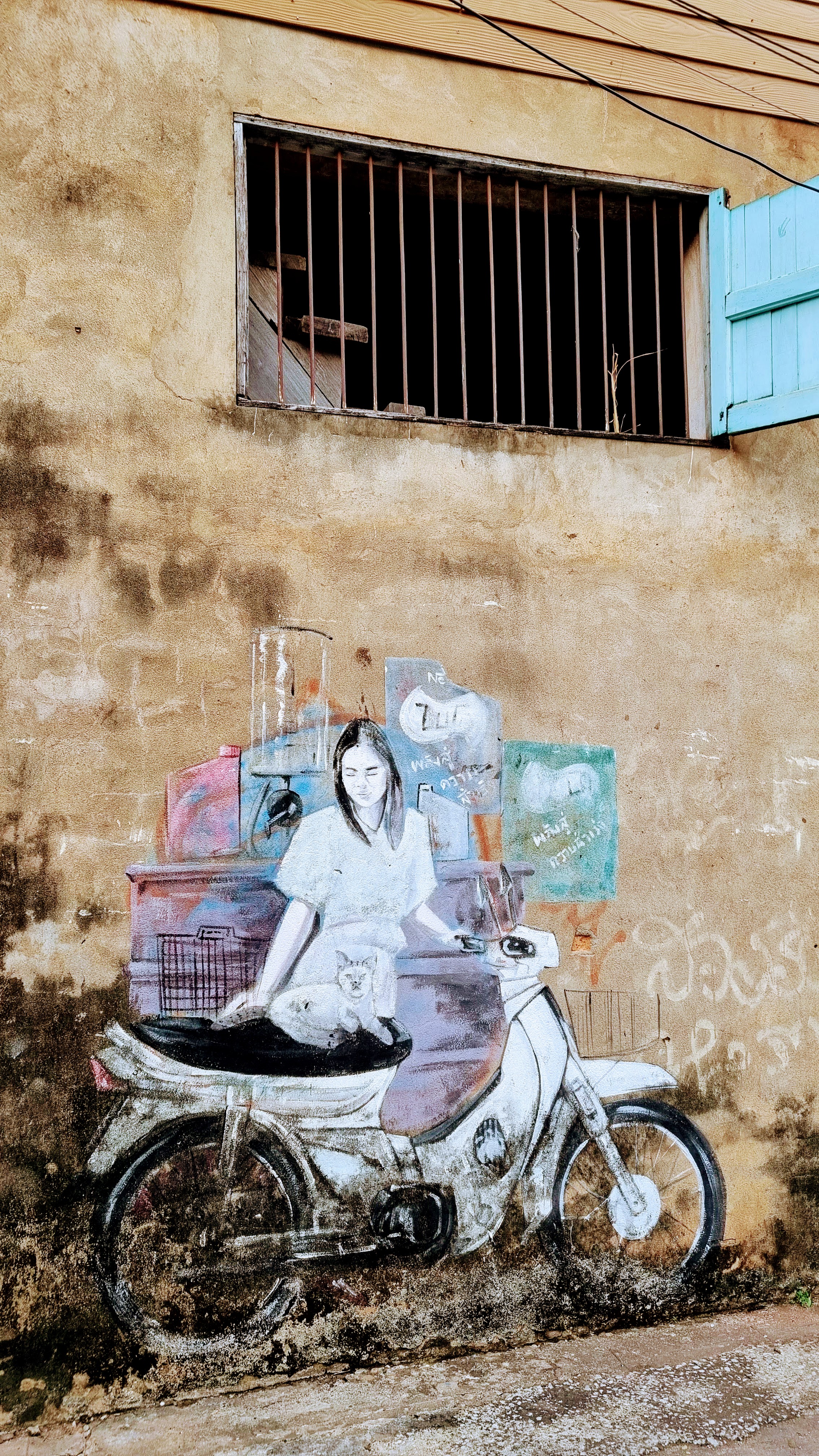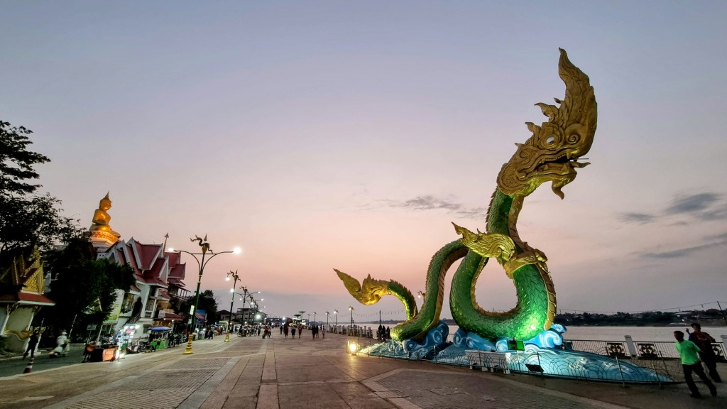 Le soir, la ville entière se promène le long du Mékong. Contrairement à Vientiane, l’eau est à portée de main. Les couchers de soleil sont encore une fois à la hauteur de ceux que l’on aura pu admirer lorsque nous croisions le fleuve roi. Des stands de nourritures étalent les traditionnels tabourets de couleurs sur la chaussée. La fumée des fondues se mêle à l’air tiède tandis que des groupes féminins ébauchent à deux pas de là, des chorégraphies toniques face au fleuve. Et même s’il y a du monde et une activité conséquente à cet instant, on se sent curieusement un peu à l’écart du bruit dans cette ville. Si le quotidien est animé, on dirait qu’il ne s’emballe pas pour autant. Le Mékong sur cette rive est un long fleuve tranquille.
