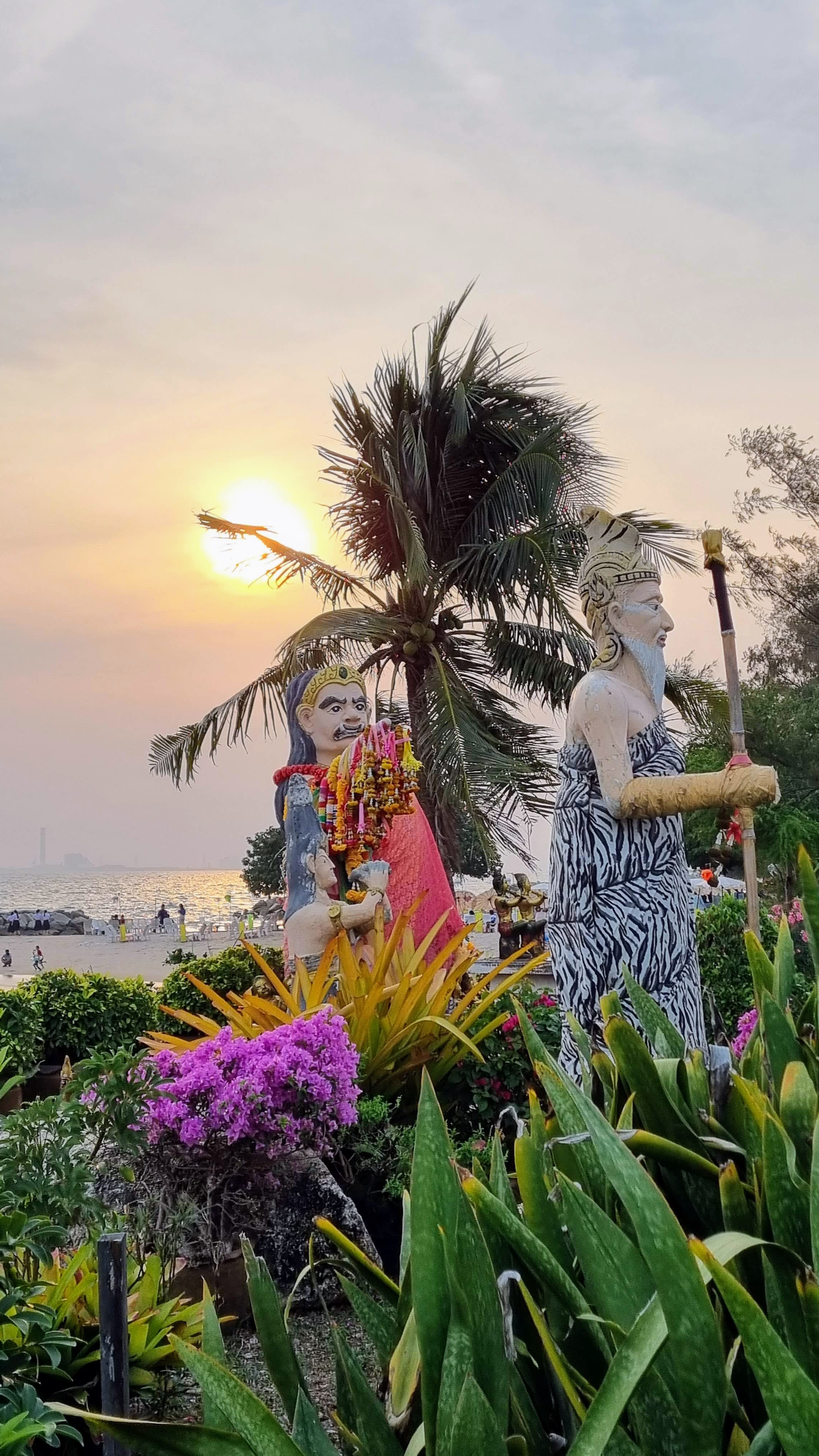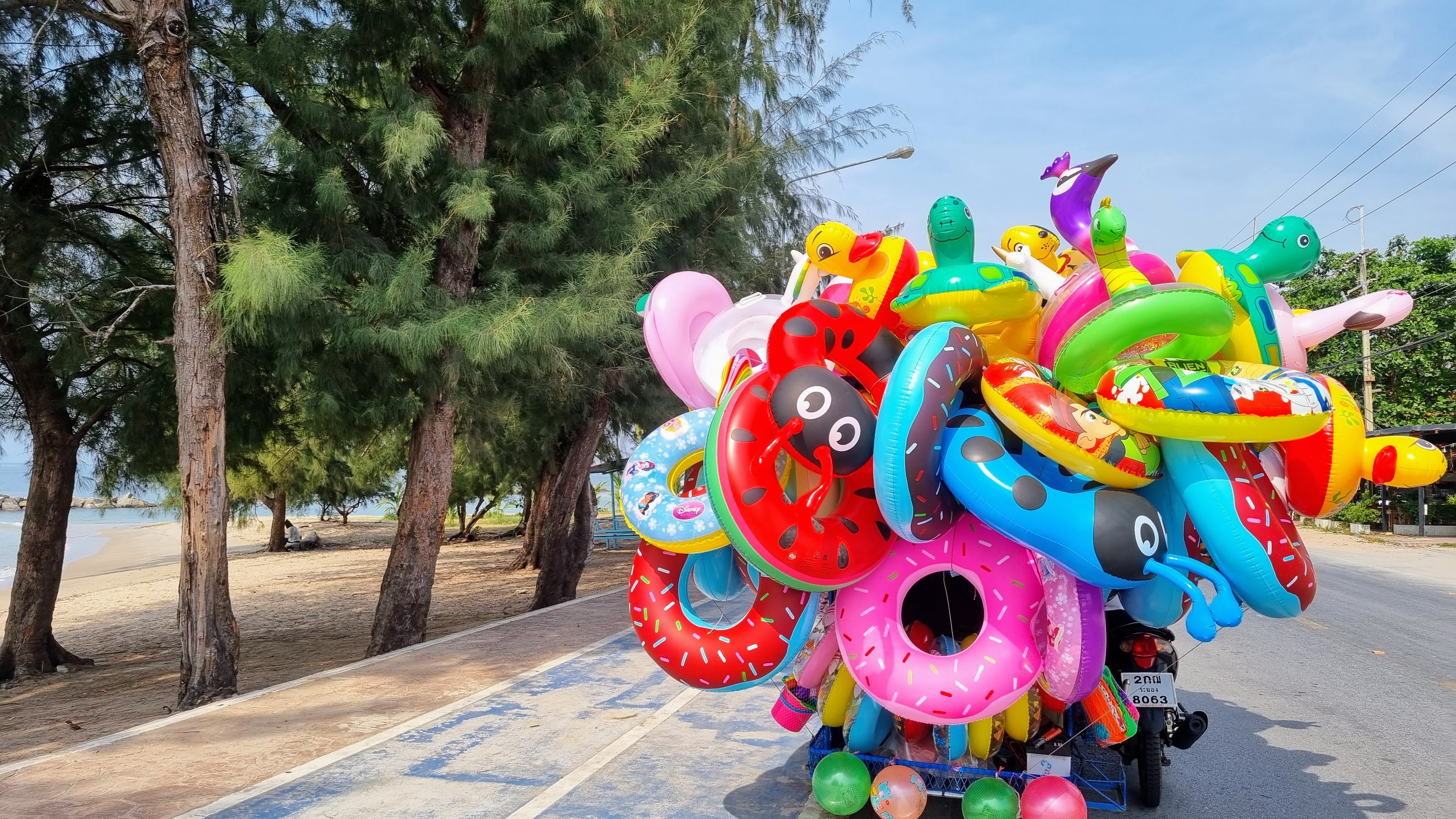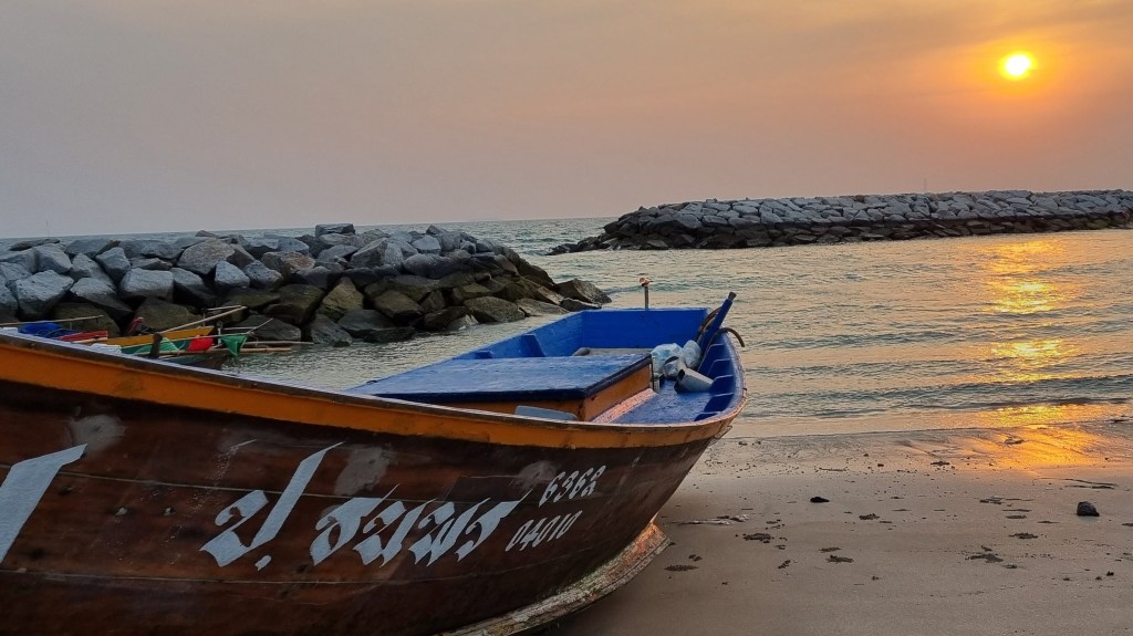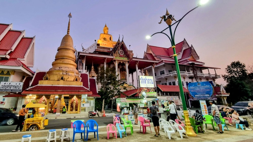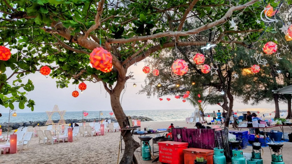 Le week-end, les thaïlandais se retrouvent sur la plage et sur la route qui la borde. Des tentes de toiles éphémères sont montées entre sable et bitume pour y installer quelques sièges, transats et tabourets en plastique. Des lampions colorés suspendus aux arbres viennent parfaire un tableau voué à la détente et aux rencontres. On décapsule quelques bières et on se régale de brochettes de boulettes, de soupes de nouilles et de poissons grillés. Rien de très novateur, si ce n’est que l’on est samedi et que l’on dîne ce soir entre amis, en famille et sur la plage. La fête s’étend sur une grande partie du littoral et c’est un plaisir de longer la mer en changeant d’ambiance à chaque mètre.