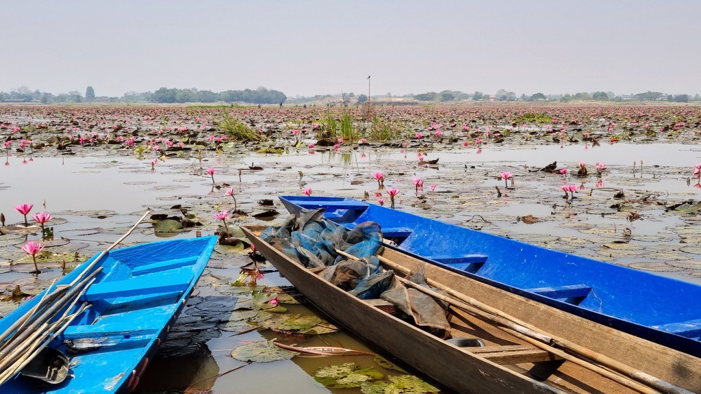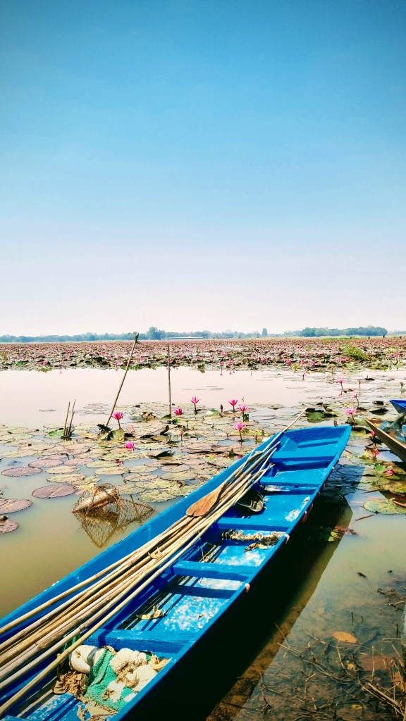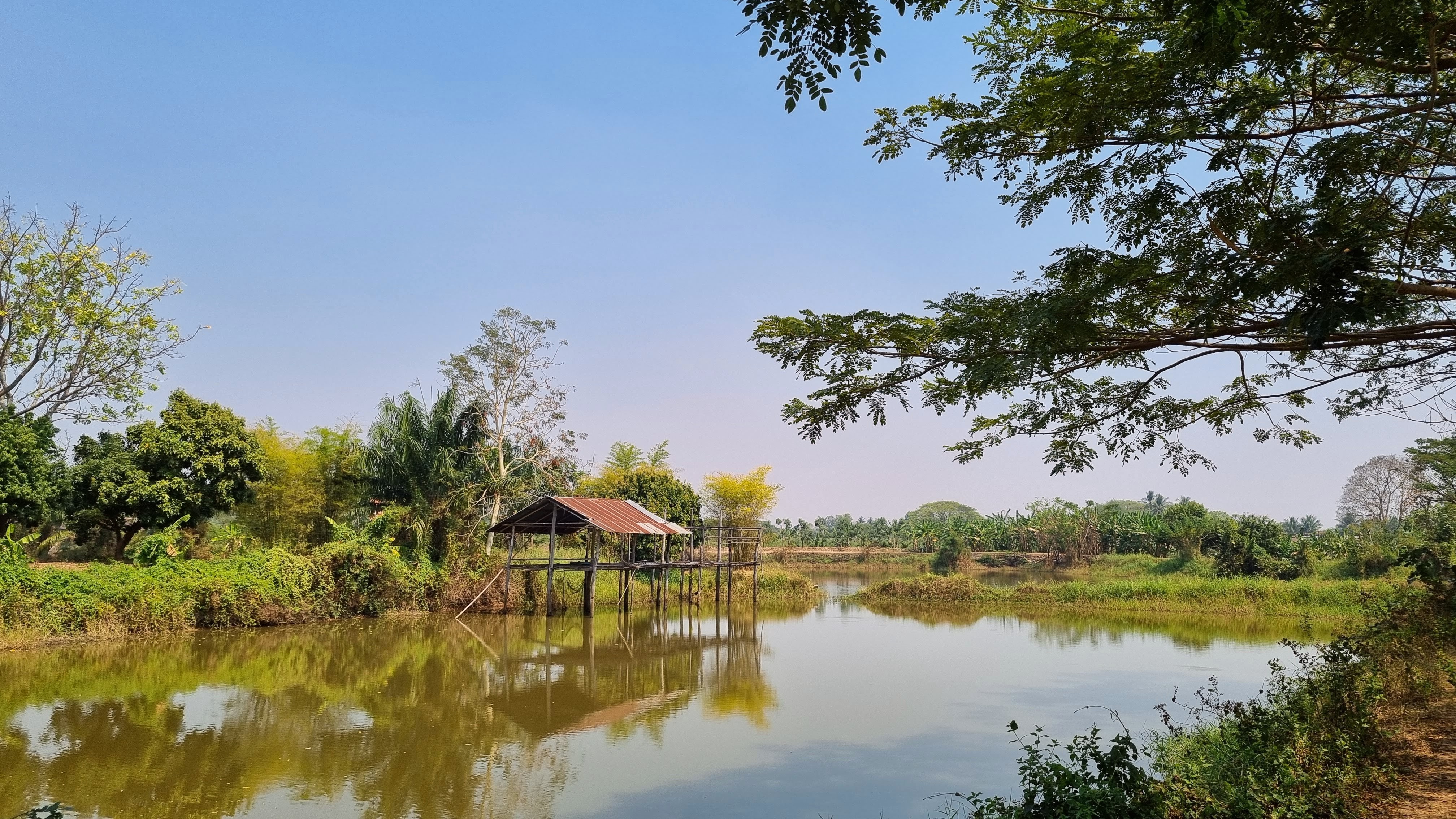 Le lendemain, nous remontons en selle et partons à vélos explorer plus amplement la région. Nous nous enfonçons dans les terres en quittant les grands axes routiers, traversons des paysages de rizières et d’étangs colonisés par une végétation aquatique. Le bruit des voitures s’évapore et laisse place libre aux oiseaux nombreux s’épanouissant dans un tableau champêtre où l’on pourrait aisément et sans surprise croiser « Les enfants du marais » de Becker. Un homme mène lentement sa barque, lance son filet au milieu des fleurs de lotus, et trace un sillon entre les feuilles colonisant une surface liquide stoïque. Le bruit d’une pompe relevant l’eau de l’étang destinée à l’arrosage d’un champ voisin vient troubler la sérénité des lieux. Nous continuons sur une route sinueuse et plane au milieu des cultures et de quelques hameaux plantés là depuis toujours. Nous avançons lentement au même rythme que le monde.