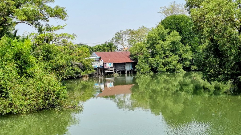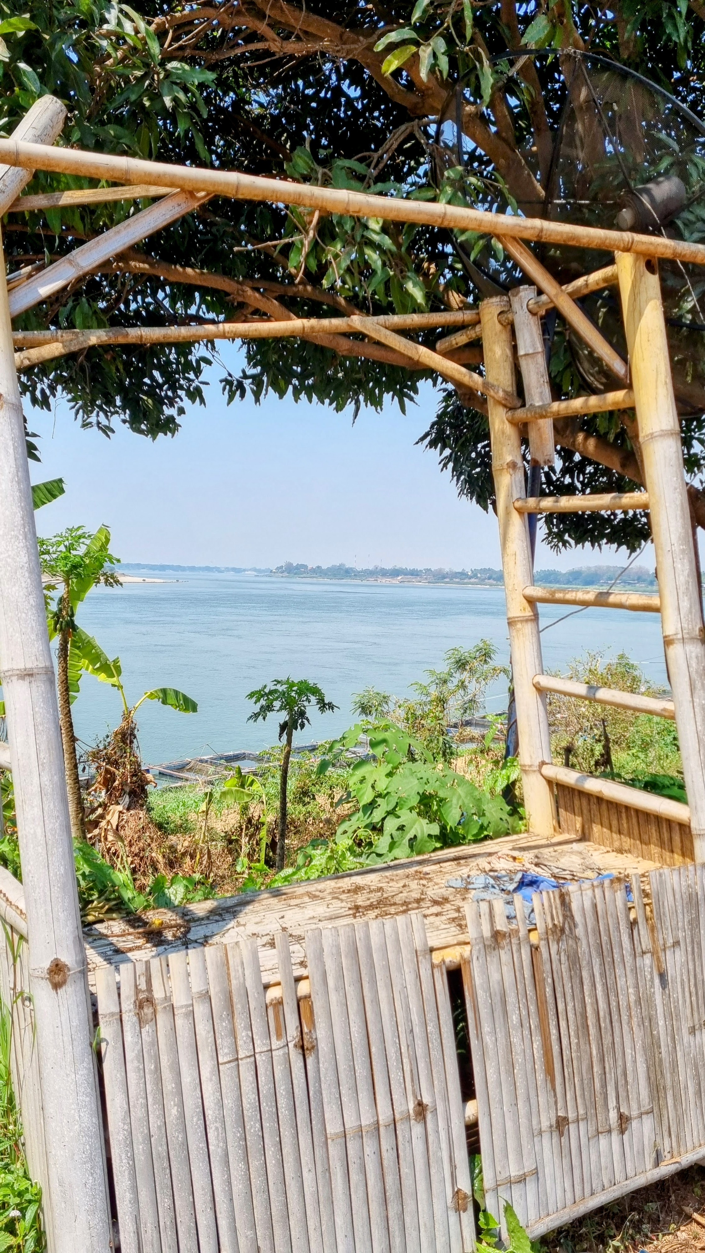 Nous reviendrons plus tard en ville en rejoignant le Mékong, longeant ses méandres à bicyclettes dès que l’on peut s’en approcher. Un village de maisons en bois s’aligne sur la rive. Les habitants patientent en attendant le soir, bavardant entre voisins à l’ombre des hangars, occupant le temps par de menus travaux d’entretien ou de cuisine. Une activité plus soutenue reprend généralement en fin de journée lorsque le climat redevient plus serein.