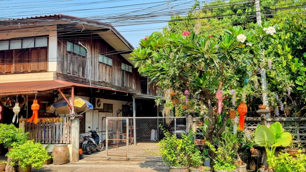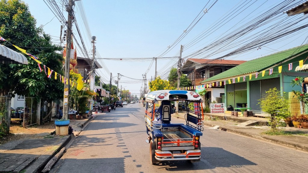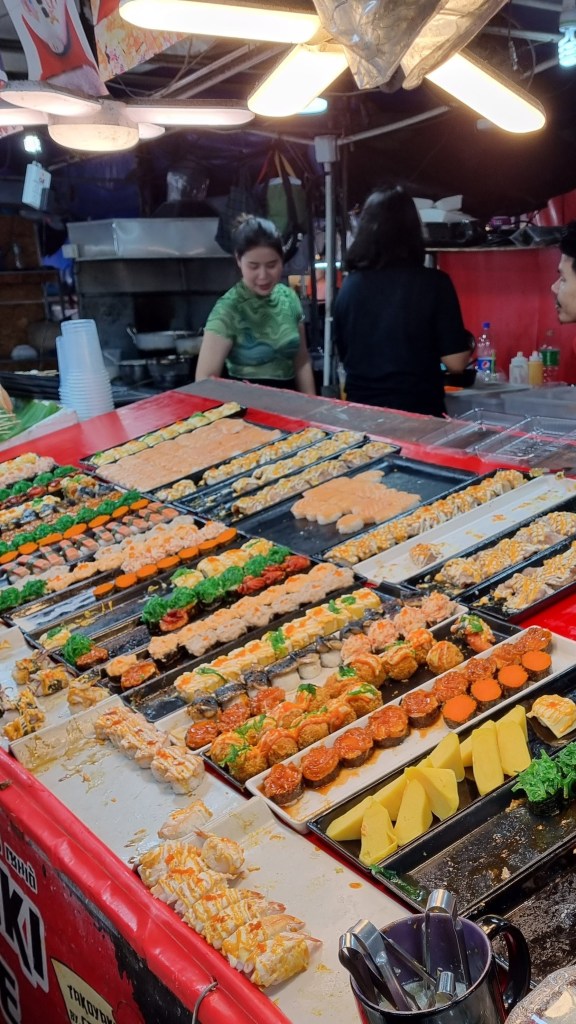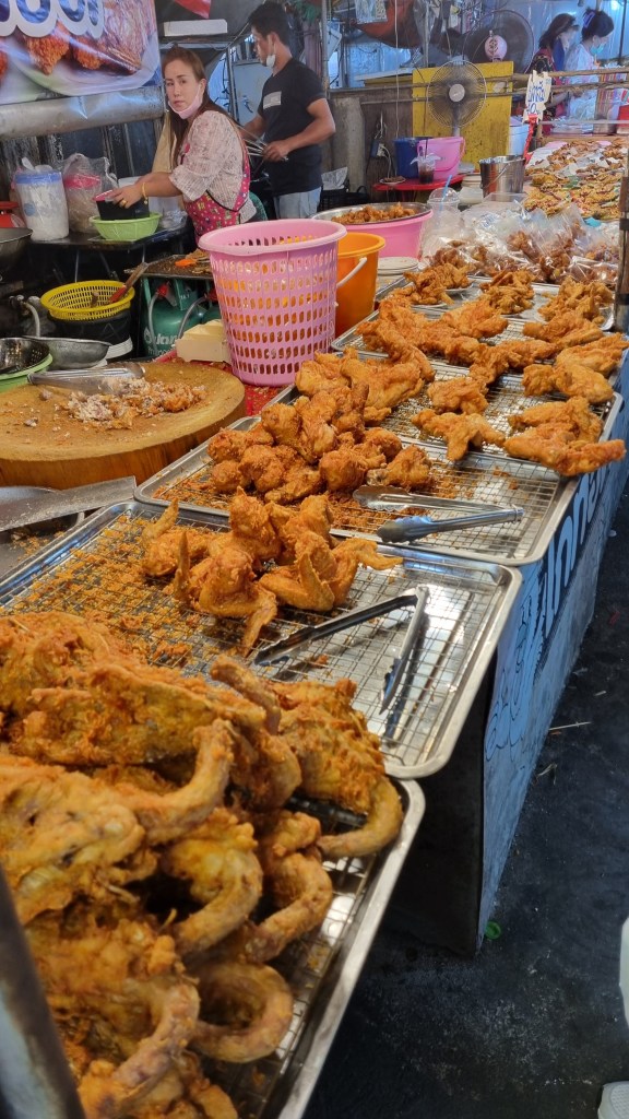 Un joli marché de nuit voit aussi les habitants de cette ville courir après les gourmandises salées ou sucrées chaque début de soirée. On y remplit les sacs de brochettes de boulettes, de saucisses pimentées, de tofu en sauce, de poissons lamellés et frits enroulées dans une feuille de riz. On salive devant des crêpes roulées dans un sirop sucré, face à des fruits frais coupés dans des sachets, ou des cakes miniatures qui ne révéleront pas leurs ingrédients avant d’y avoir goûté. Lorsque les filets sont remplis pour tenir la soirée, on s’installe suants à proximité d’un barbecue qui torture des poivrons et quelques morceaux de foie. Un tabouret, un tonneau en métal et puis un grand verre de glace pilée noyée dans un mélange de café et de lait concentré sucré repoussent un instant le moment du départ. On observe les thaïlandais le nez tourné vers les stands, le regard brillant en quête d’une pêche miraculeuse. Les gens gourmands sont souvent très beaux à contempler car à la différence d’autres qui ne font que se nourrir, ceux-là ont l’œil qui frise inéluctablement quand ils observent consciencieusement une brochette crépiter sur un brasero. Et cet enthousiasme à l’égard d’une activité du quotidien pourtant impitoyablement banale est très communicatif.