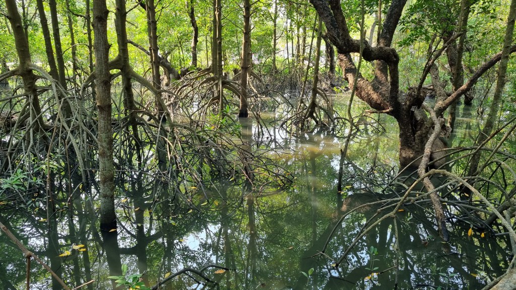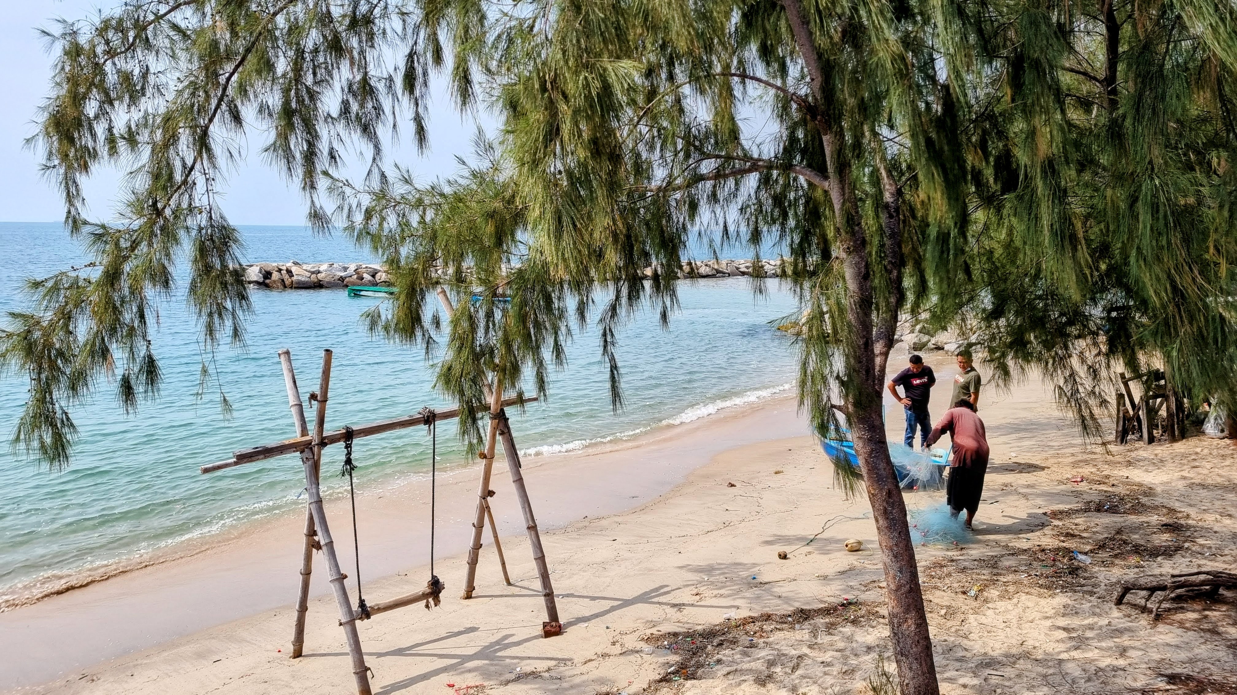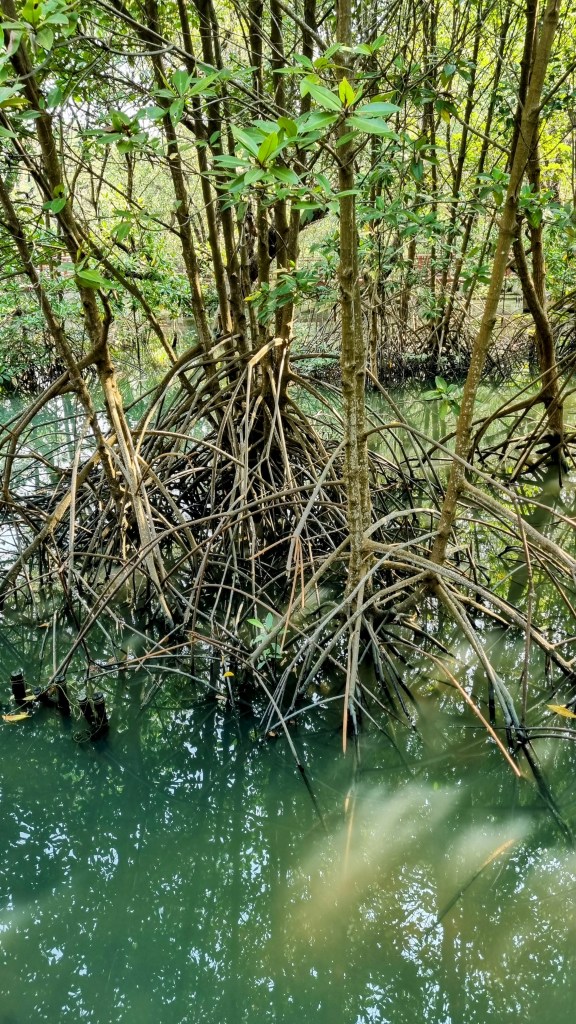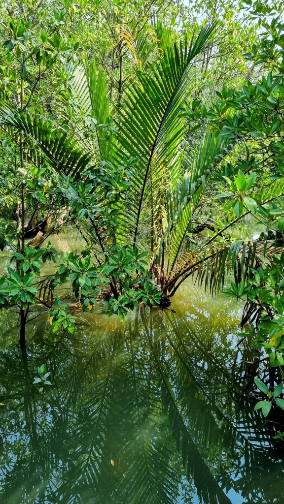 La mangrove longe la côte en arrière plan. Un réseau de pontons en permet l’accès et se faufile au-dessus de l’eau saumâtre. Sur quelques kilomètres de planches en bois, on s’évade au milieu des palétuviers aux racines arquées comme de fines pattes d’araignées. Des poissons y trouvent refuges en nombre, des crabes, des oiseaux et l’on devine que cet écosystème est un miracle de la nature, une concentration de vie naviguant entre mer et terre, aujourd’hui souvent menacée par la pression humaine. Le matin, à l’abri du soleil qui menace déjà, on parcoure les pontons seuls en compagnie des crabes et de quelques aigrettes blanches. Ensuite, on file plus loin se baigner dans une eau tiède et claire.