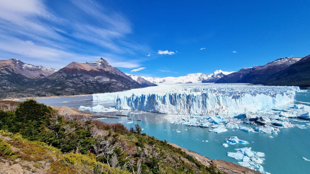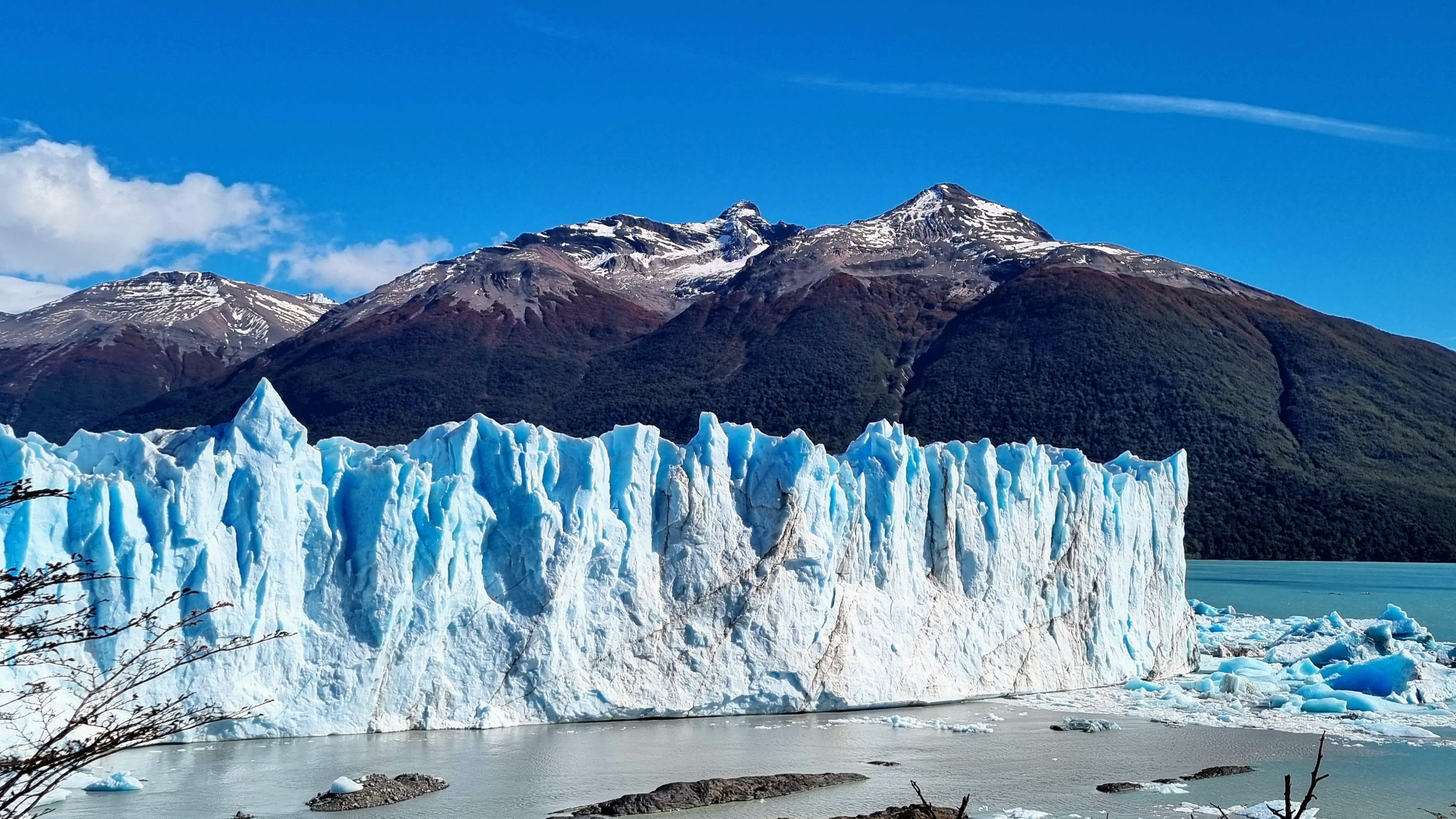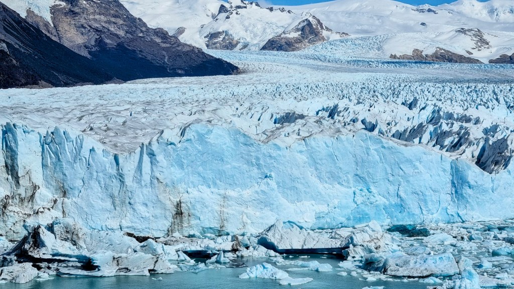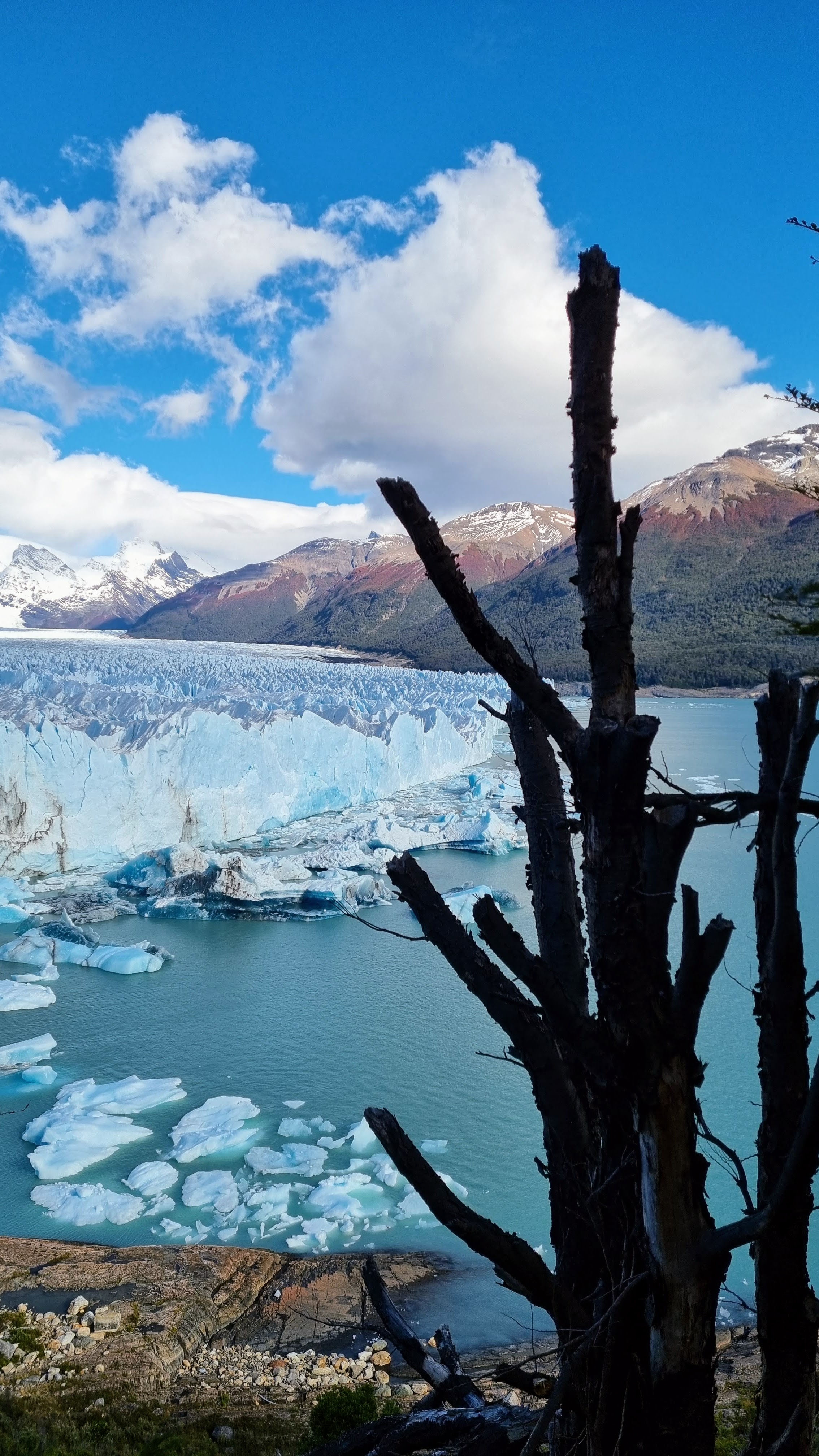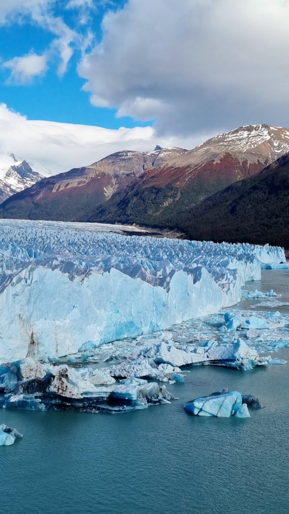 Géant de glace qui pourtant semble si fragile, ciselé comme un verre de bohème aux parois de porcelaine immenses et fissurées dont on sait le temps compté, c’est un massif lapis-lazuli aux épingles acérées poussées par d’autres derrière jusqu’au lac Argentino. On l’entend s’étirer, craquer et parfois s’effondrer dans un fracas du diable. Un morceau de marbre s’enfonce lentement dans l’eau laiteuse, semant remous et affolement sur l’onde, puis le glaçon réapparaît, émerge de la surface comme une pierre précieuse aux reflets bleutés, lavé de toute la poussière accumulée sur trente kilomètres de descente interminable depuis les sommets andins. Et c’est ce mouvement qui rend le spectacle émouvant.