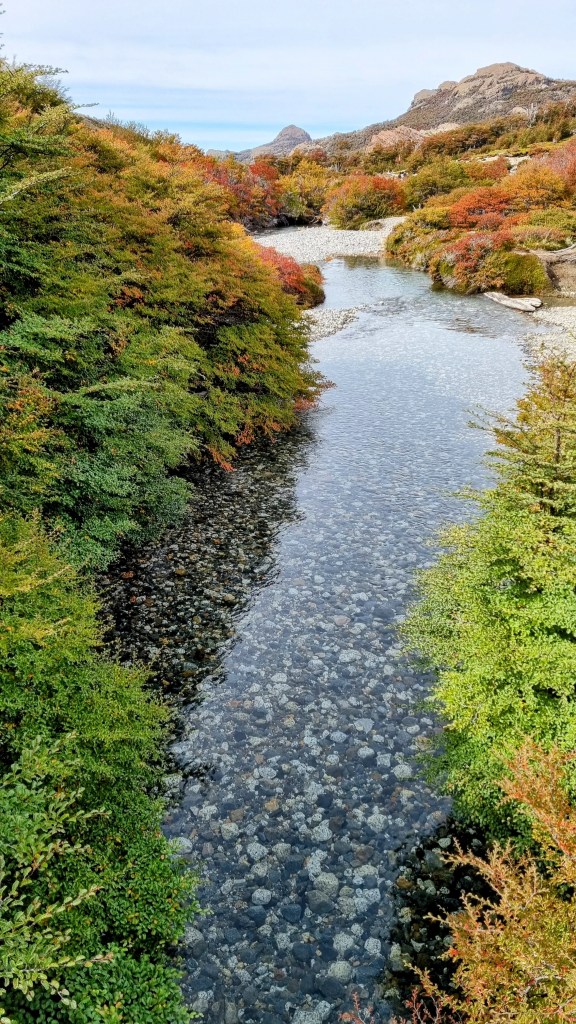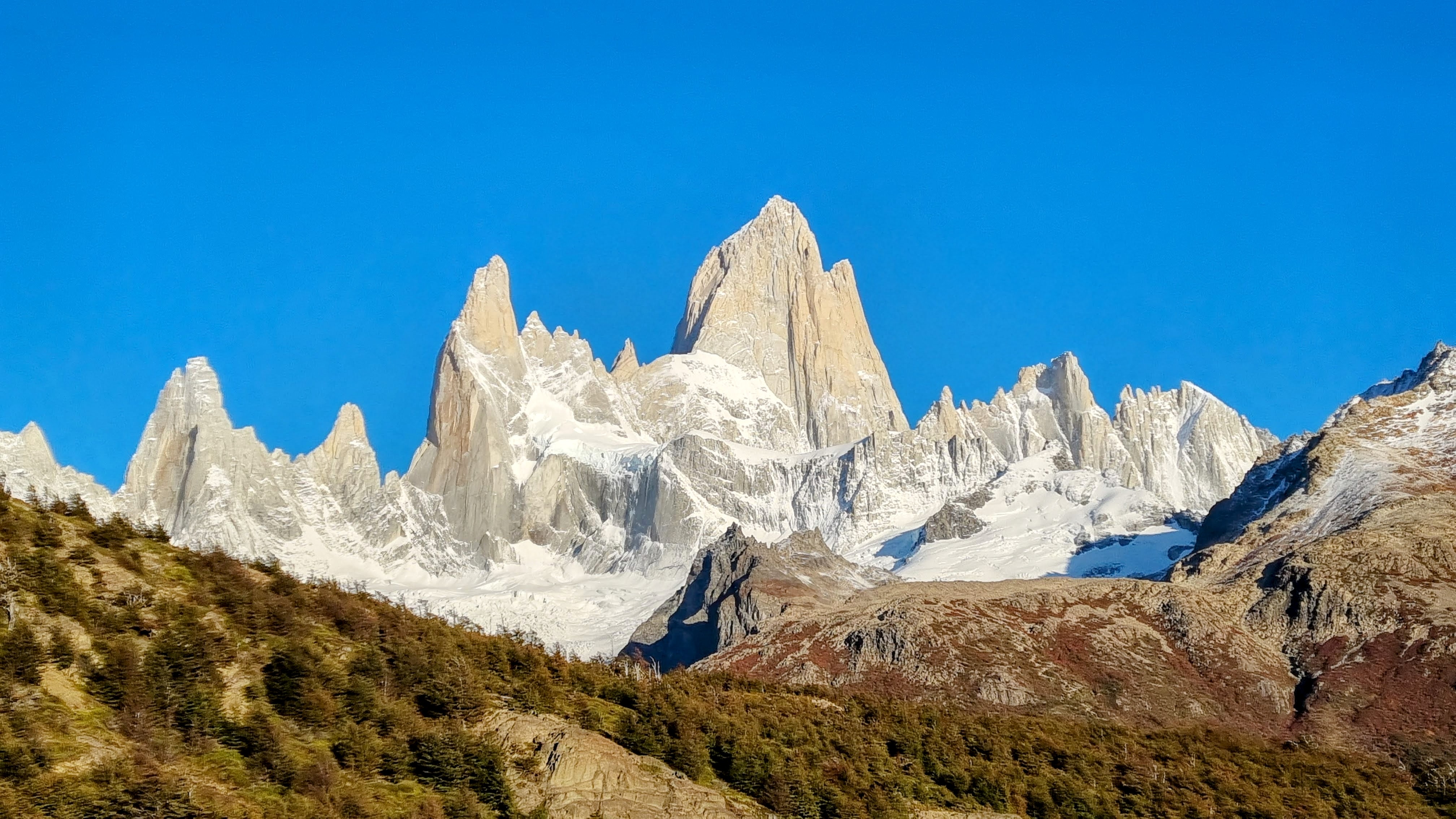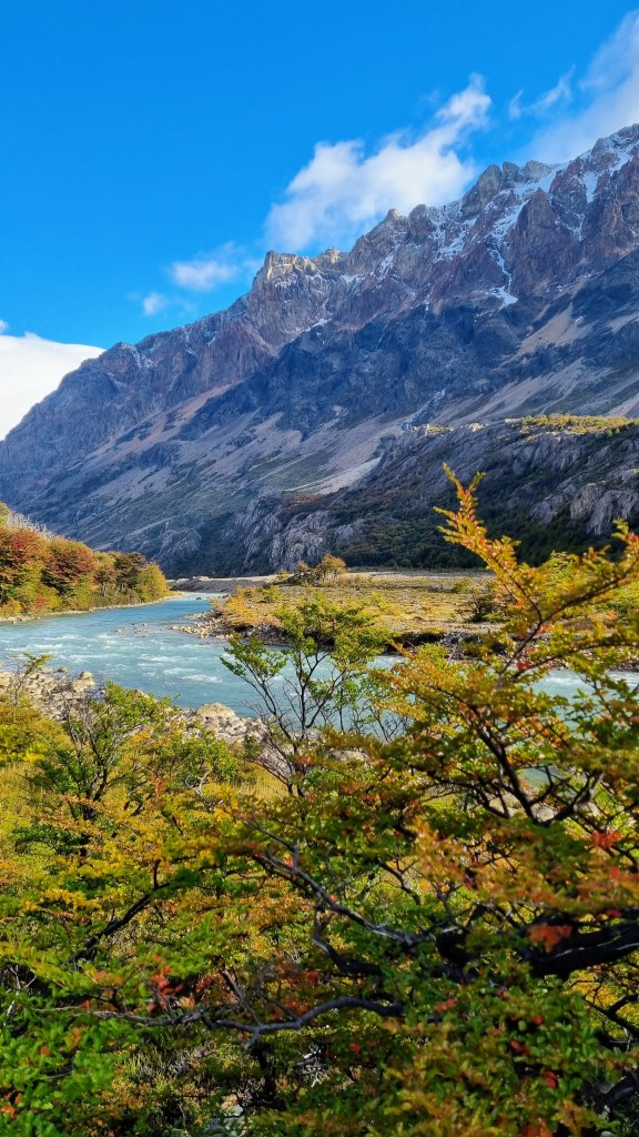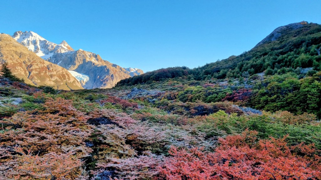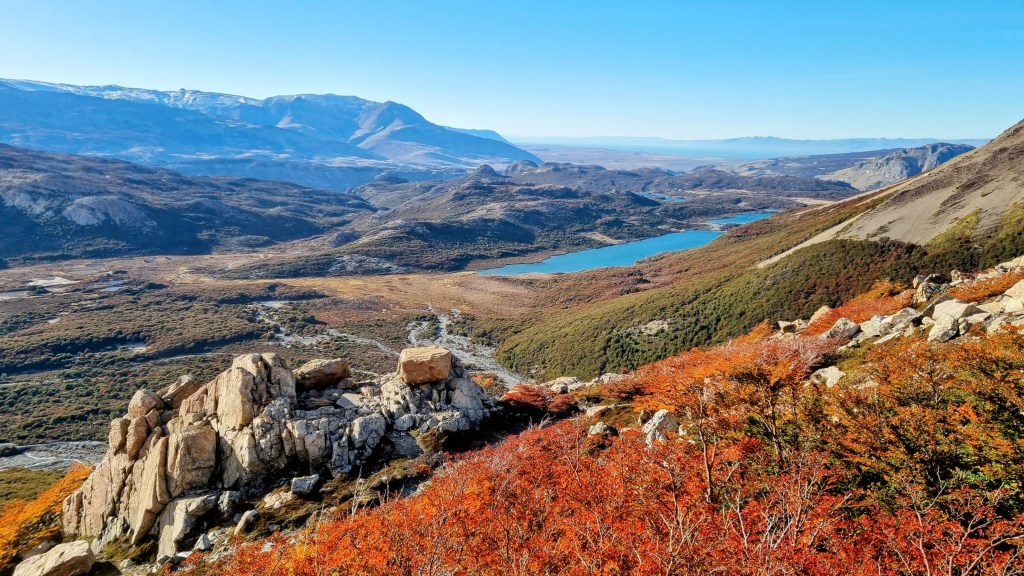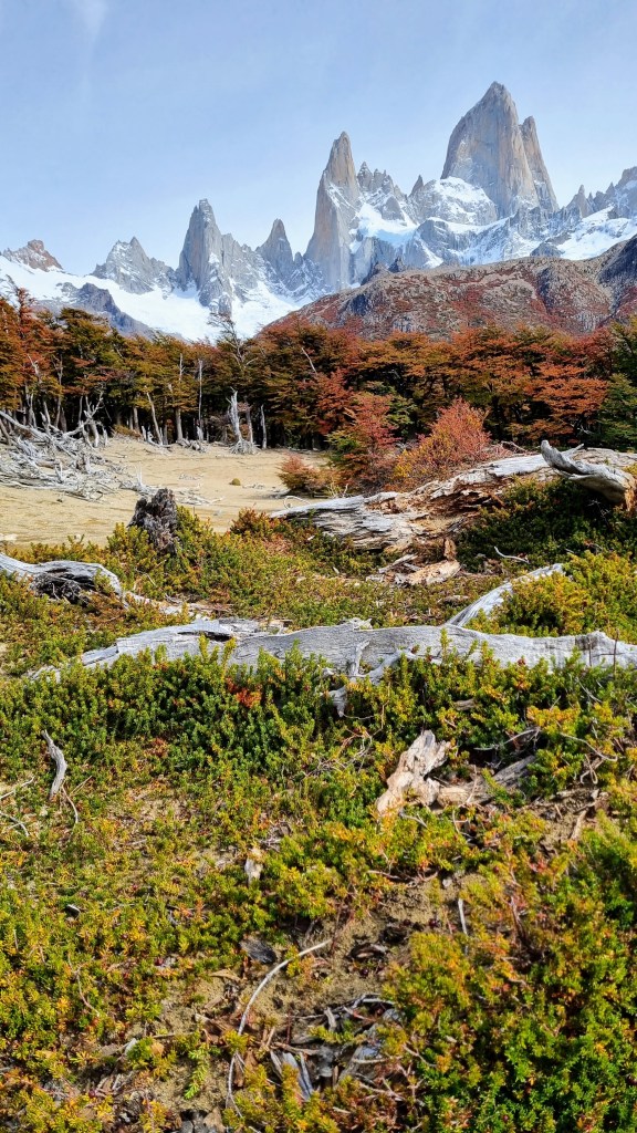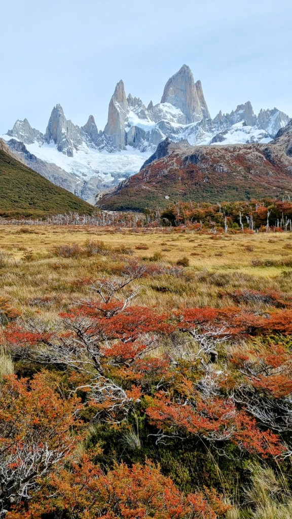 Et puis autour, comme une armée figée à la revue, d’autres soldats verticaux, un peu moins gradés, font front uni face au monde horizontal des terriens. Au pied du massif un lac bleu d’altitude clôt un panorama qui ne tolère aucune retouche. Plus bas la plaine est à cette époque une démonstration de couleurs. Les ocres rouges palpitants, les jaunes aux accents de blés mûrs, toute une récente palette automnale taquine une végétation qui jusqu’alors affichait un vert triomphant, et enflamme désormais la plaine d’El Chalten.