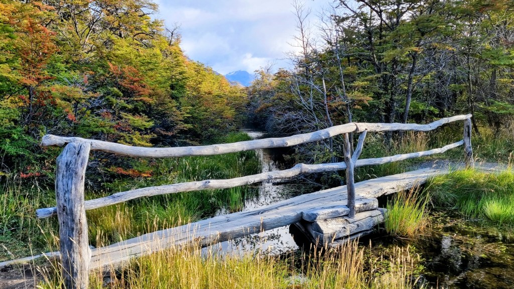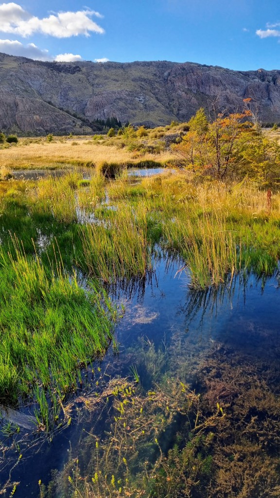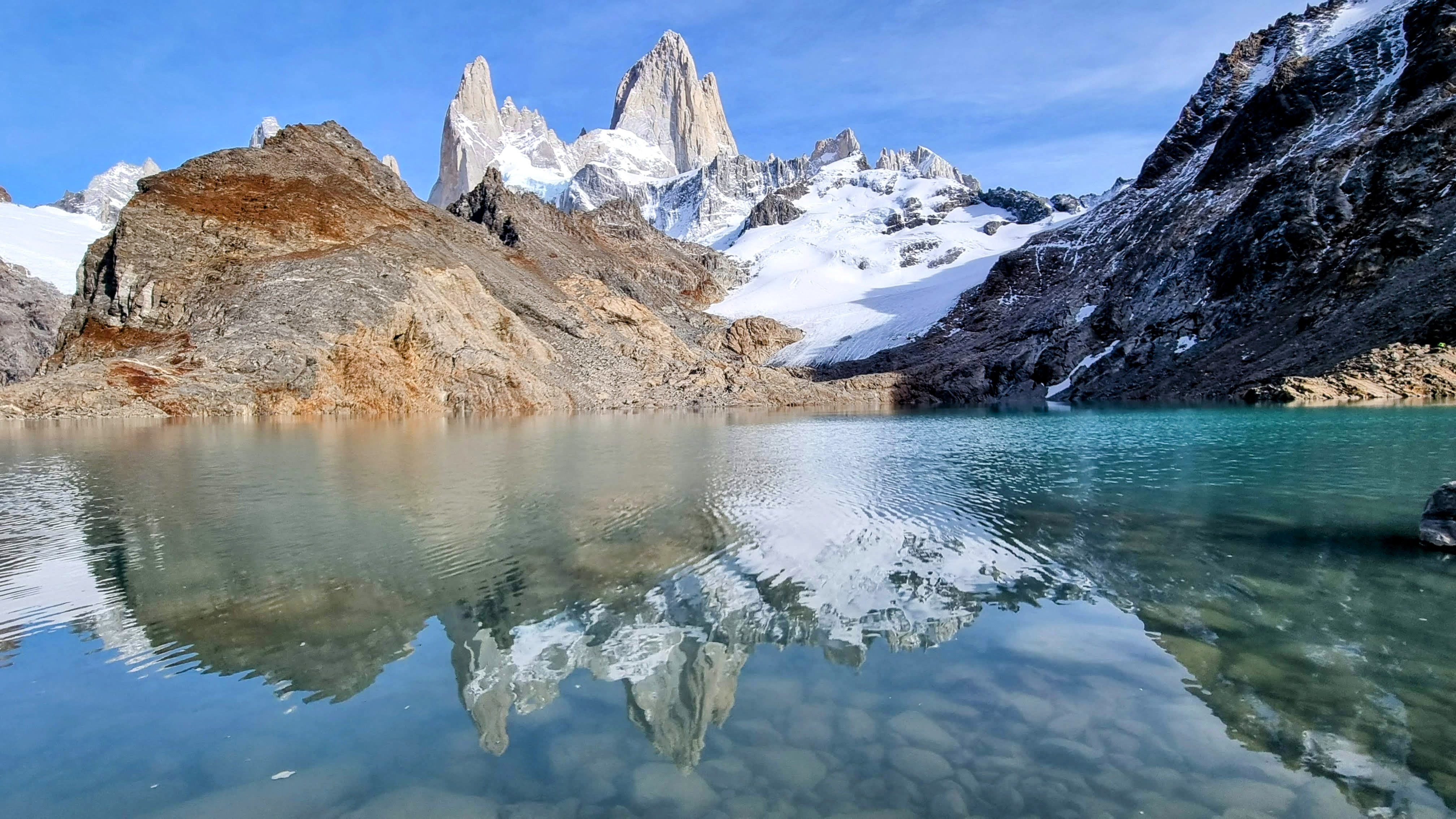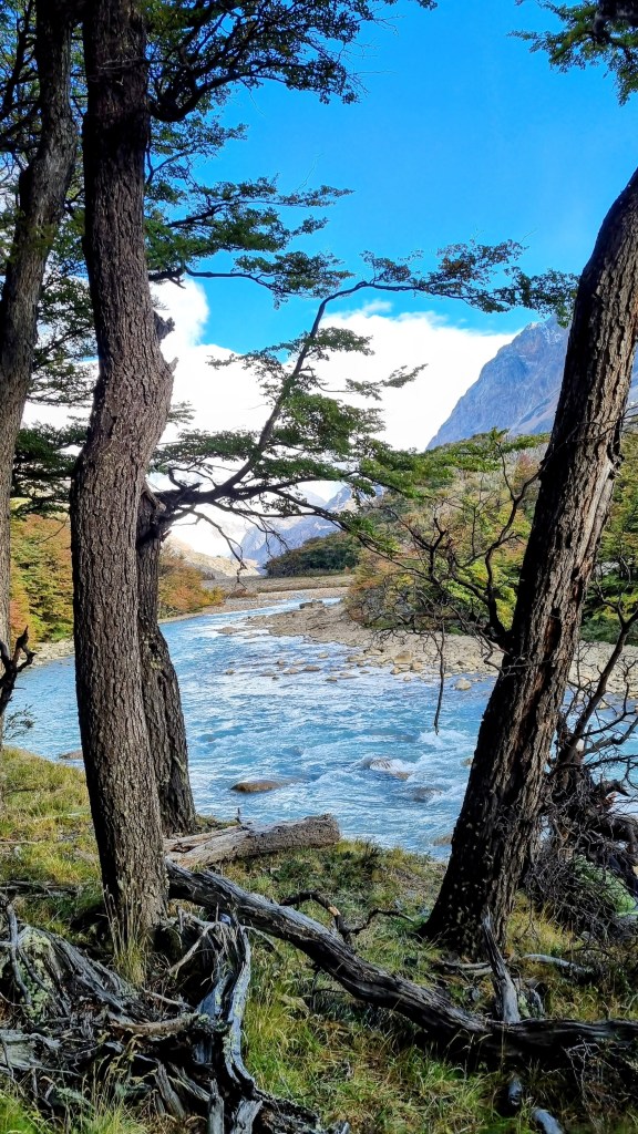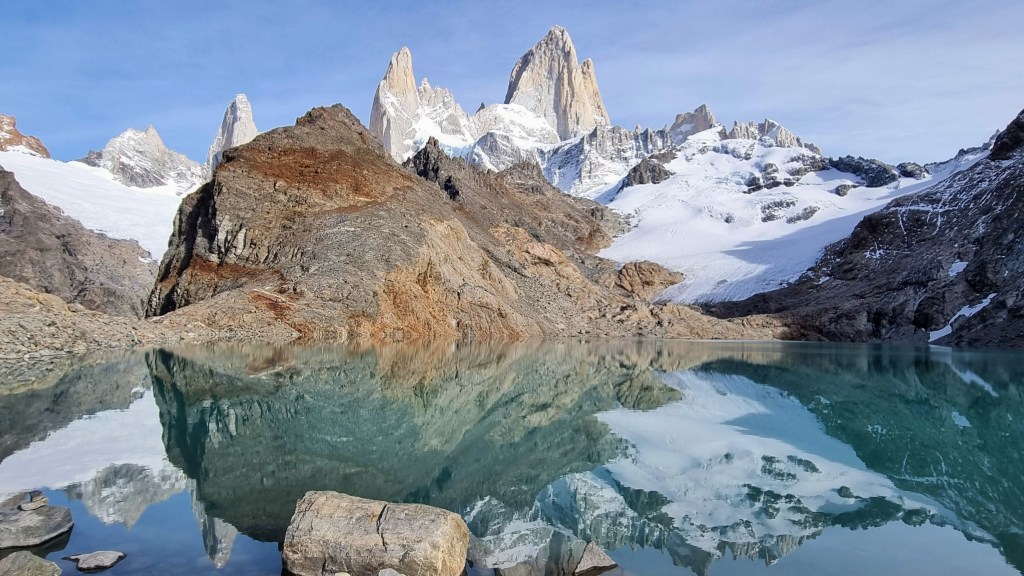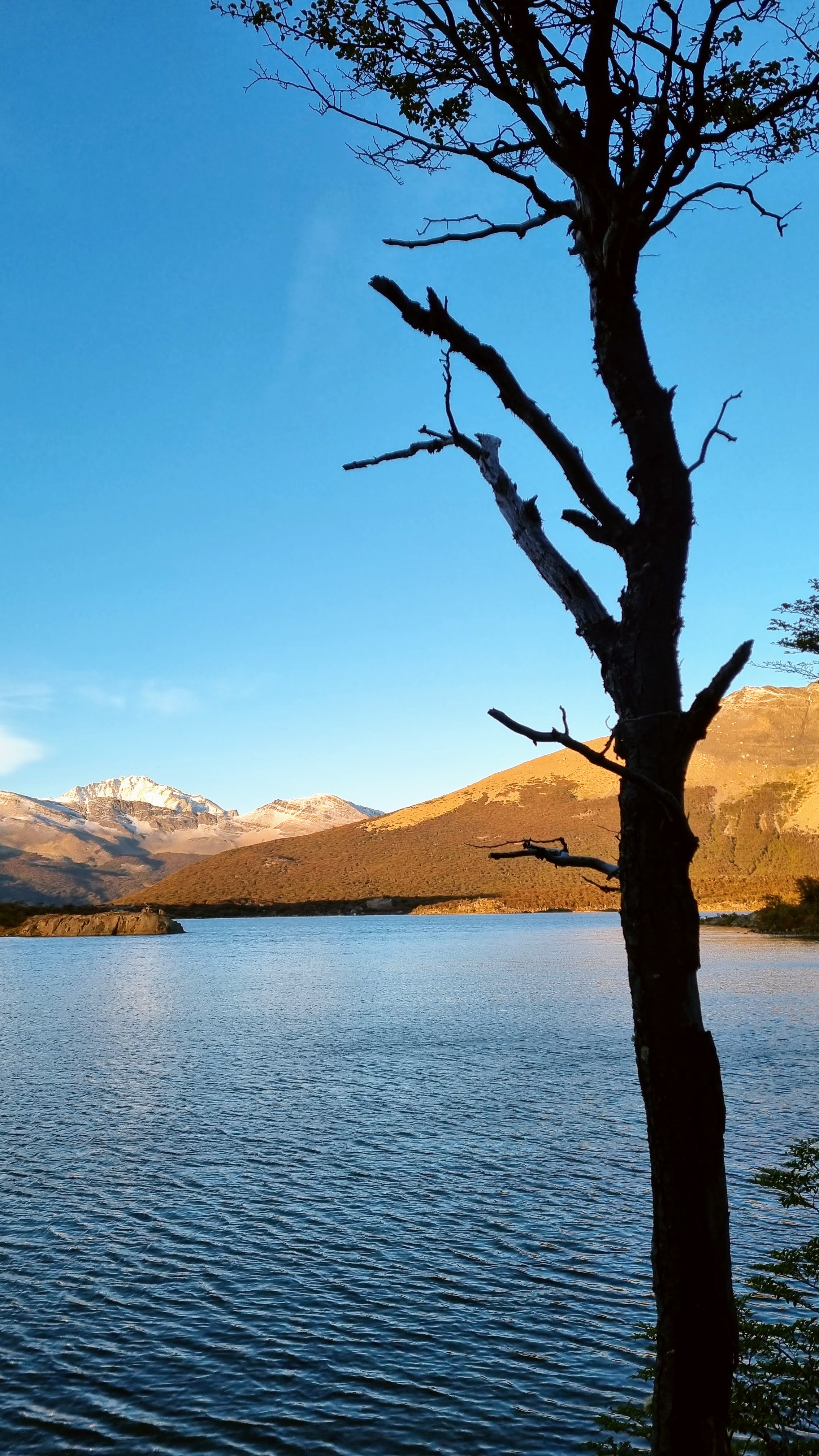 Et puis autour, comme une armée figée à la revue, d’autres soldats verticaux, un peu moins gradés, font front uni face au monde horizontal des terriens. Au pied du massif un lac bleu d’altitude clôt un panorama qui ne tolère aucune retouche. Plus bas la plaine est à cette époque une démonstration de couleurs. Les ocres rouges palpitants, les jaunes aux accents de blés mûrs, toute une récente palette automnale taquine une végétation qui jusqu’alors affichait un vert triomphant, et enflamme désormais la plaine d’El Chalten.