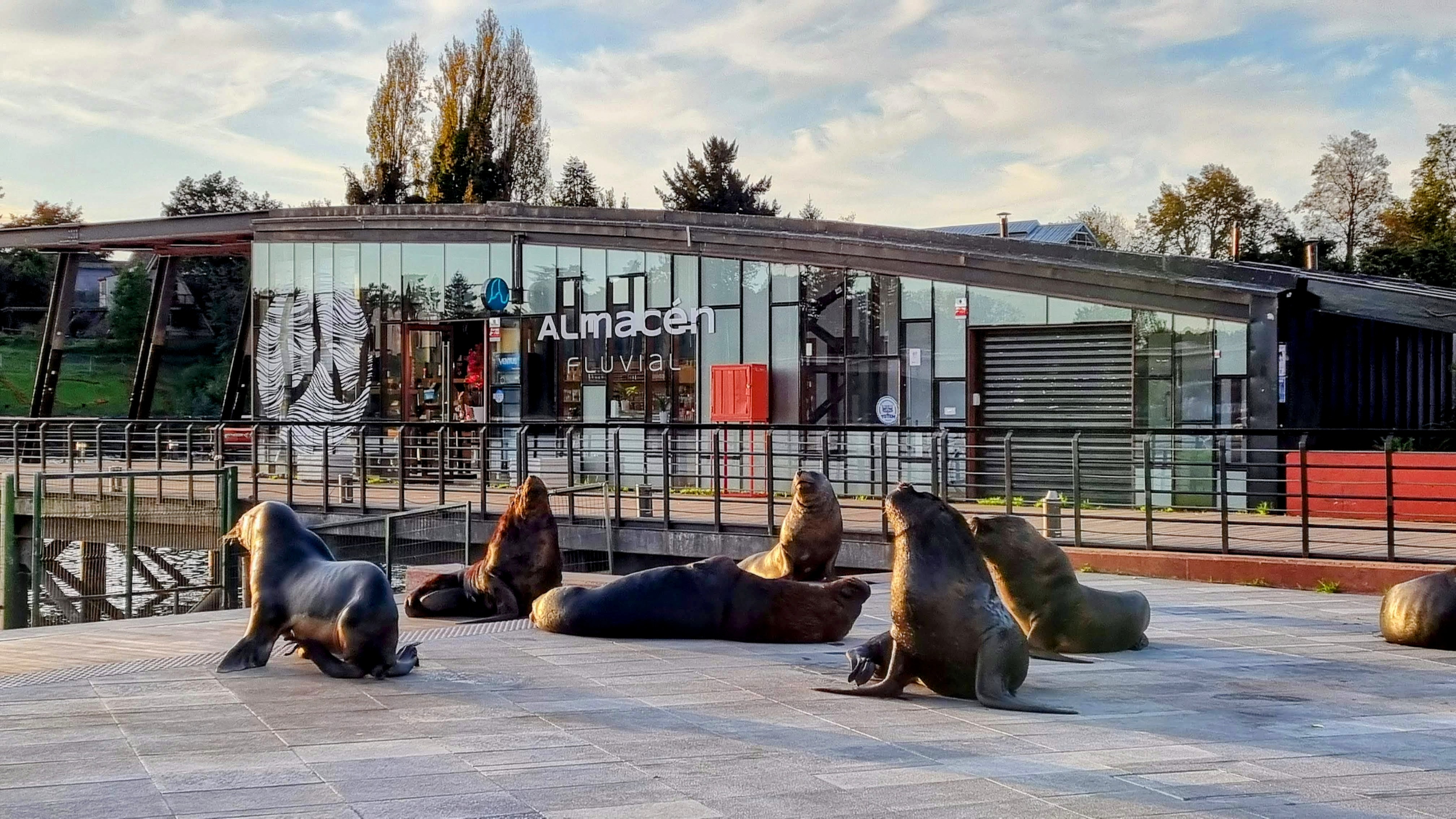 Un dernier rayon fait apparaitre à la surface d’une peau sombre des cicatrices roses et blanches, souvenirs visibles de vieilles batailles navales redoutables. Nous avons régulièrement rencontré ces animaux depuis la Terre de Feu sur la route maritime australe, mais les côtoyer à quelques ridicules mètres de distance, installés sur un même trottoir de béton qu’eux, rend ces géants marins soudainement familiers. On s’amuse ce soir de ce constat de voisinage. Nous étions déjà venus les saluer le matin au marché sur les quais lorsque comme nous, ils venaient faire la queue à la poissonnerie tandis que nous remplissions notre cabas de légumes au stand d’à côté. Et à cette heure de miel, animaux et badauds réunis sur une même berge, gardons les yeux mi-clos, le visage tiède tendu vers le ciel afin de profiter ensemble d’un dernier instant de soleil en cette fin d’après-midi à Valdivia.