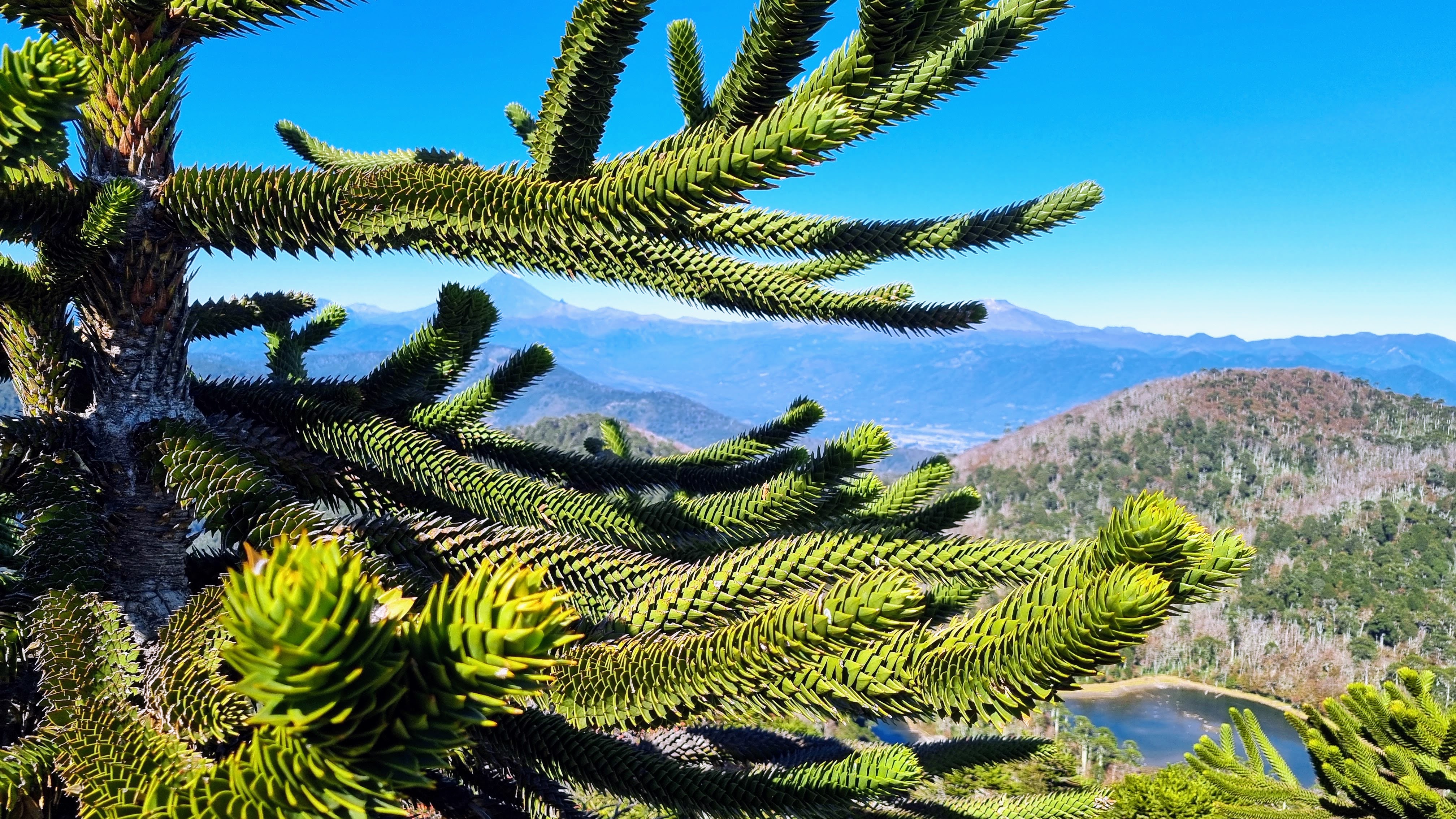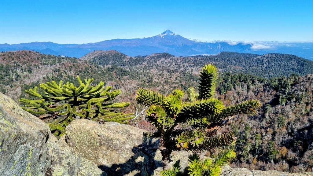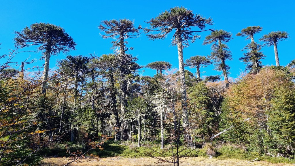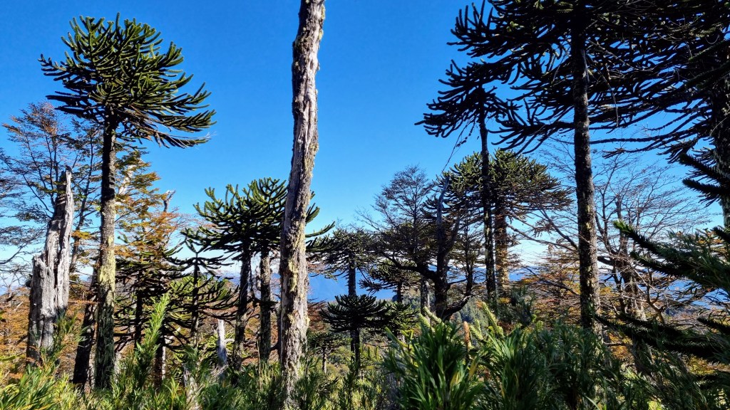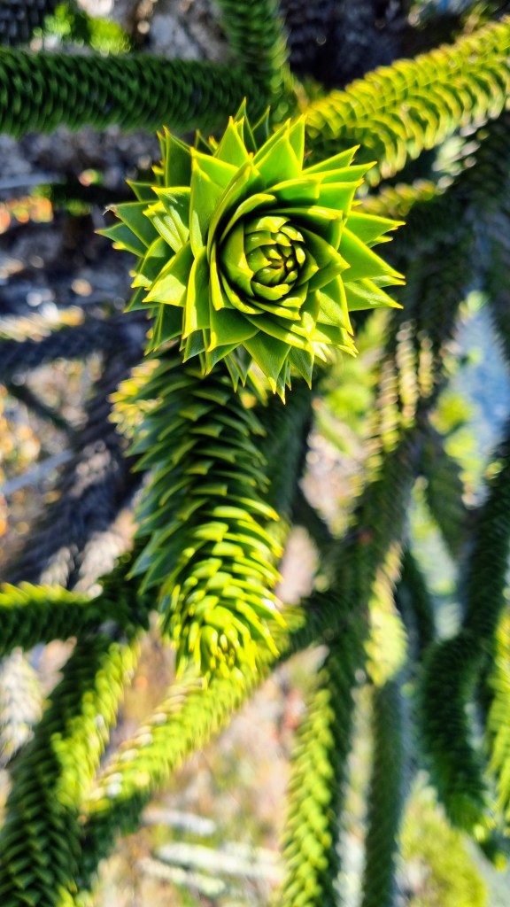 Et puis il y a l’Araucaria. C’est le nom d’un arbre presque sans âge, qui hante de ses bras étranges, les reliefs de la région des lacs. C’est un drôle de pin qui pourrait s’être évadé de la préhistoire. C’est un regard austère de trente mètres de haut, aux branches lourdes parées d’une armure d’écailles, capable de vivre jusqu’à deux mille ans entre les soubresauts de la terre et le vent de la mer.