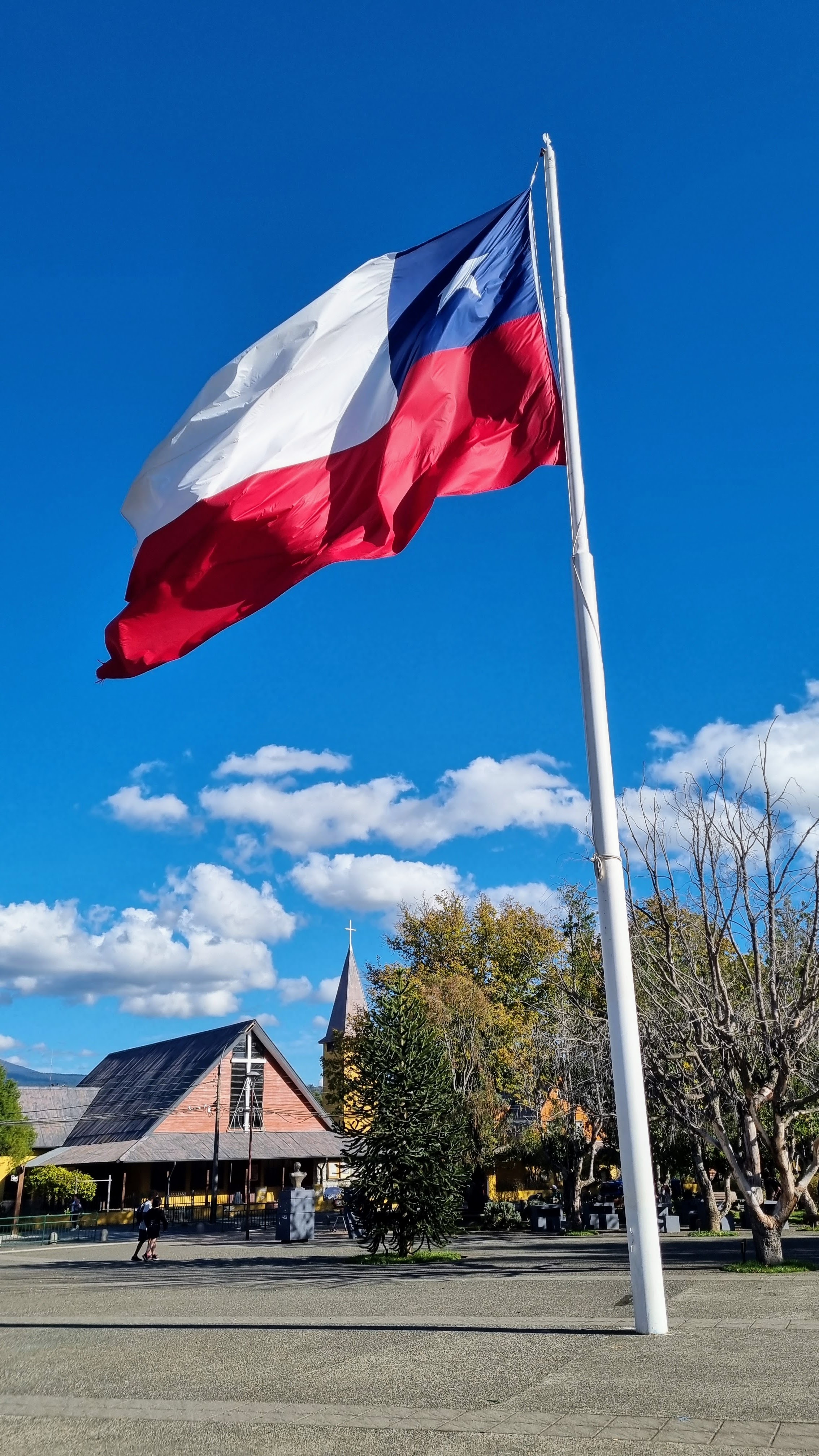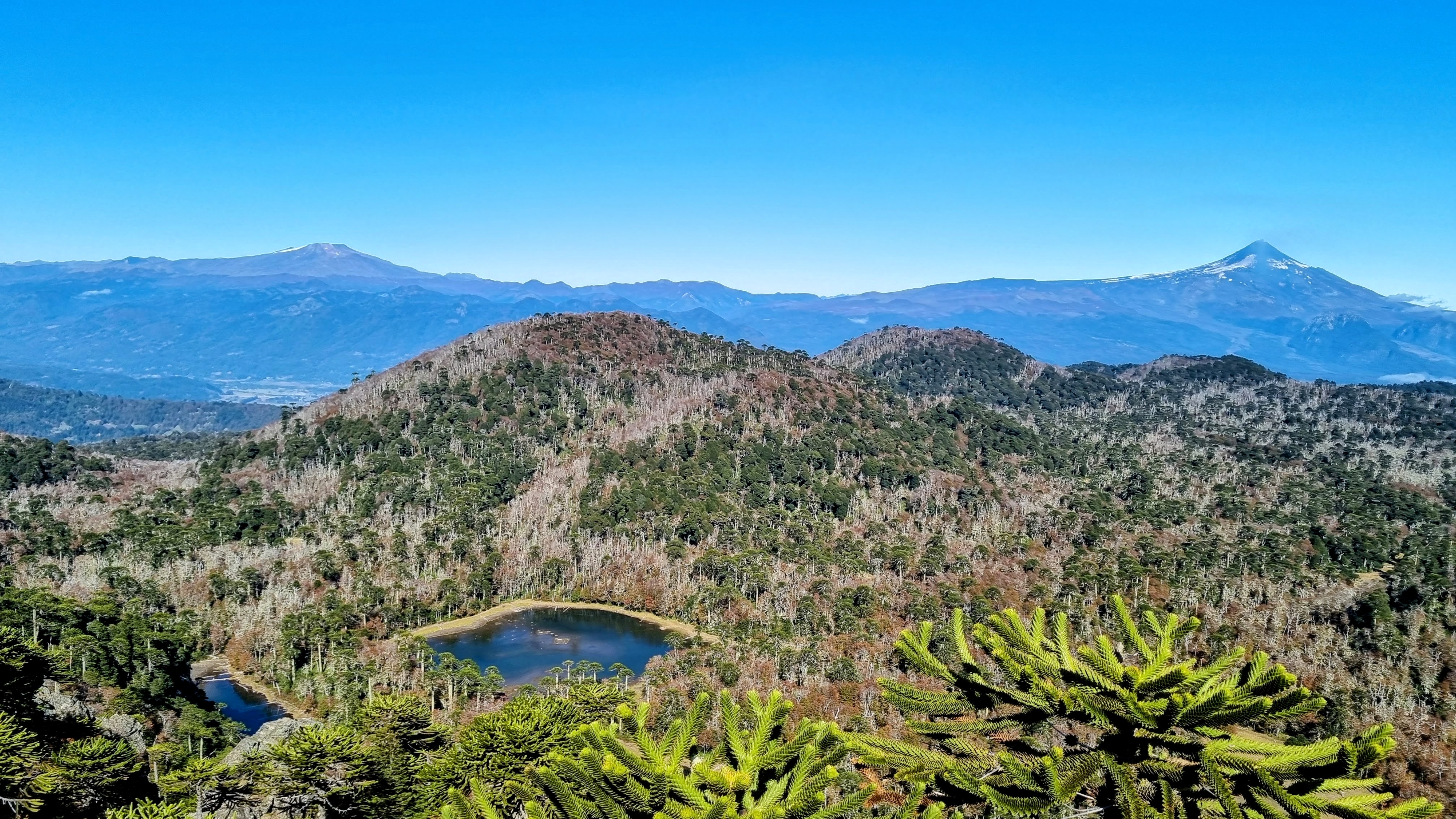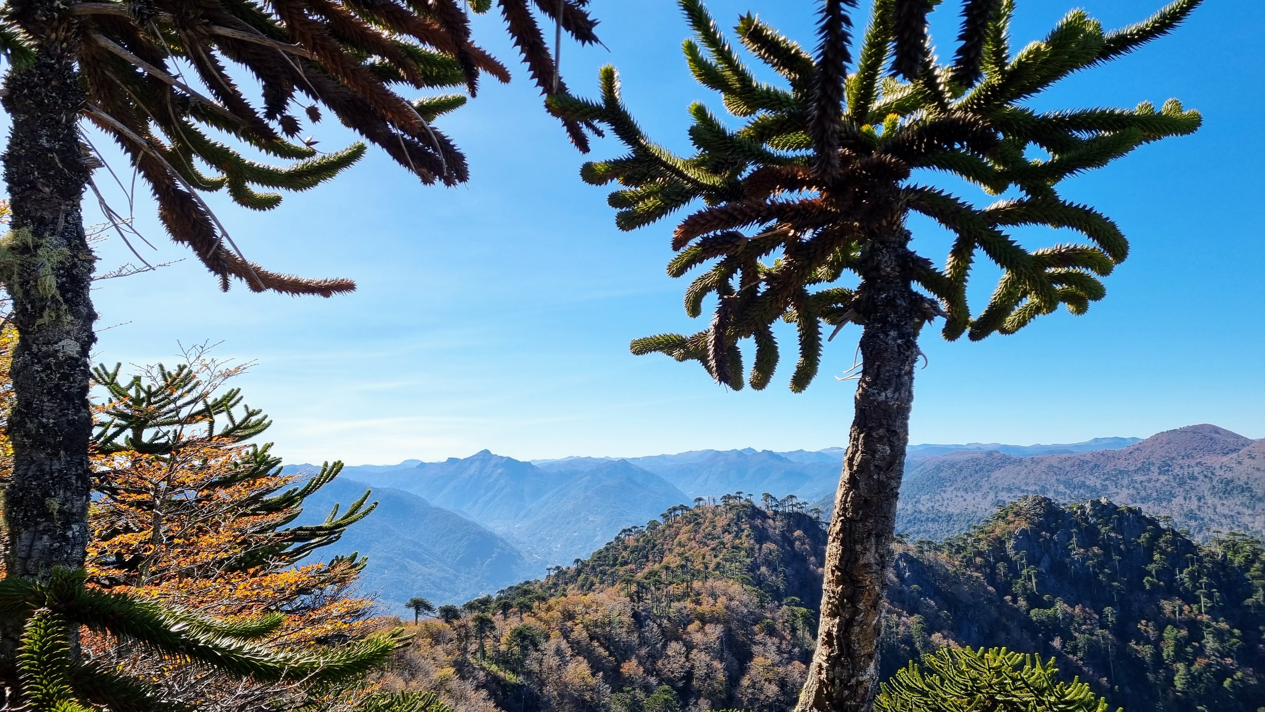 Et puis il y a l’Araucaria. C’est le nom d’un arbre presque sans âge, qui hante de ses bras étranges, les reliefs de la région des lacs. C’est un drôle de pin qui pourrait s’être évadé de la préhistoire. C’est un regard austère de trente mètres de haut, aux branches lourdes parées d’une armure d’écailles, capable de vivre jusqu’à deux mille ans entre les soubresauts de la terre et le vent de la mer.