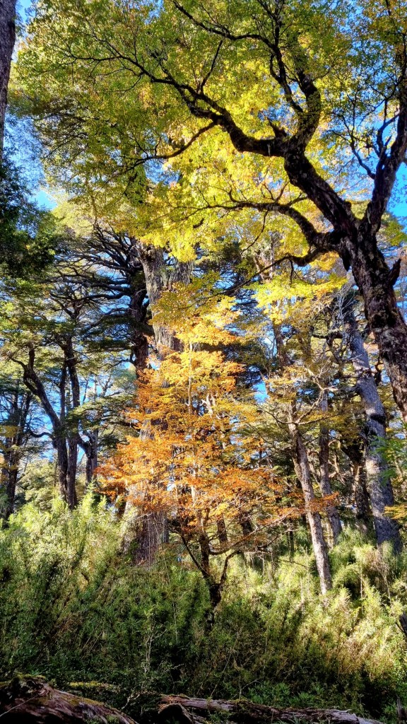 Ces forêts sont une cathédrale de lumière où le ciel est étayé par des araucanias et des coigües d’une majesté absolue. Rien, ni la folie des hommes ni leur génie à créer de temps à autre un peu de beauté ne pourront jamais supplanter la splendeur inouïe de cette nature. Nous nous taisions, heureux condamnés, réduits à marcher le nez en l’air dans cette galerie sylvestre des beaux arts, tâchant cette fois, de rester à notre place en nous efforçant de ne rien abimer.