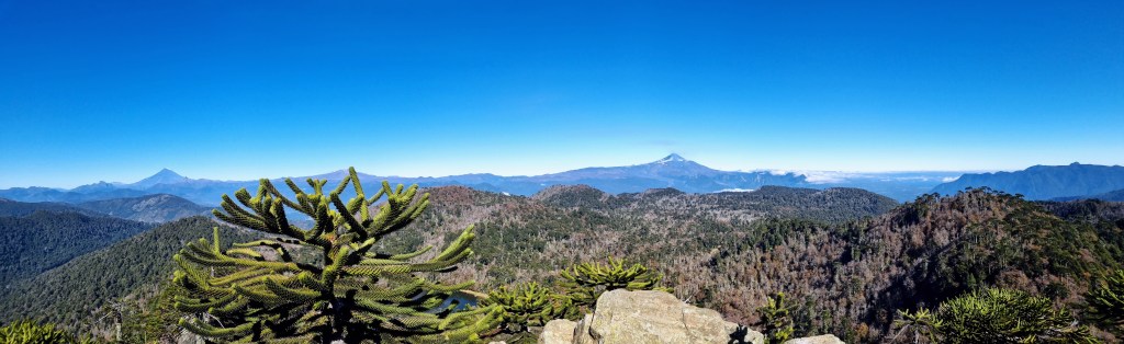 Il faut encore grimper par un sentier en zigzag pour atteindre le sommet de la montagne. De là on peut enfin se saouler d’un paysage volcanique ineffable. Par delà les forêts et les pentes minérales, les volcans sont un spectacle des plus réjouissants. L’un à la cime affutée retient encore quelques neiges éternelles, et attend que l’hiver proche lui fasse don d’un immaculé manteau neuf. Le second est une table au sommet arasé et pourrait aisément se faire éclipser par la jeunesse de ses confrères. Et puis il y a le Villarrica, un panache de fumée s’étirant haut vers le ciel annonce qu’ici plus qu’ailleurs la terre est vivante et régit le monde.