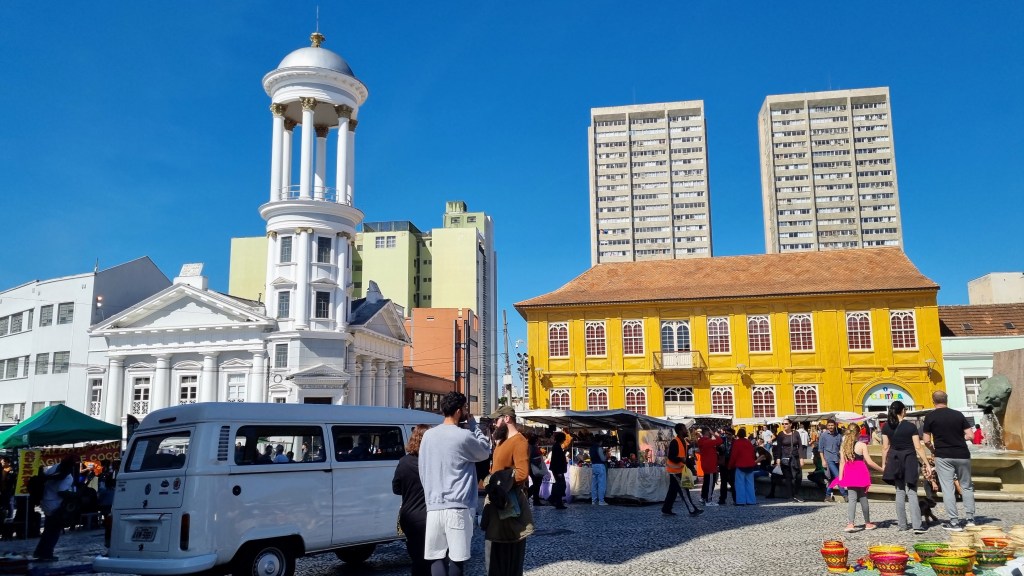 Curitiba est une ville qui a certes freiné un développement trop important au regard de monstres tentaculaires comme Sao Paolo ou Rio de Janeiro mais elle reste en son centre un brin anarchique. Au patrimoine colonial, maisons basses colorées, places arborées autour d’une fontaine et trottoirs lusitaniens tout tordus mais au charme indéniable, se sont acoquinés dans les places vides, des immeubles de verre et de béton aux allures de gratte-ciel. Cette vision désordonnée laisse pourtant le charme opéré. Un air de bossa nova sorti tout droit d’une cantine en même temps que le cliquetis des gamelles et le rythme nonchalant des passants, contribue grandement à nous mettre à l’aise. Cependant, la misère visiblement étalée sur l’asphalte des trottoirs et dans certains regards rougis, usés par trop de vie, signeront malgré tout la fin dans nos esprits de l’idée de ville modèle.