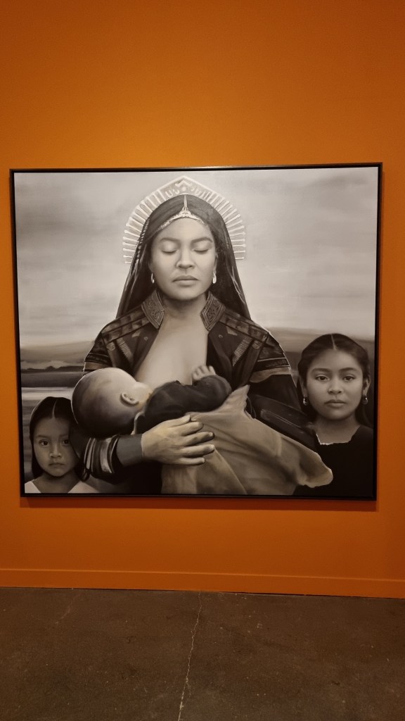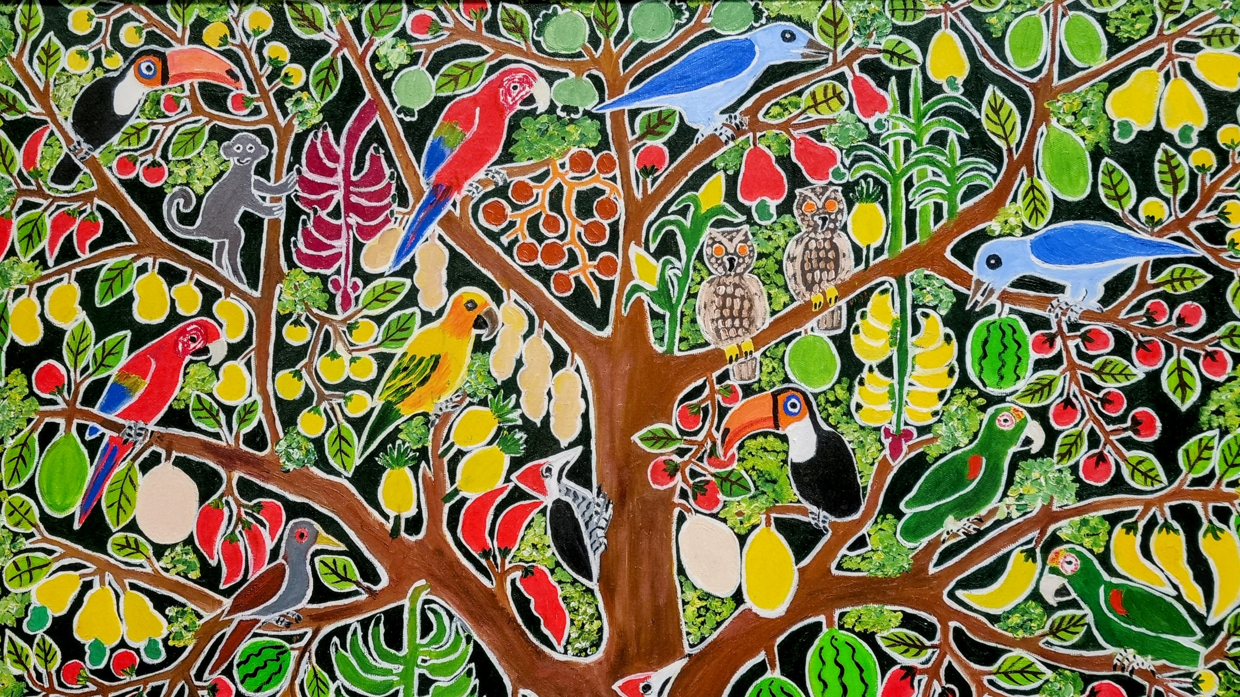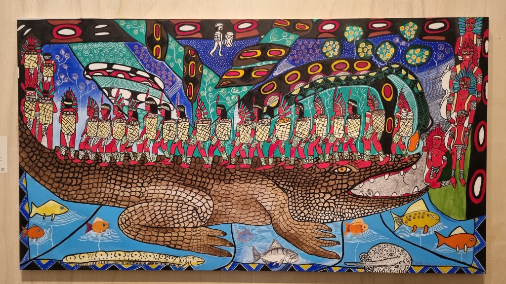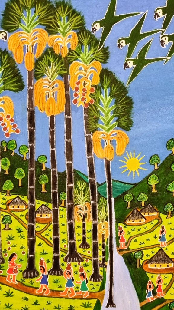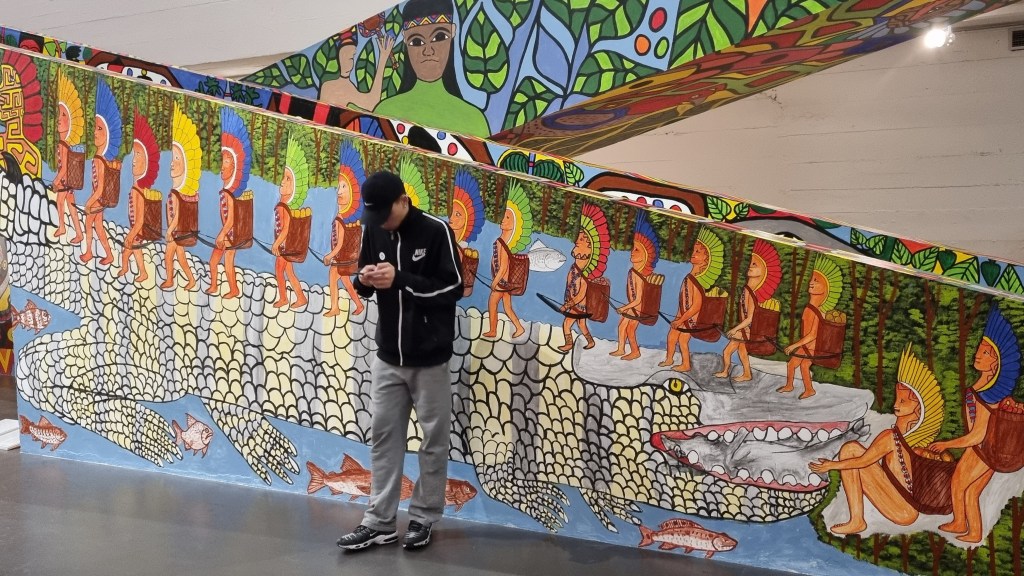 Une autre exposition livre ses murs aux peintures éblouissantes des indiens de l’Amazonie brésilienne de la région d’Acre à la frontière du Pérou. Le quotidien, les traditions et les visions des indiens y sont représentés sur de grandes œuvres aux couleurs extraordinairement chatoyantes.