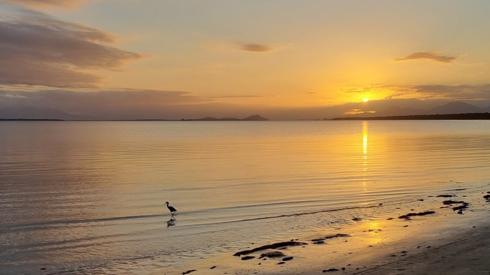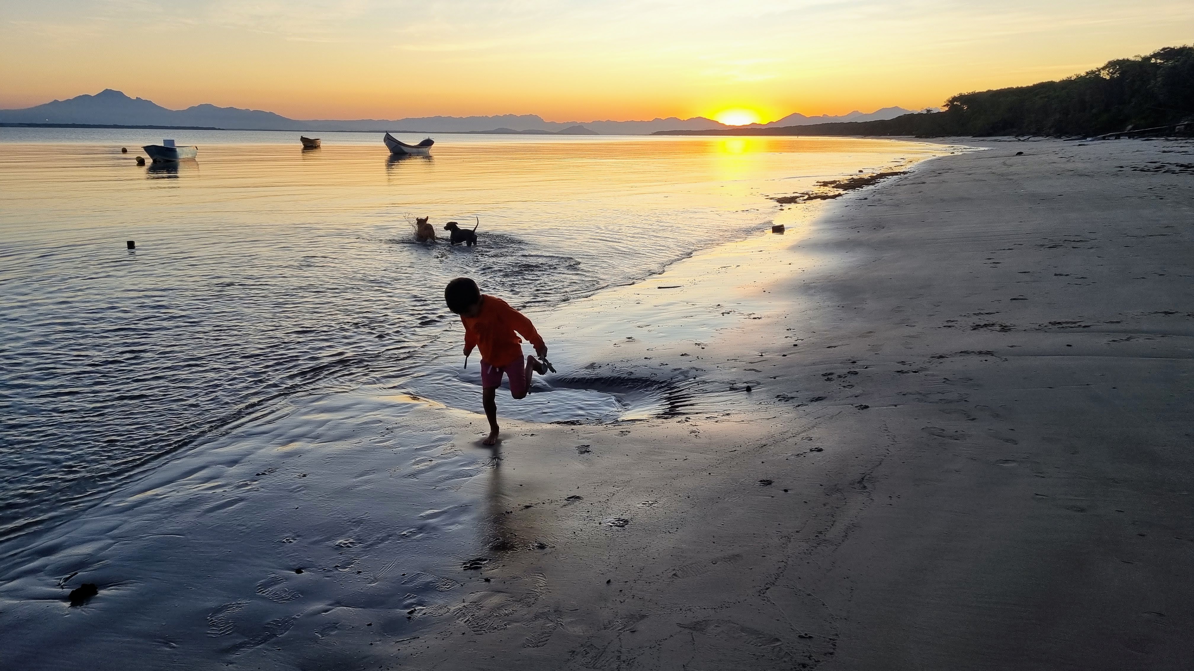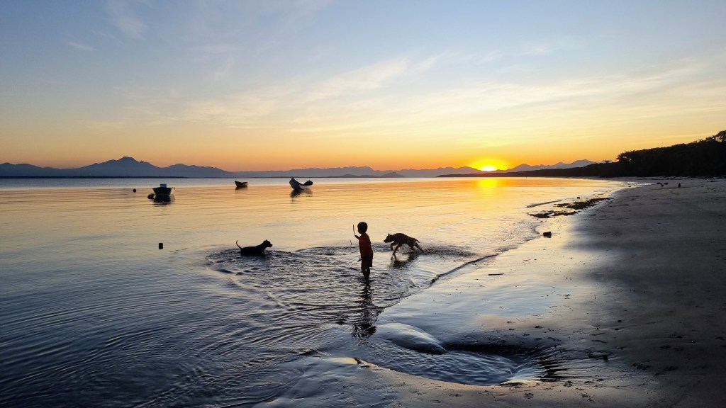 C’est difficile de décrire un paradis tropical. Pour les uns c’est une plage, un palmier, un transat, une coco percée d’une paille en guise de cocktail. Pour nous, c’est un ruban blanc entre mer et forêt que nous pouvons arpenter toute la journée, c’est un dollar des sables brillant au soleil le long du rivage, c’est une aigrette blanche posée sur deux pattes d’allumettes, gracile et élégante qui fait un bout de chemin en notre compagnie. Le paradis, c’est un enfant jouant avec des chiens qui n’appartiennent à personne dans les reflets mordorés d’un coucher de soleil sur le Brésil.
