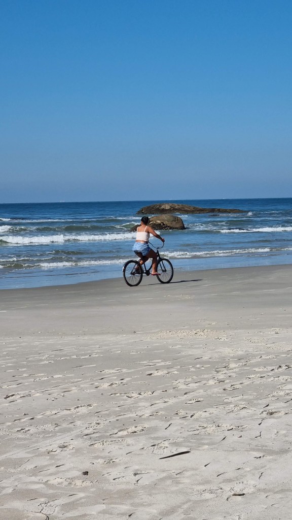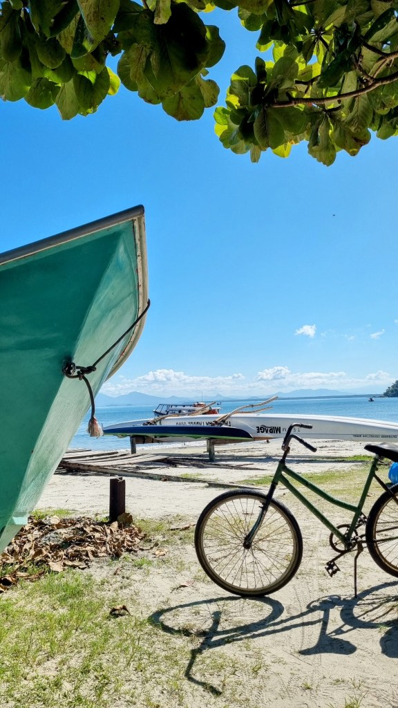 Sa colonne vertébrale est un étroit chemin en sable qui serpente au milieu de la forêt. Les véhicules se sont faits refoulés, seuls les jambes et la bicyclette y sont tolérées. Mais hormis ce sentier forestier, la principale route utilisée par les habitants demeure la plage. En fonction de l’amplitude des marées, les vastes étendues de sable qui longent le territoire permettent généralement de relier les différents points de l’île, les hameaux et les deux pontons d’embarcations. On y passe bien sûr à pied, mais on y roule également juchés sur des vélos sans frein, un râteau sur l’épaule, quelques sacs de pains ronds accrochés au guidon ou une planche de surf élimée sous le bras. Les écoliers aiment à y trainer plus longtemps qu’il ne faut au retour de l’école. On les surprend à observer une aigrette bleue prendre son envol, puis dans l’instant qui suit, faire la course avec un chien qui lui aussi glane des instants de bon temps. Toute la vie d’Ilha do mel transite inévitablement par cette autoroute balnéaire informelle.