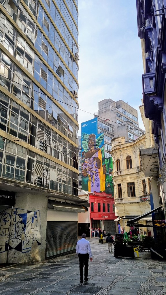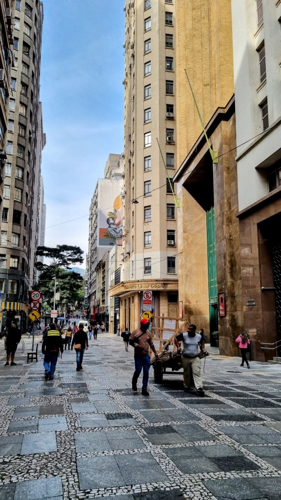Lundi matin, le centre ville piéton affiche une image nettement plus austère. Dans le métro, comme dans toutes les métropoles, on panse les maux de têtes de la veille, un casque sur les oreilles, des écrans vidéo en continu devant les yeux. Les étudiants retrouvent le chemin des facultés, les secrétaires, celui des bureaux des grandes banques du centre. Les pickpockets déjà aux affaires, ouvrent les poches de la foule des rames souterraines, palpent et dérobent discrètement un butin pris au hasard dans le secret espoir de bien commencer la journée. Le métro de Sao Paulo se vit comme ailleurs, le nez compressé contre l’épaule du voisin, comprimés involontaires, vigilants face aux tentatives malhonnêtes des rapprochements des corps.