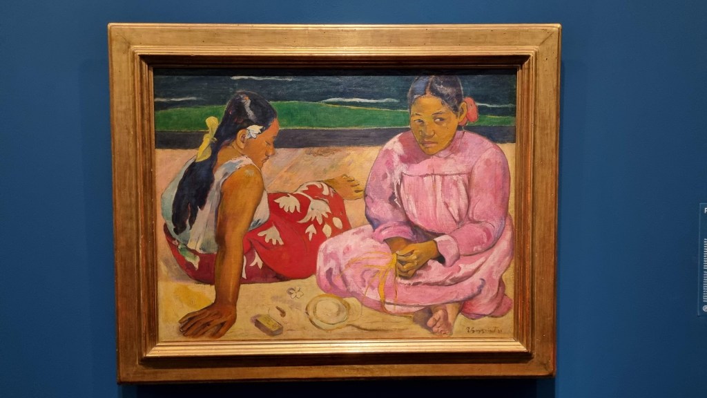 A l’intérieur plusieurs expositions temporaires s’intéressent aux « histoires autochtones ». L’une d’elle explore la thématique grâce à Gauguin lors de sa période tahitienne. On y trouve des œuvres que l’on ne connaissait pas pour la plupart. On débusque, amusés, une dédicace de l’artiste à Mme Gloanec, la patronne de la célèbre pension de Pont-Aven qui hébergeait ces aventuriers de la création venu s’émerveiller d’un monde breton alors tout aussi exotique que les Marquises du bout du monde. D’Hiva Oa, encerclé par les eaux du Pacifique, à la chapelle de Tremalo, isolée sur les hauteurs de l’Aven, on voyage, rêveurs, embarqués par une « Pastorale tahitienne » idéale. Depuis Sao Paulo au Brésil, on prend tous les Finistères qui passent sous les yeux.