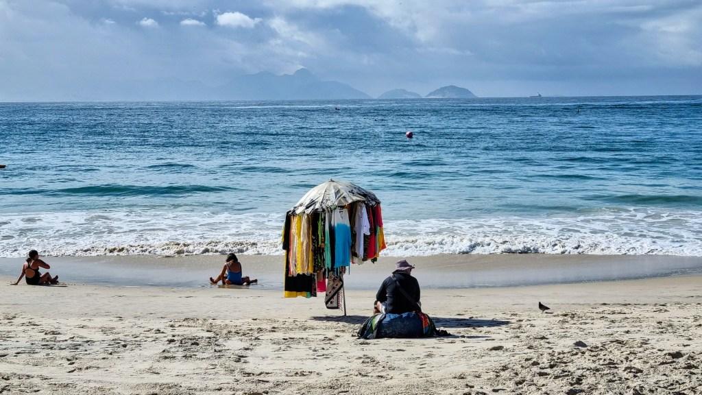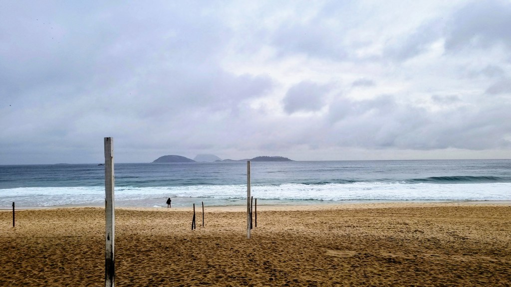 Plage de Copacabana, 13h00, nous regardons, mouillés, des gouttes en pagaille s’écraser piteusement sur un sable désert.