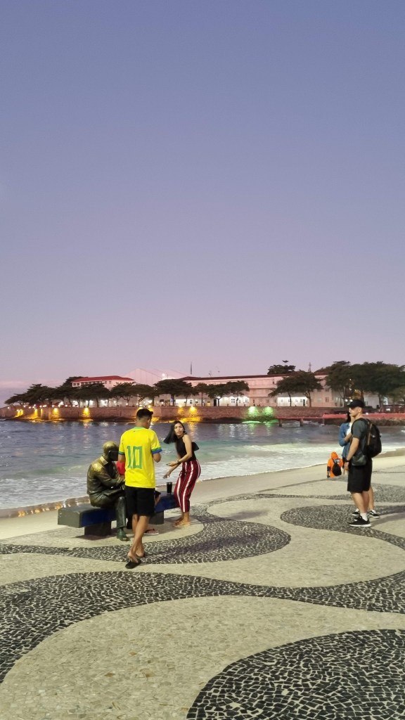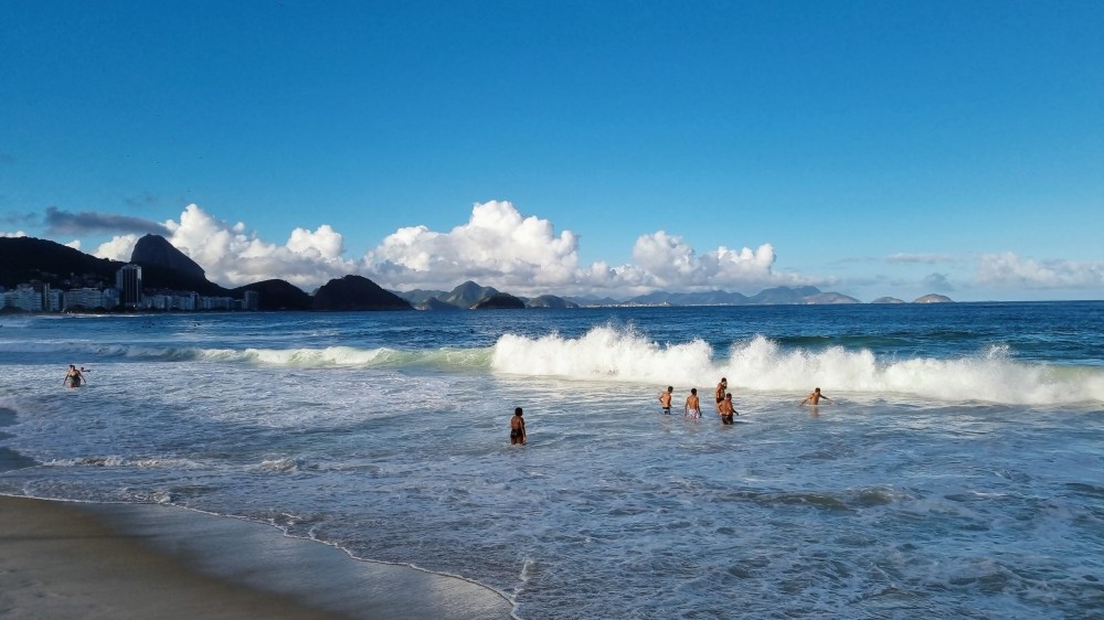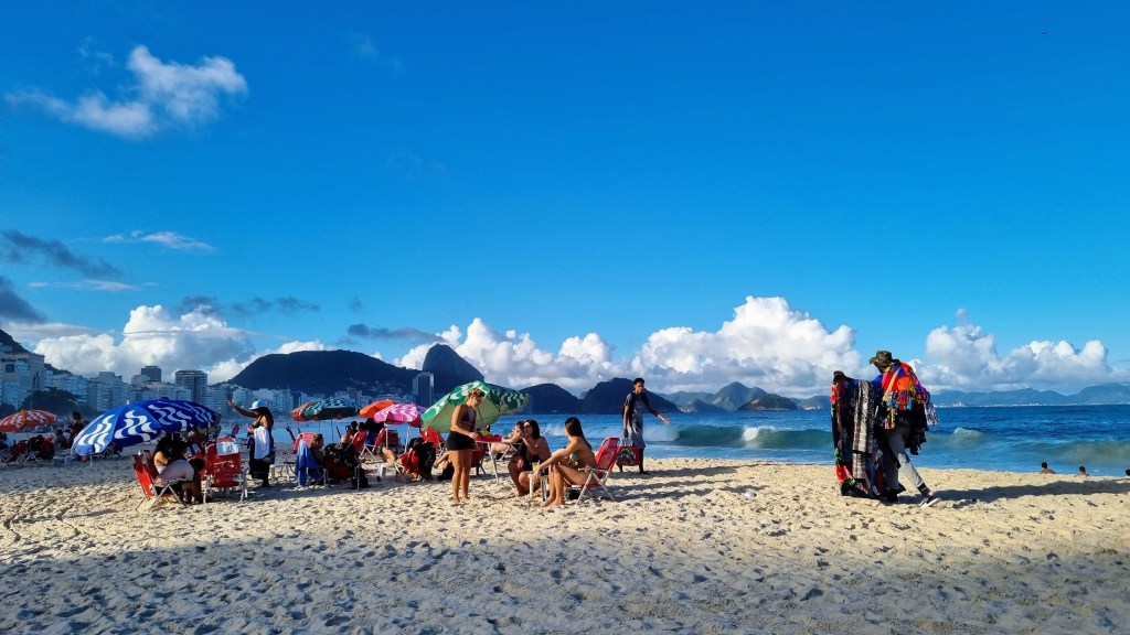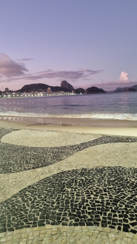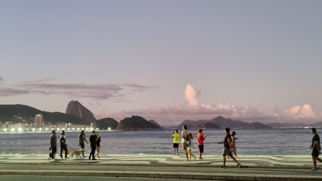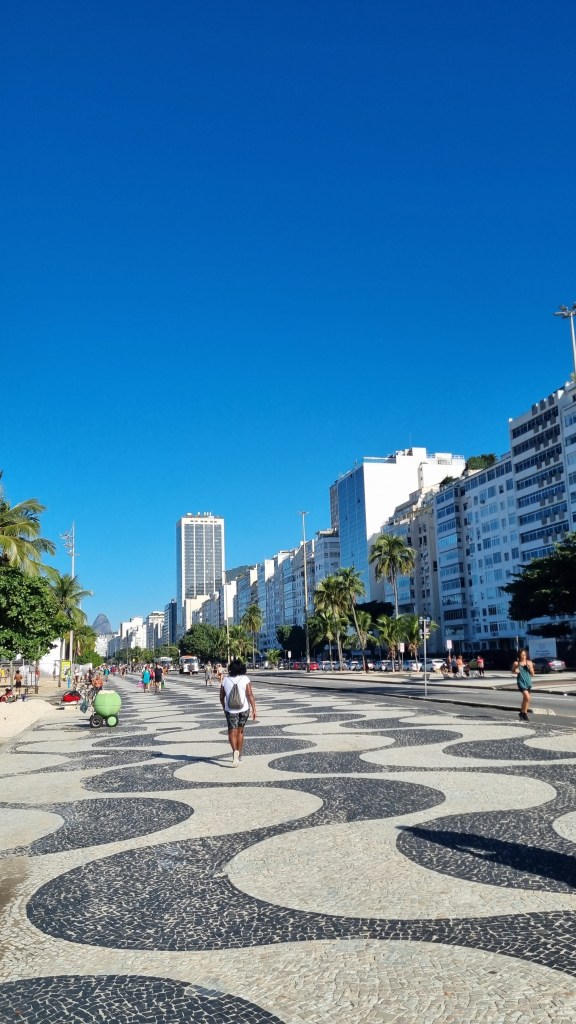 Copacabana, son trottoir aux millions de carreaux de mosaïques en noir et blanc trace des vagues monochromes tout le long d’un arc de cercle formé par la plage. Les coureurs y suent en musique, les vendeurs en shorts étalent sur le sol des bracelets porte-bonheur au hasard des places laissées vides par la concurrence, d’autres exposent sur des panneaux verticaux des lunettes déjà brûlées de soleil. Des gaillards torses nus, un plateau en métal au bout des doigts proposent à la volée des caïpirinas géantes dans des verres en plastiques transparents. Copacabana sent partout le citron vert et la cachaça, signes indiscutables que nous nous promenons sous les tropiques.