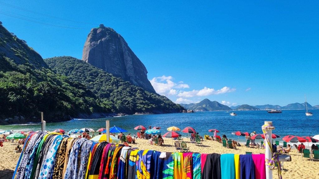 Jusqu’à la mer, le sable fin et clair est ponctué de stands de toiles éphémères et numérotés. Chacun est pourvoyeur, pour quelques réals, de transats un peu bancals et de parasols colorés qui formeront sur le sable un feu d’artifice au plus fort de la journée. Des chalands nomades portent à bout de bras des kilos de maillots de bain jaunes, rouges ou verts, accrochés à un parasol, des paréos aux couleurs éclatantes du Brésil, des pagnes imprimés de fleurs exotiques qui sentent le sel et la vanille.
