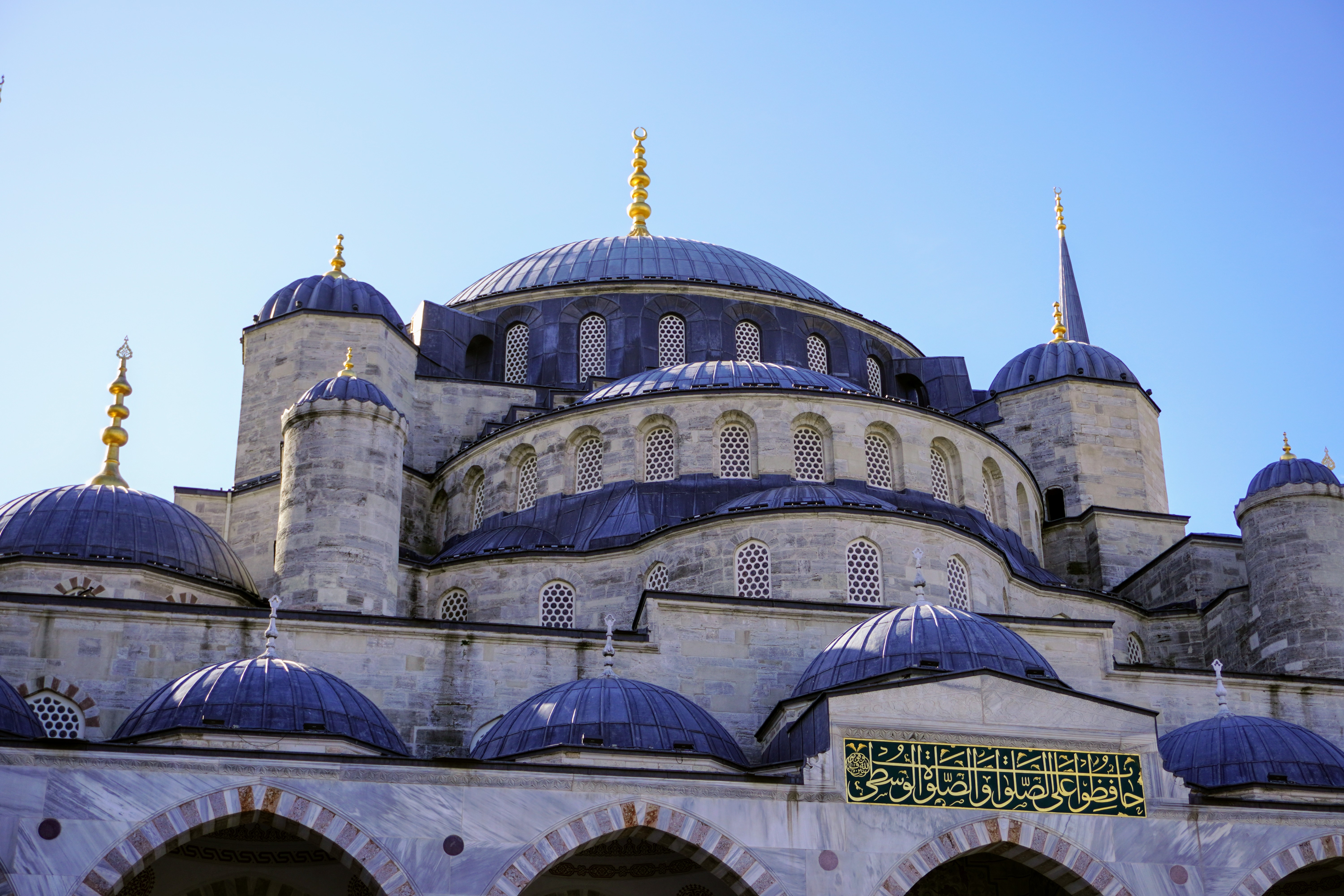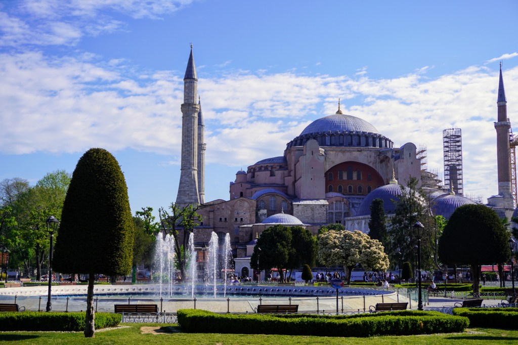 Sur les hauteurs de la rive sud, Sainte Sophie de Constantinople se distingue par sa teinte brique depuis les rives du Bosphore. Ailleurs sur la côte au fil de l’eau et du relief, les minarets calcaires aiguisés comme crayon de bois signalent d’imposantes mosquées qui dessinent dans le paysage d’Istanbul des forteresses de pierre plutôt que des lieux de prière.