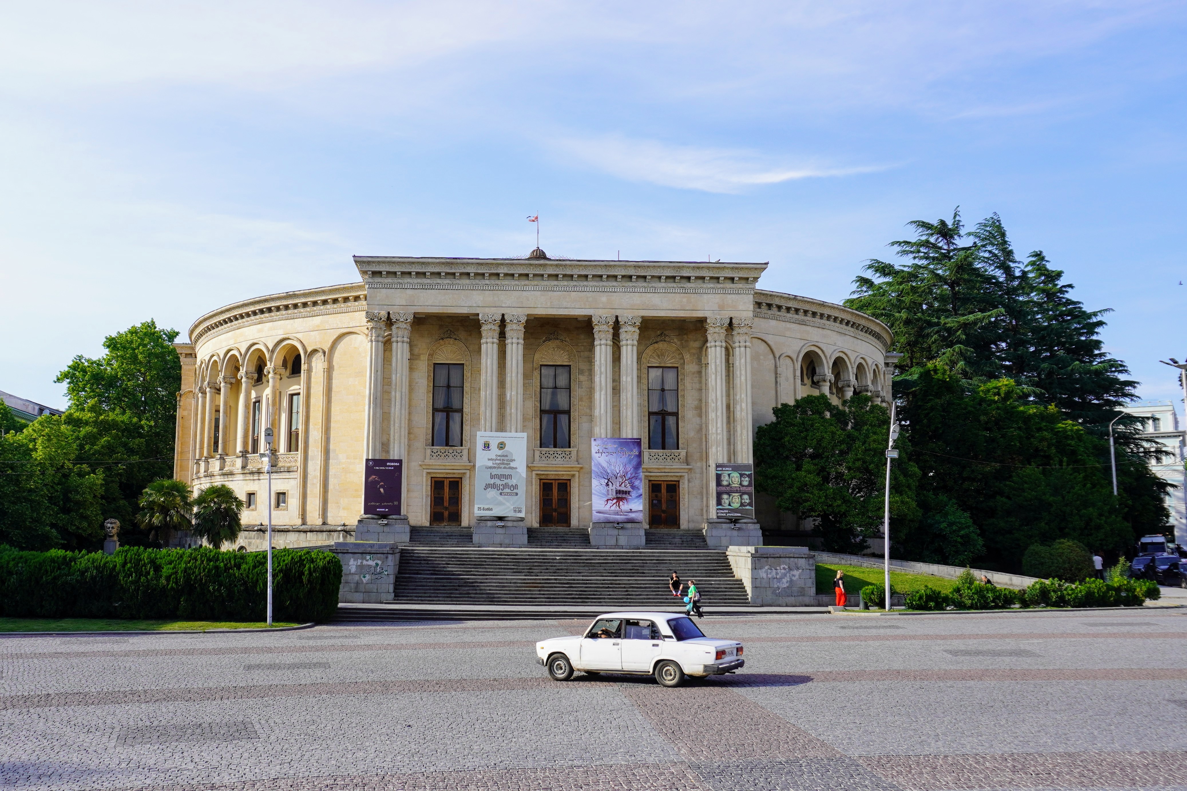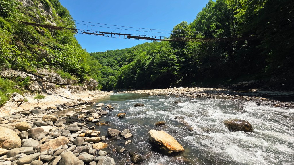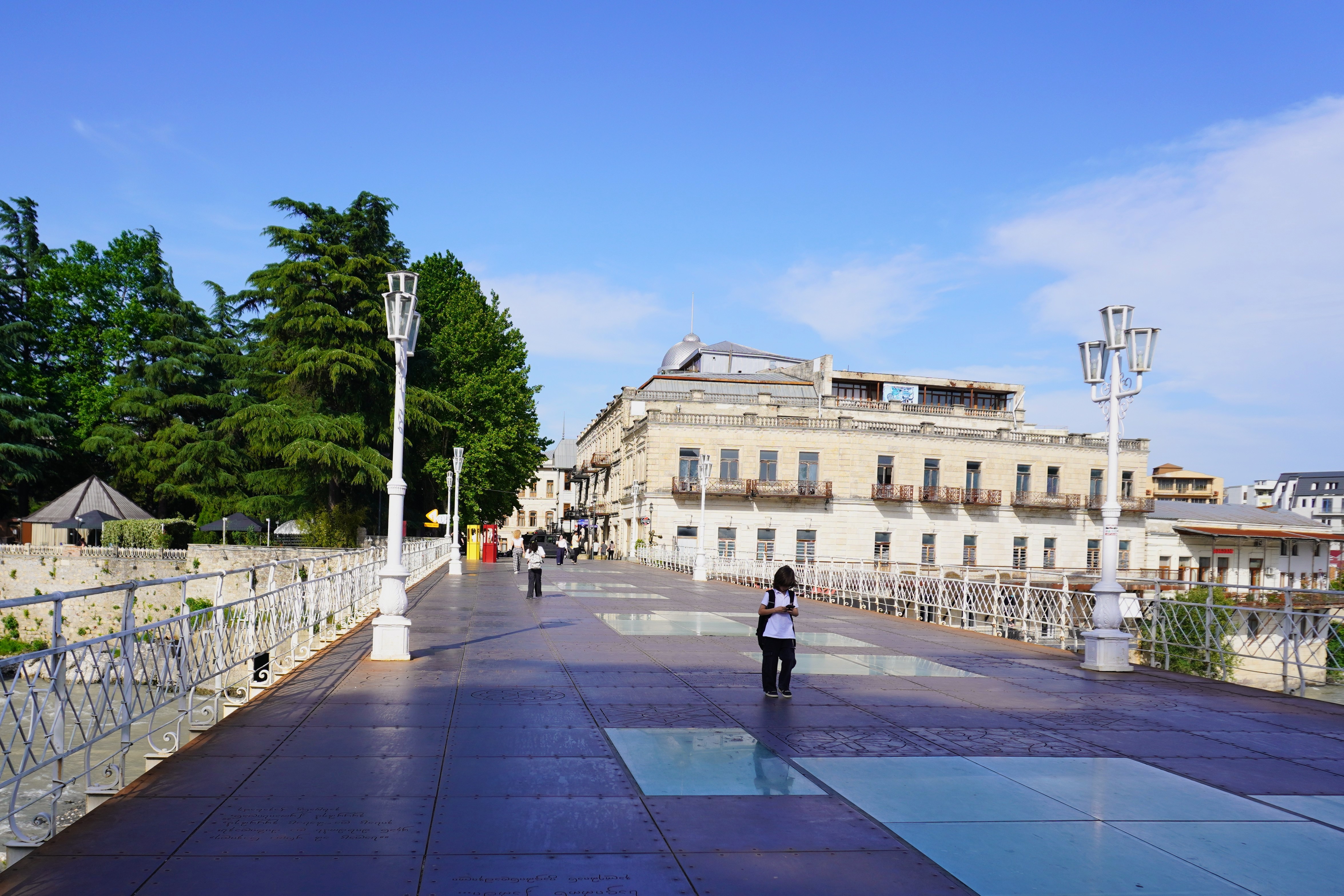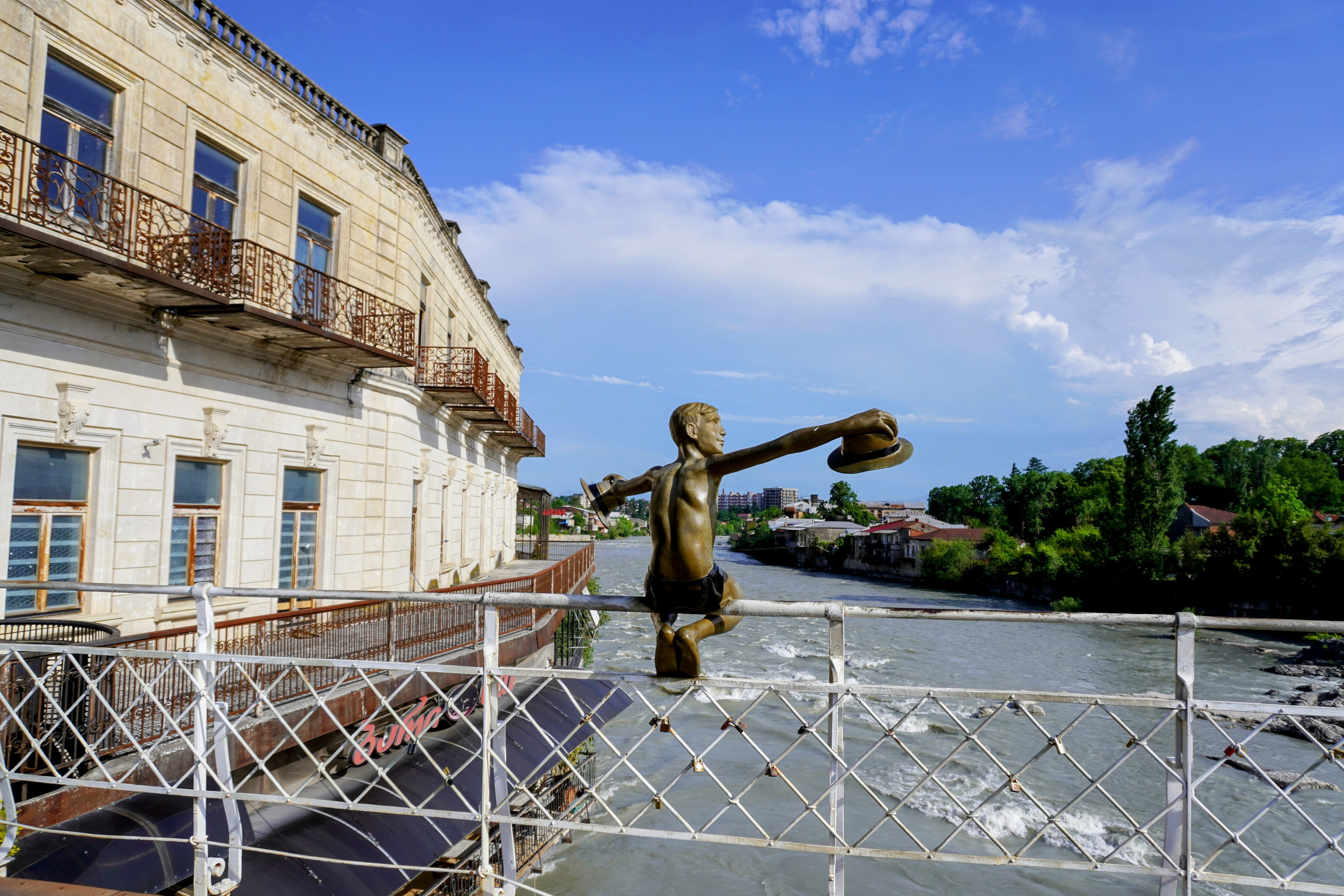 Les soirées de Koutaïssi sont des flâneries douces et gaies au bord de la rivière Rioni. On passe sur le pont aux chaînes, on traîne les pieds sur le tablier du pont blanc, suivant d’un regard distrait les deux petites cabines rouges et jaunes du téléphérique se croiser au-dessus d’eaux grondantes et grises. Et puis c’est samedi, alors on laisse le temps filer encore un peu plus que d’ordinaire, les coudes posés sur la rambarde en écoutant une musique s’évader d’une terrasse voisine.