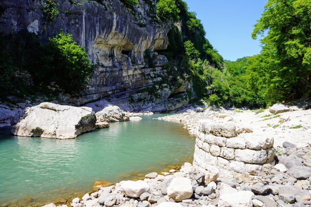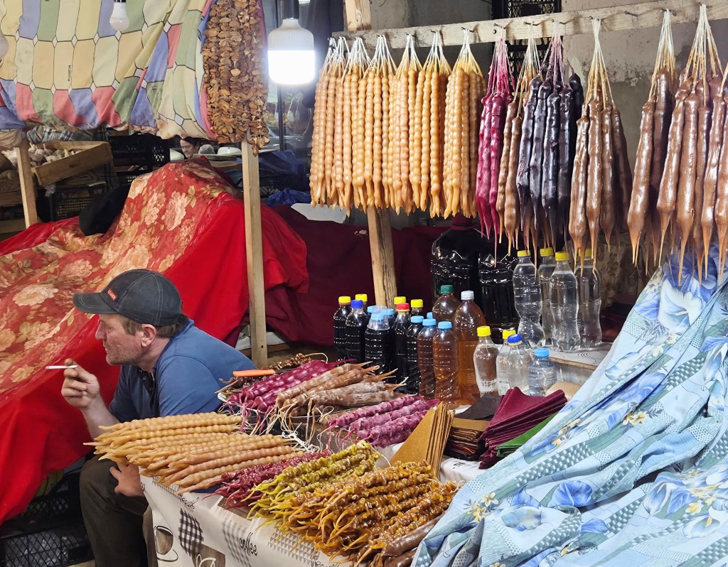 En posant le pied à Koutaïssi, on file au grand marché couvert pour acheter quelques tomates et un kachapuri, le pain géorgien en forme d’œuf sur le plat ou de poêle à deux manches, selon l’humeur. S’y ajoute un tchourtchkhela, une friandise en chapelet constituée de noix ou de noisettes, enrobées d’une paraffine à base de jus de raisin.