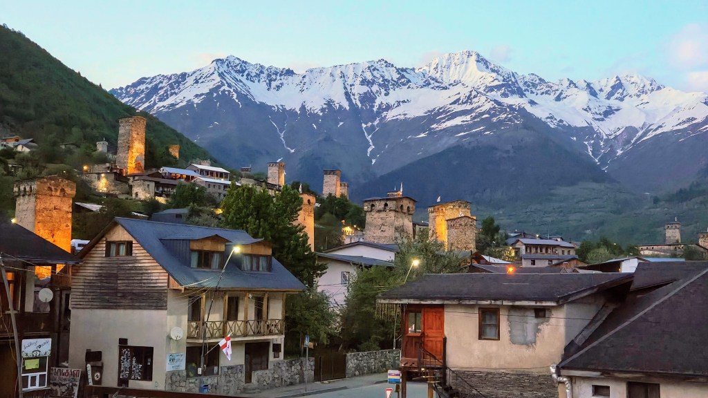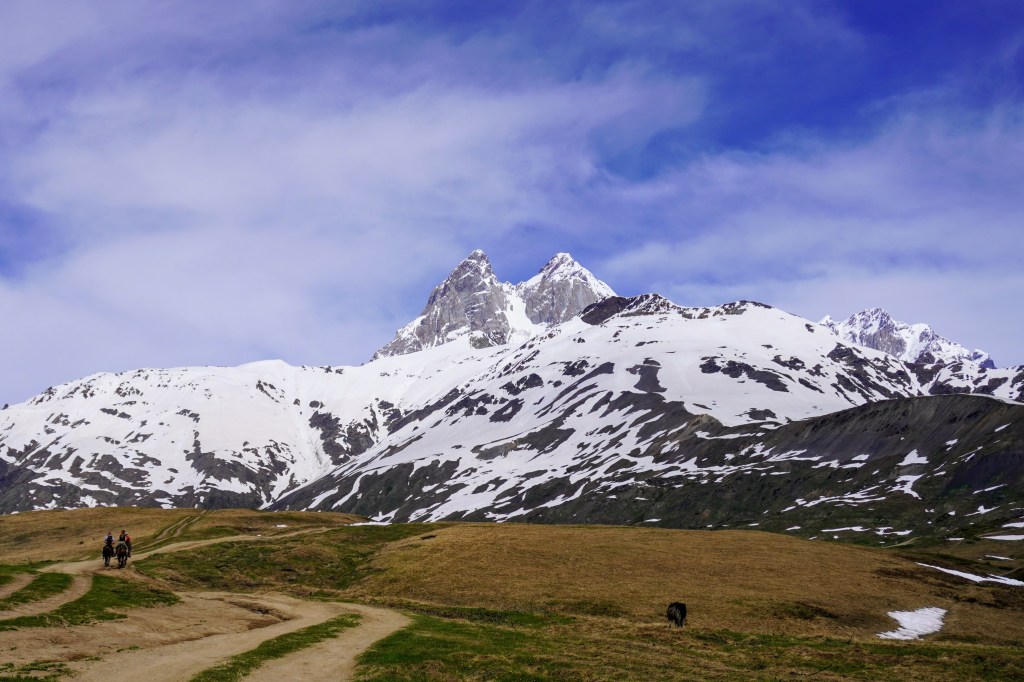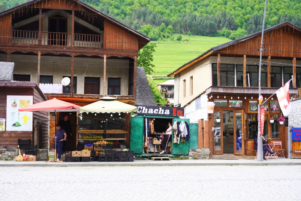 La Svanétie semble être une vaste estive paradisiaque lorsqu’on y jette un œil depuis la terrasse de notre chambre. Outre les immanquables tours carrées, surmontées du drapeau géorgien rouge et blanc, la rue principale de Mestia est également le lieu d’un spectacle constant.