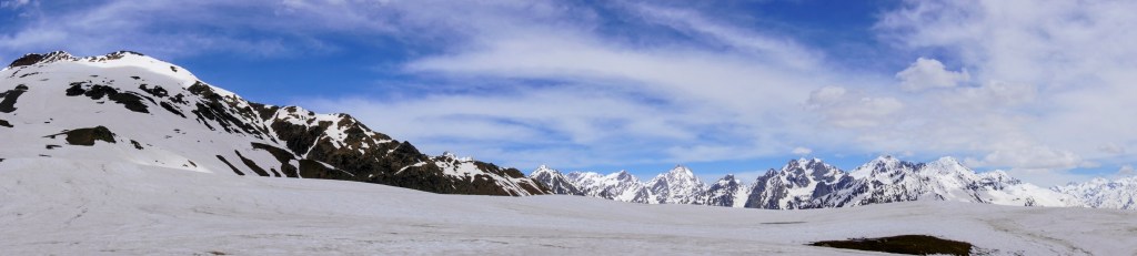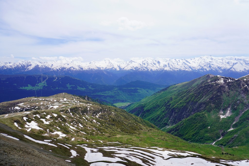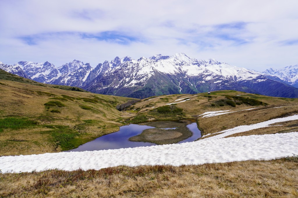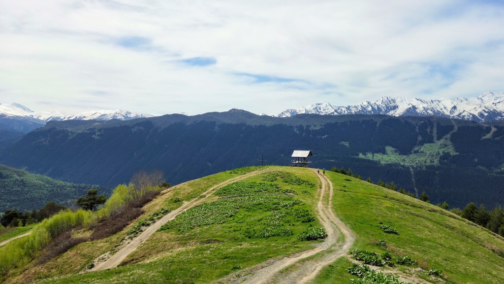 Mille mètres plus haut, on atteint un plateau d’où une grande croix en acier domine toute la vallée de Mestia. On poursuit L’ascension. La vue désormais dégagée, laisse apparaître en ligne de mire le mont Ushba qui culmine à 4710 mètres, aisément reconnaissable avec son jumeau à ses côtés. Sa légère ressemblance avec le Fitz Roy nous rappelle nos chères échappées argentines. Le ciel est dégagé et la neige, très présente encore fin mai, masque les lacs que nous pensions découvrir. Le pays blanc qui s’offre au regard est une bien large compensation.