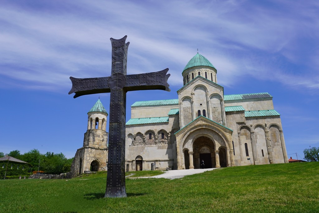 On emprunte le chemin qui monte sous les arbres en direction d’une église repérée en descendant de la marhsrutka. La cathédrale de Bagrati sise sur la colline Uk’imerioni fût construite au onzième siècle, détruite en partie par les troupes ottomanes en 1692 avant d’être restaurée au milieu du siècle dernier. Symbole de la troisième ville du pays, elle doit aussi sa renommée à sa vue imprenable. Soleil et digestion faisant généralement bon ménage, on s’allongera sur l’herbe le temps de savoir encore une fois ce qu’on allait bien pouvoir faire de nos vies et accessoirement du reste de la journée. N’ayant pas trouvé réponses à toutes nos questions, on redescendra chercher des indices dans les rues de la ville, non sans s’être fait préalablement rudoyés et taxés d’une obole par de larges femmes bavardes et potaches faisant profession de mendicité au pied de la cathédrale.