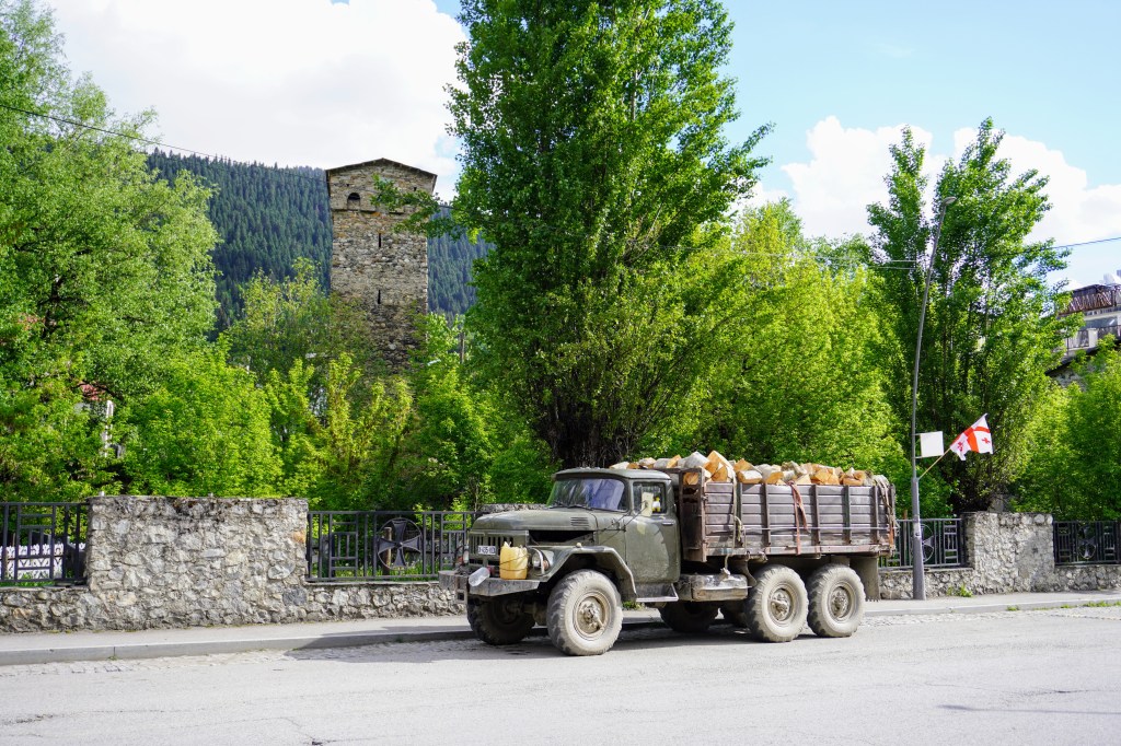 Il faut bien 6h00 depuis Koutaïssi pour atteindre Mestia en marhstrutka. C’est le nom imprononçable attribué aux camionnettes que l’on peut emprunter partout dans l’ex-union soviétique. Ça signifie littéralement en russe « taxi en route ». Dans la pratique, ça se traduit par « tape-cul communautaire », le couteau soviet de la route et de la débrouille. Une école de patience qui ne démarre que lorsqu’il est plein. On nous conseille de ne jamais les emprunter de nuit, la faucheuse et l’ivresse faisant parfois partie du voyage. La vérité est que depuis notre arrivée en Géorgie, les chauffeurs de marshutka sont à l’heure et conduisent comme des anges. Alors soit la chance est de notre côté, soit on nous a bien baratiné.