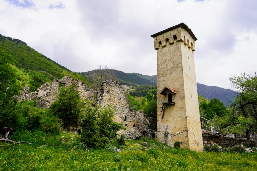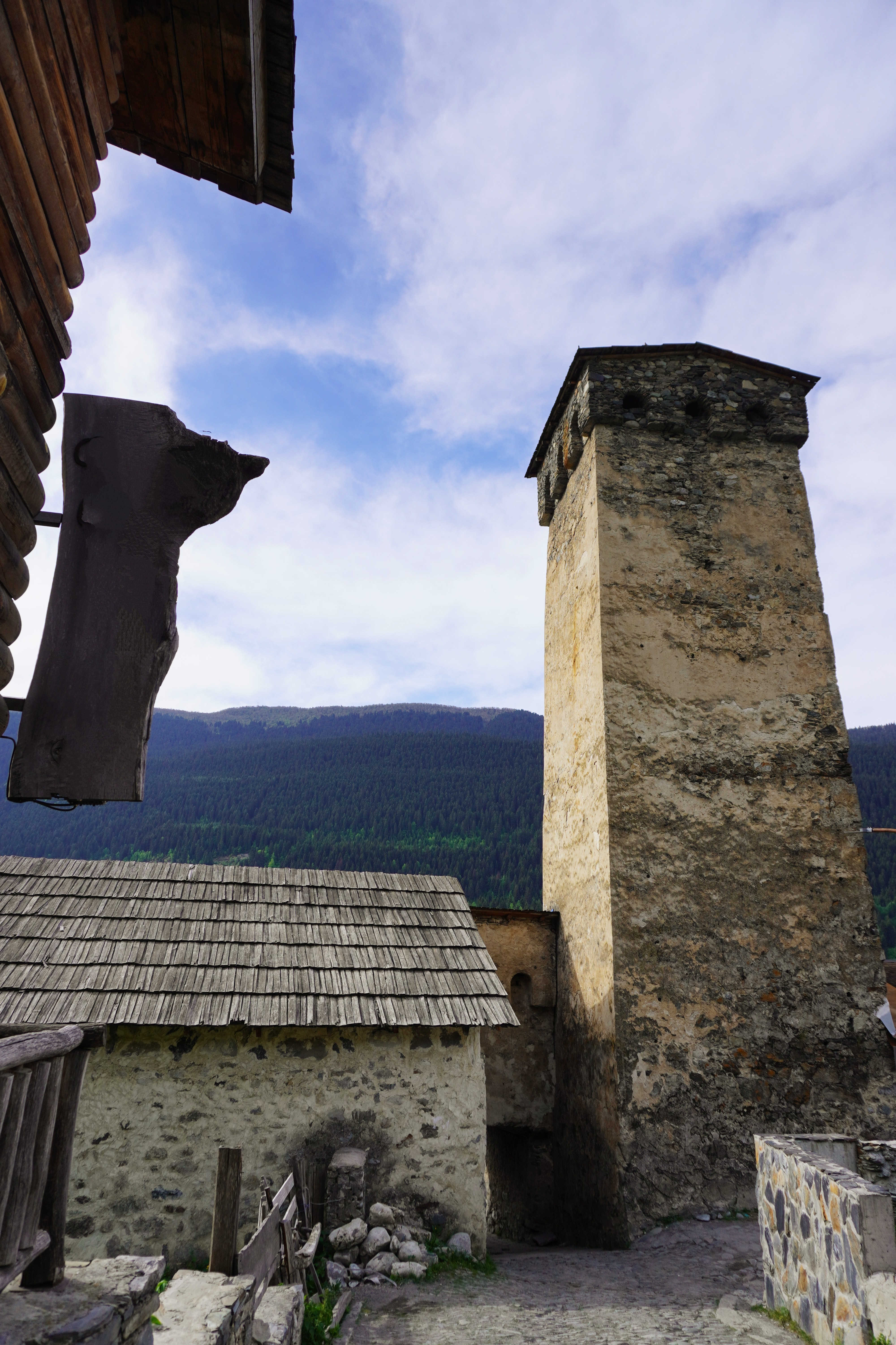 Seule, elle est simple tour carrée, phare de mer ou tour génoise, signalant la présence du foyer au voyageur, veillant au grain, guettant les invasions barbares. En nombre, érigées aux pieds des maisons, elles deviennent corps d’armées tendues jusqu’au ciel, menaçants soldats de pierres défendant la vallée. Les tours svanes sont les premiers édifices que l’on voit en arrivant à Mestia. Le fond de la vallée s’arrête à Ushguli à quelques dizaines de kilomètres de là et tout le long de la rivière en Svanétie, les hameaux se signalent par ces bâtisses médiévales au coeur des montagnes du Caucase. Outre leurs aspects défensifs, les « koshki » sont également une démonstration de richesse et un symbole de pouvoir. Classées au patrimoine de l’UNESCO, elles sont le reflet et la fierté de la culture svane.