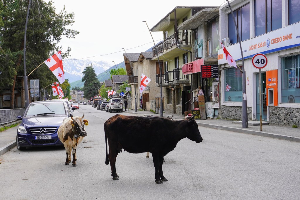 Les animaux sont en Géorgie laissés volontiers en liberté. Alors il n’y a rien d’extraordinaire à observer des vaches stationnées devant une épicerie, un cheval solitaire trottant sur une route ou des cochons traînant devant une échoppe. Quand aux chiens présents en nombre, on les trouve allongés sur les trottoirs, au milieu des routes en lacets ou suivant un inconnu sur un sentier de montagne. Loin d’être un privilège automobile, la route se partage assez naturellement, occasionnant ainsi de nombreux slaloms, ralentissements et autres arrêts intempestifs afin que chacun y trouve sa place. Et cela devient évidemment une source d’amusement pour qui observe la scène.