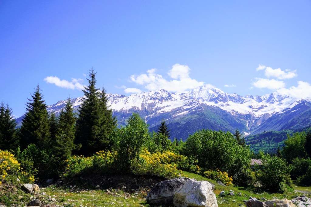 Le lendemain, nous nous engageons sur l’autre versant, à hauteur des patures fleuries. Les rhododendrons font des bouquets lumineux qui jalonnent le chemin. Au loin, le glacier Chalaadi gris souris descend en fond de vallée.