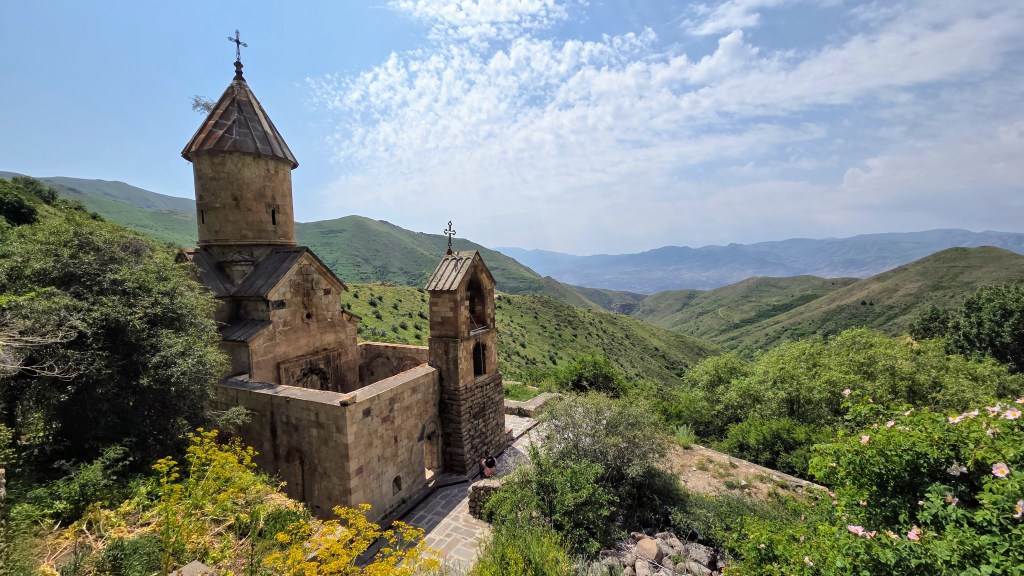 On emprunte un sentier de pierre en copinant un temps avec un ruisseau puis en se frottant ensuite à des falaises abruptes pour finir par dépasser 2000 mètres jusqu’à l’église Saint Astvatsatsine. Encore une fois, l’édifice et son environnement valent largement quelques jurons poussés en dérapant dans la pierraille sous le soleil. C’est beau, même avec de la sueur dans les yeux.
