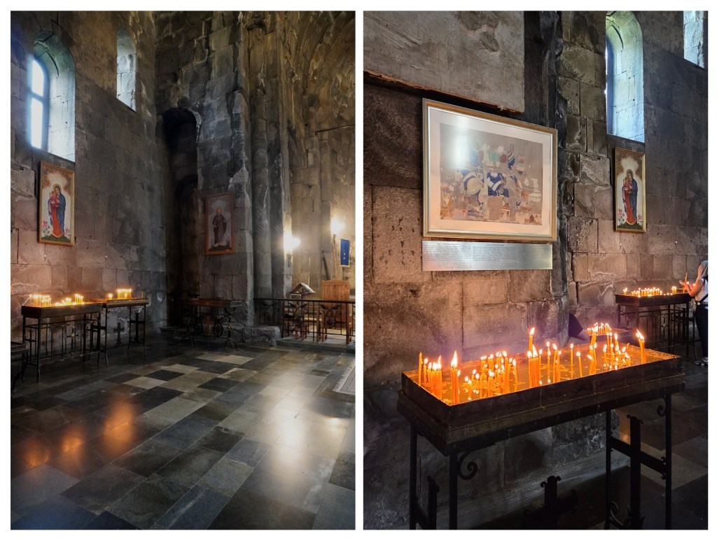Entrer dans l’église de saint Grégoire, c’est pénétrer dans une grotte. Les murs anthracites, comme brulés, sont dénudés. De larges dalles de marbres, noires également, sont recouvertes sur quelques endroits de tapis pâles et patinés. Les fenêtres semblables à des meurtrières sont les uniques puits de lumière.