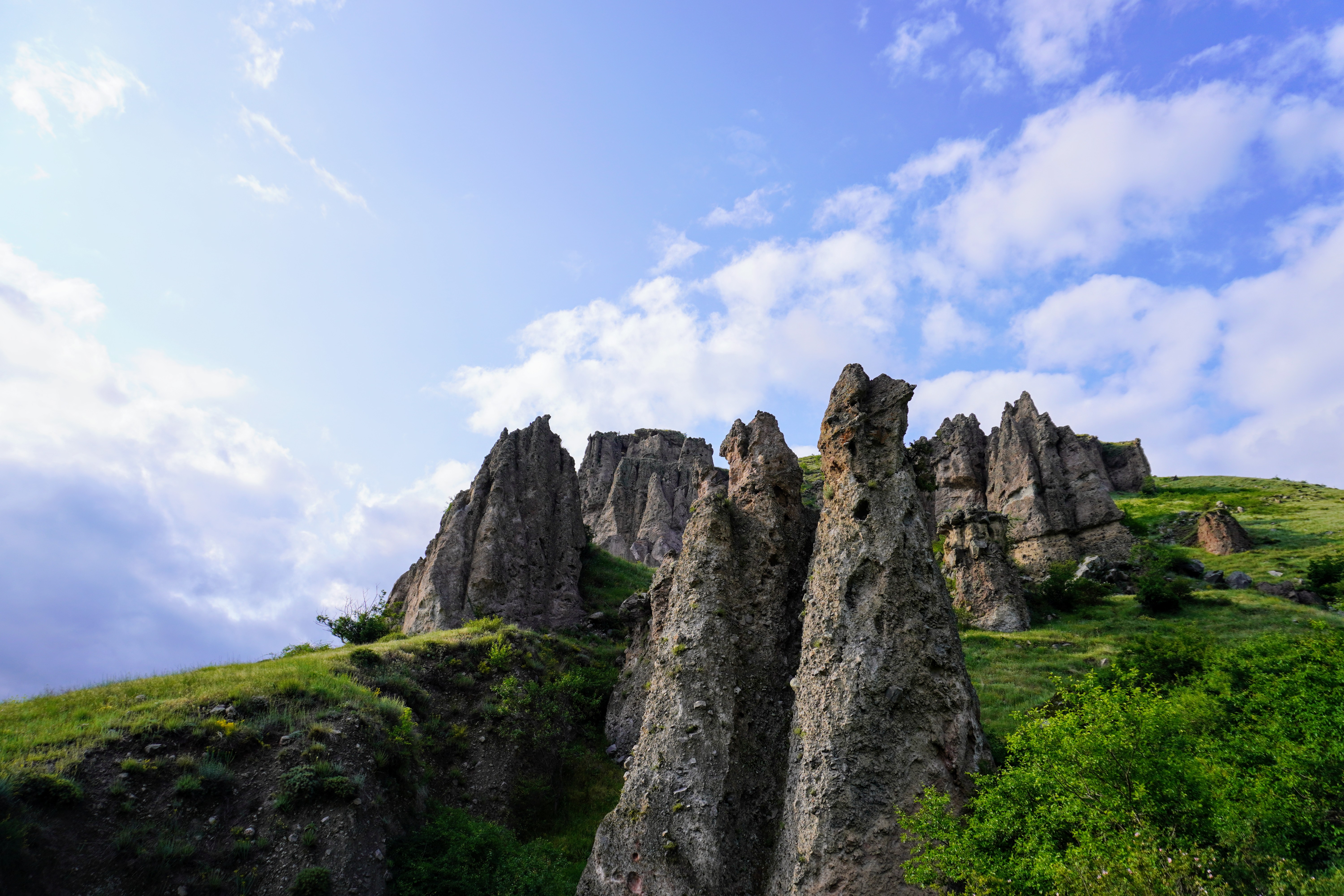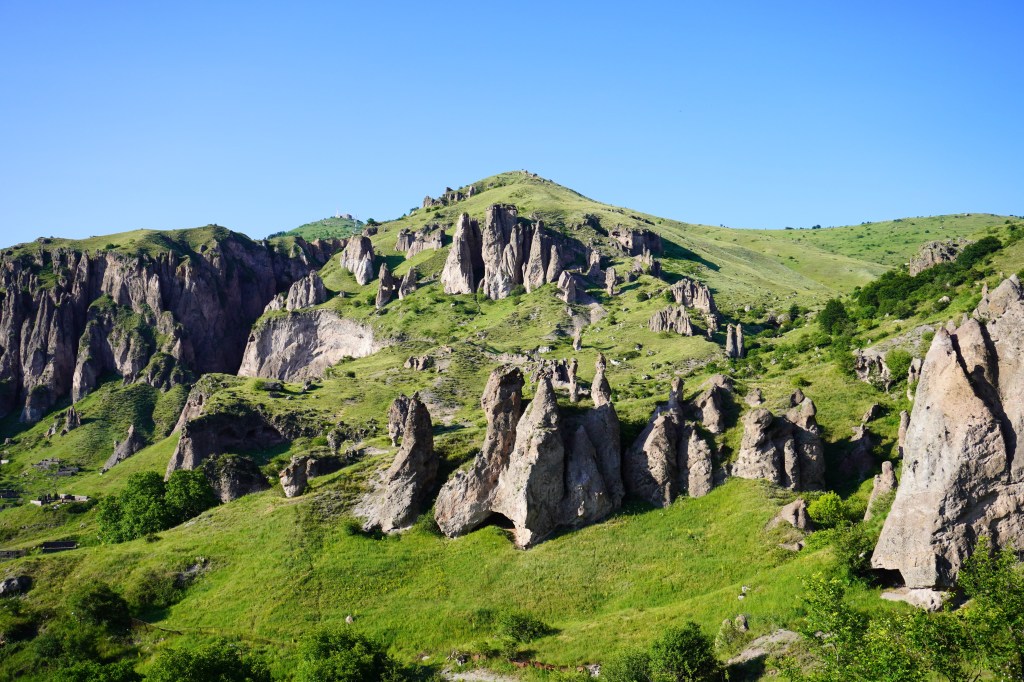 On monte sur les hauteurs, par des chemins qui embarquent nos pas à travers un pays de collines verdoyantes. De là, on a vue sur toute la ville recroquevillée dans la vallée. Elle est un peu à l’image du pays. L’Arménie, c’est l’histoire d’une anomalie ethnique plurimillénaire, c’est une île chrétienne noyée au milieu d’un orient turcique.