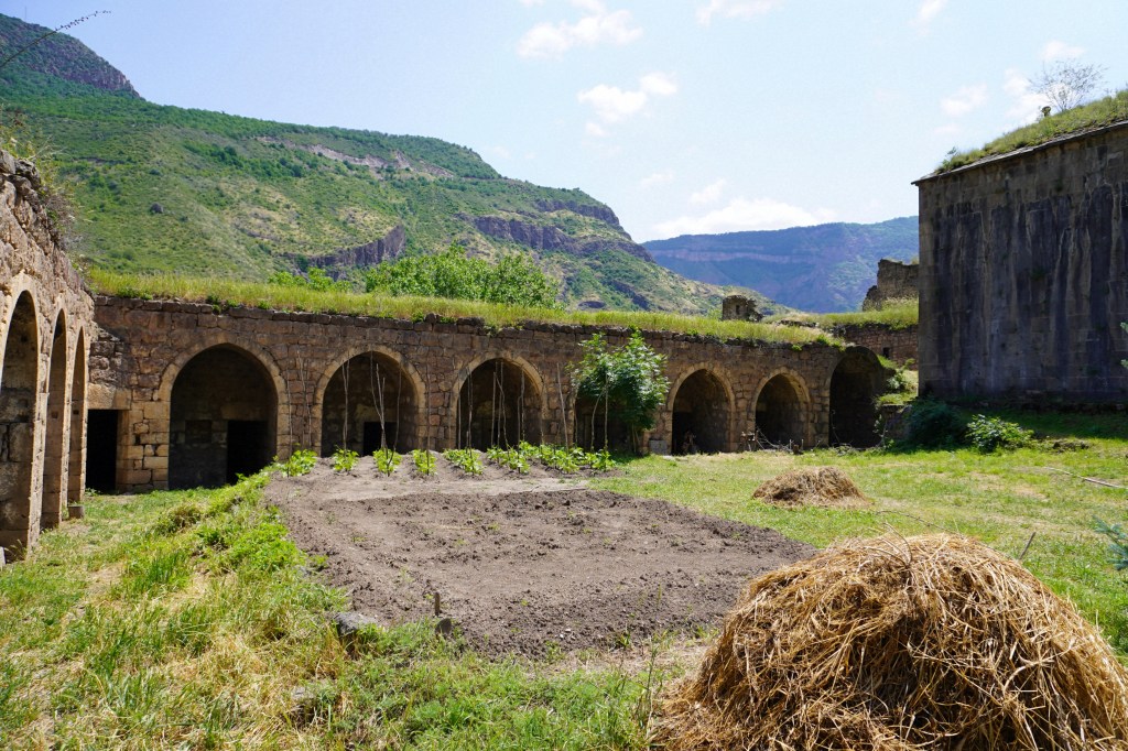 Dans le monastère, la vue est spectaculaire depuis les balcons qui surplombent la falaise orientée à l’est. Toute la vallée s’engouffre dans les rétines en même temps qu’un vent tiède balaye les visages avant de plonger dans la gorge de Vorotan.