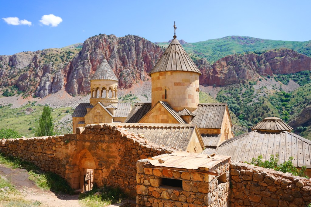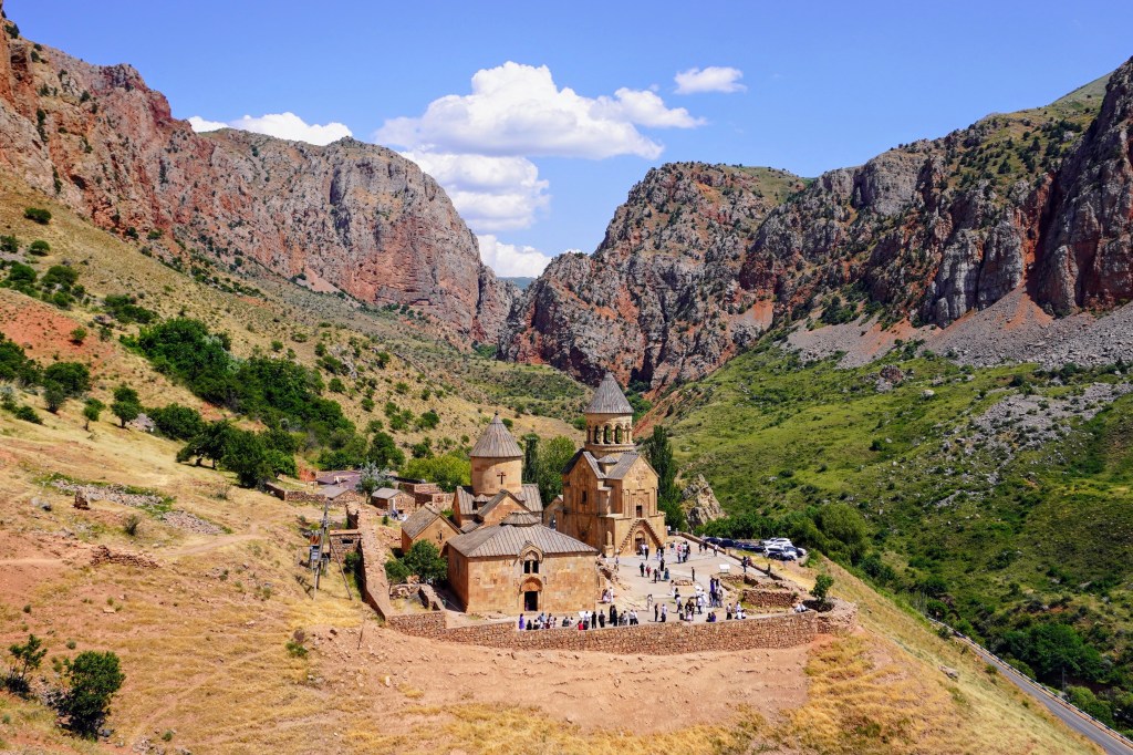 Sur la route entre Erevan et Goris, il y a un monastère capable de lever les cœurs. Au détour d’un virage après un défilé de virages entre des hautes parois de montagne qui surplombent la rivière Amaghou, on le voit s’élever sur un replat au sein d’une minuscule vallée, Noravank.