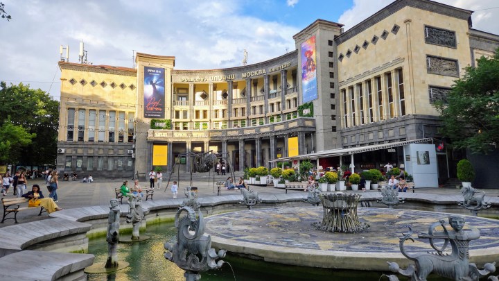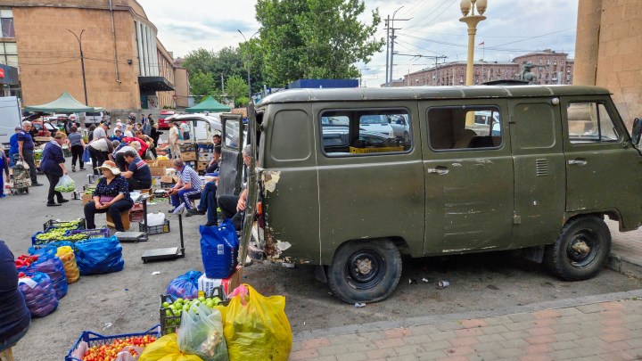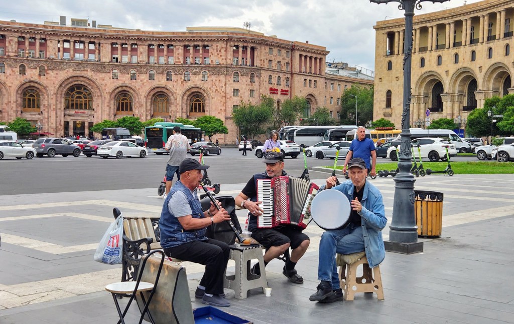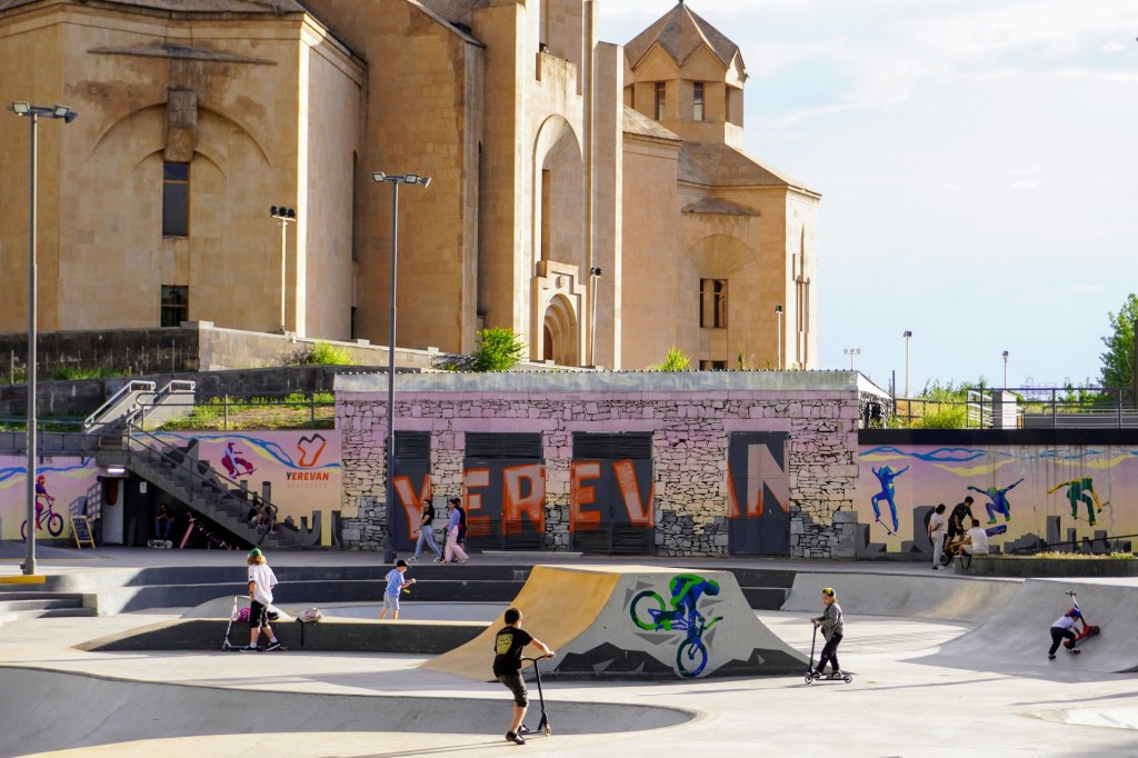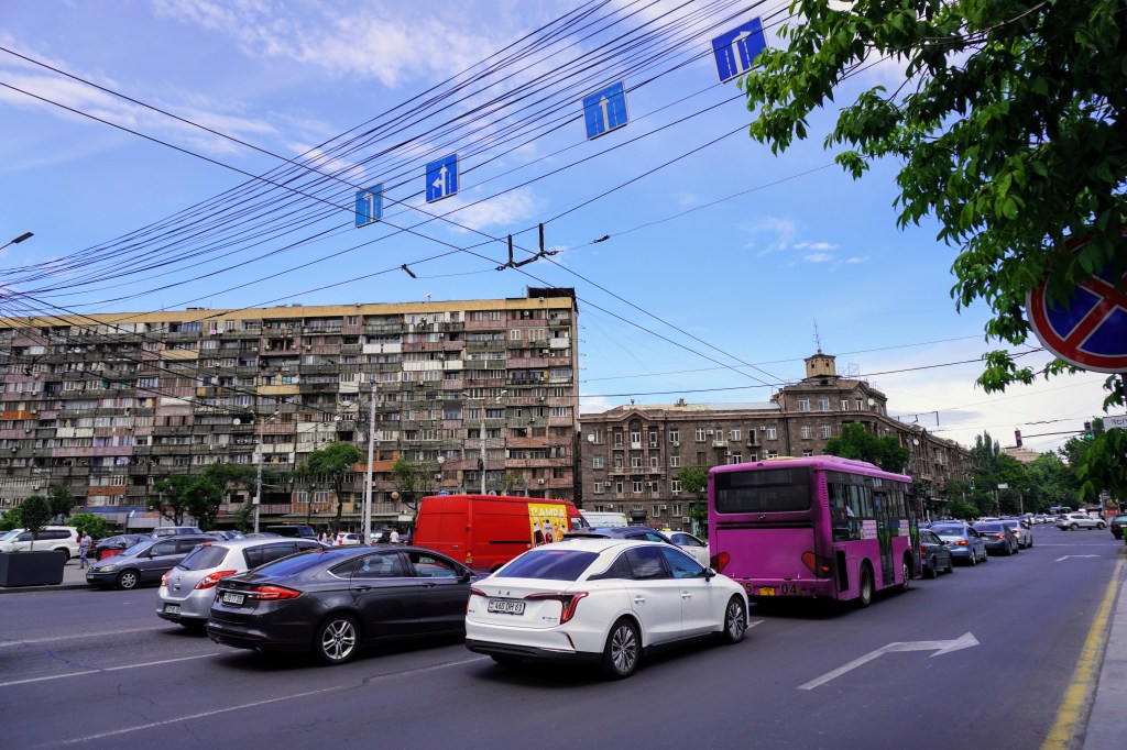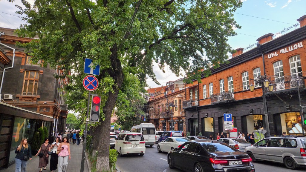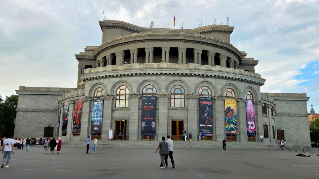 Diamétralement opposé à la désordonnée Tbilissi, le plan des rues de la ville est rigoureusement taillé au cordeau. Les façades brutes des bâtiments dénuées d’aspérité donnent le ton. C’est massif, carré, inventé pour être utile et tant qu’à faire, prévu pour impressionner le visiteur. Seules les teintes roses et crèmes du tuf volcanique local viennent apporter une fantaisie bienvenue et alléger un peu ces monolithes à l’esthétique toute soviétique.