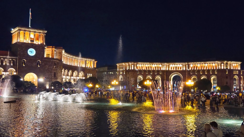 Place de la république, les jets d’eau jouent une partition scénique pour veilleurs de nuit. Une musique de fond l’accompagne. On s’agglutine avec les érévanaises, les évéranais devant les projections d’eau lumineuses.