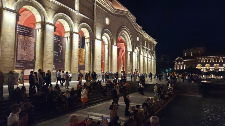 Il y a le palais du gouvernement qui rosit dans la nuit et la place de la république, orpheline de sa statue de Lénine, qui ne veut toujours pas aller dormir. Erevan veille encore une seconde.