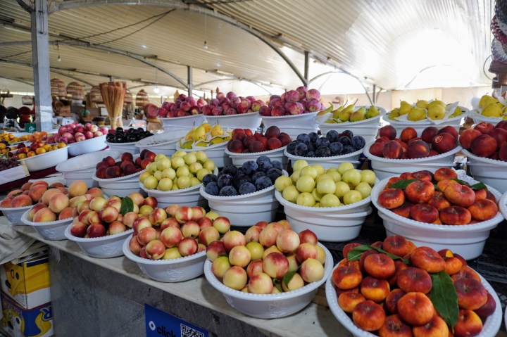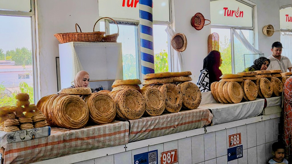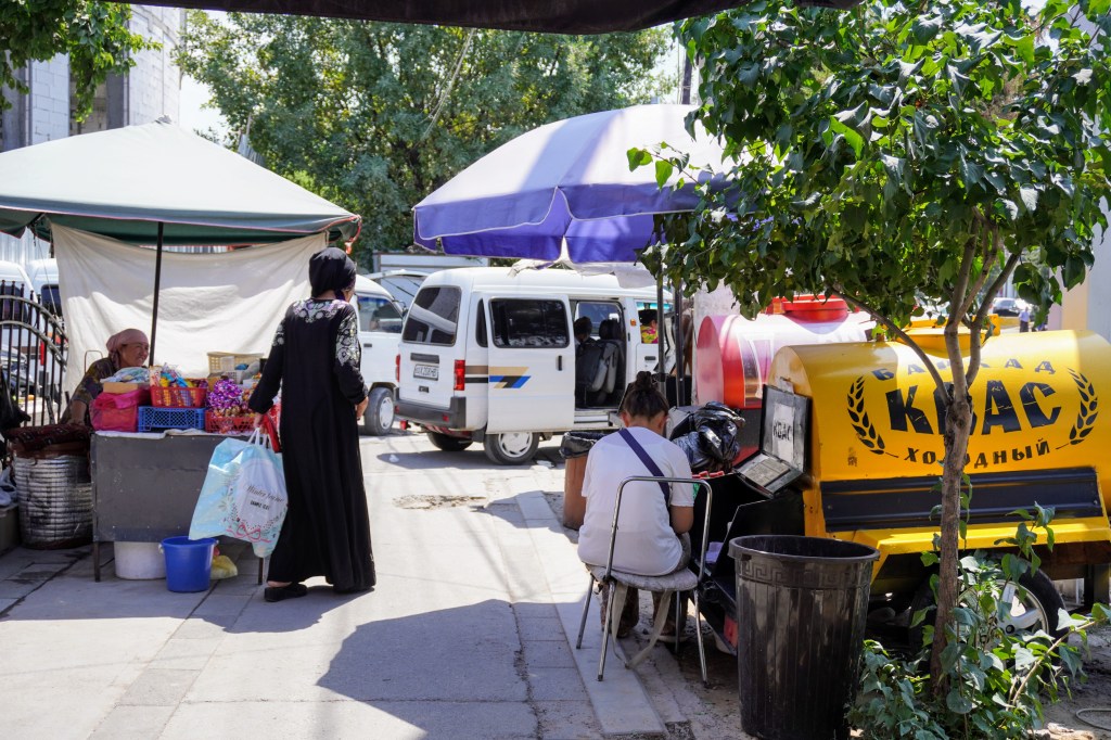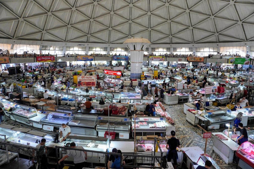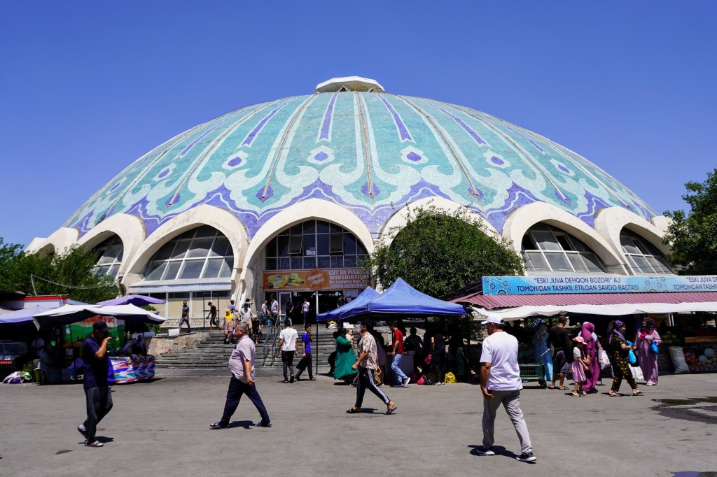 Une fois rafraîchi, on prend la direction du bazar au nord. L’activité humaine devient bien plus grouillante autour du marché de Chorsu. C’est là que tout Tachkent se retrouve pour y faire provisions. La coupole principale du marché regroupe par secteurs les corps de métiers de bouche et s’étend largement à l’extérieur. Les grooms suivent avec leurs chariots les commerçants venus acheter en gros, tomates et pastèques géantes, batterie d’œufs et quartier de viande. Les particuliers ont l’embarras du choix pour choisir les légumes qui viendront remplir leurs casseroles ce midi.