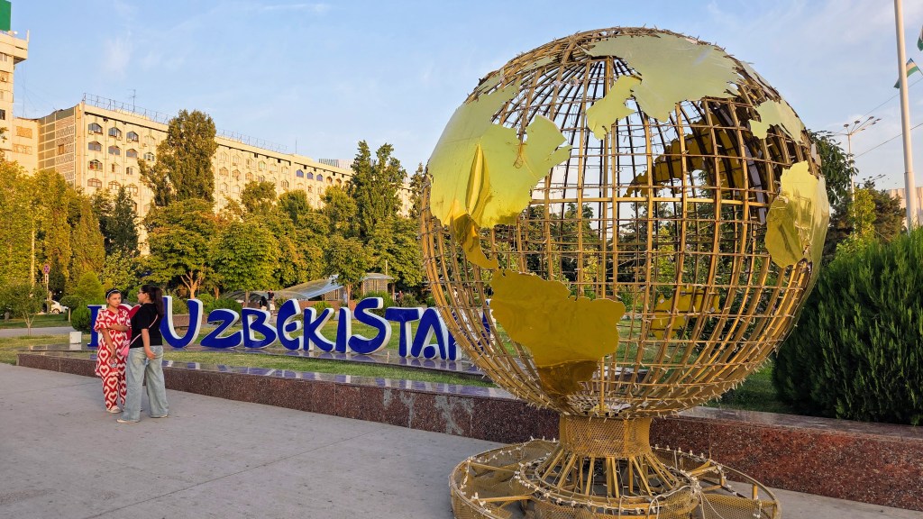 Tachkent est une ville grande mais peu dense, si bien que ses trois millions d’habitants ont du mal à exister dans cet univers minéral. On a souvent l’impression d’être un peu seuls à allonger la semelle dans les rues extravagantes du centre ville moderne. Le projet du gouvernement est de créer un centre économique tourné vers les affaires au coeur de la ville. C’est peut-être efficace économiquement mais pour le visiteur, ça laisse plutôt de marbre malgré les températures assommantes. On suit le défilé des grandes artères bordées d’immeubles de bureaux jusqu’à la place de l’indépendance pour finir par buter au pied de la statue de celui qui est considéré comme le père de la nation ouzbèke, Amir Temur.