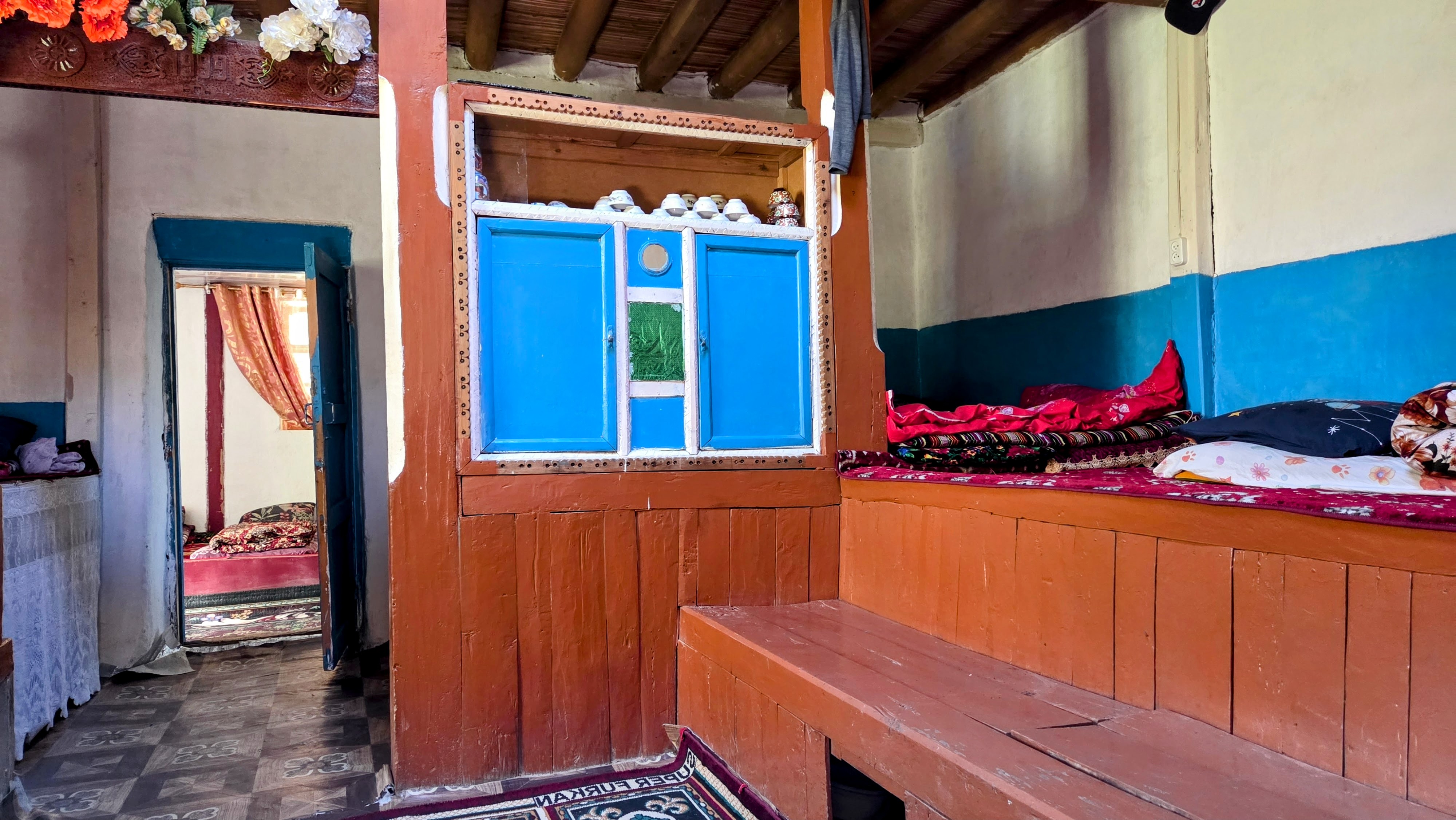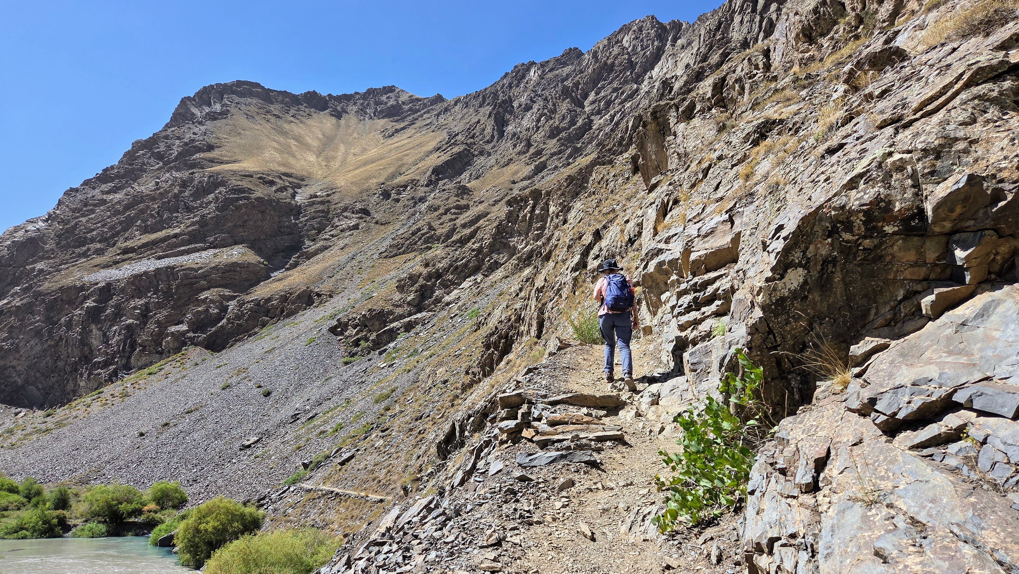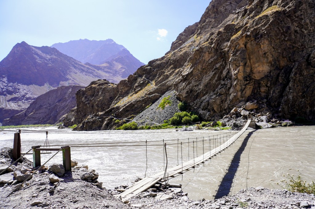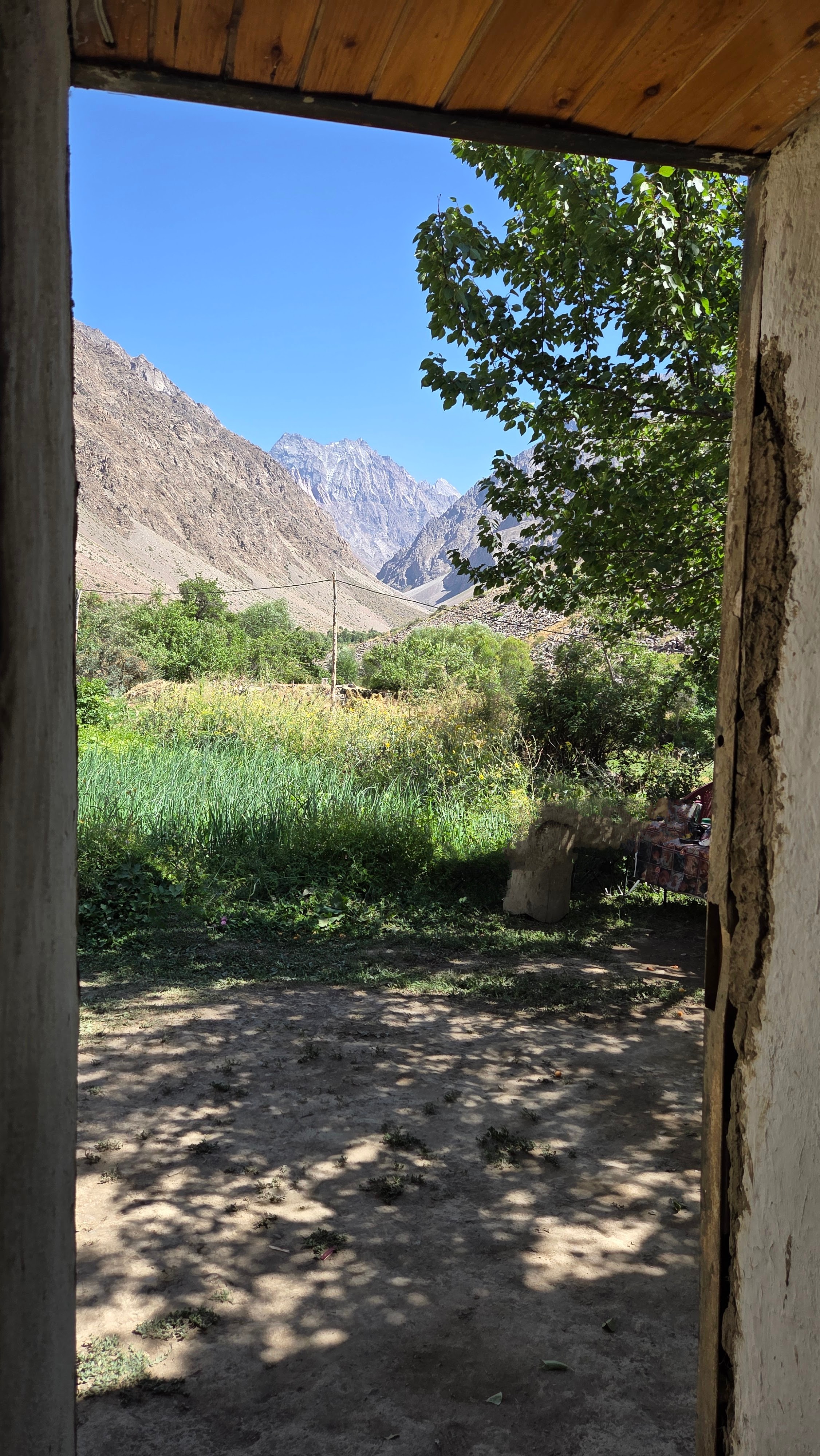En fin de matinée après notre entrée dans la vallée par un pont supendu qui traverse la rivière Bartang et deux petites heures à monter en suivant un sentier de pierres, nous arrivons à Chadin, un village composé de trois maisons et autant de bergeries.