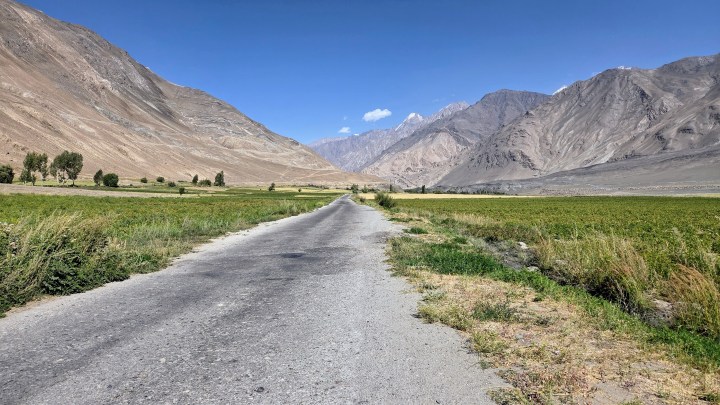 8h00, une marhstrutka, petit format japonais plus fatigué que nous, s’engage dans le Wakhan. La vallée est étroite et opére un étrange rapprochement avec la rive afghane. Curieusement, nous ne sommes pas les seuls à jeter régulièrement un œil de ce côté de la rivière. Les anciens, avec qui nous voyageons, surveillent chaque mouvement en même temps que nous. L’un d’entre eux avait évoqué les talibans avant de partir : « Il y a eux à une trentaine de mètres et puis il y a nous », disait-il. Fatalisme triste. Ils sont si près qu’on pourrait presque bavarder un instant avec eux. Le long de la route, des postes de garde individuels en pierre tiennent lieu de bornes kilomètriques. Il y a peu encore, les trafics en tout genre, dont celui de l’opium, transitaient aisément par cette frontière complètement poreuse. Aujourd’hui, on ne sait pas si l’arrivée des talibans a mis un terme à ce commerce de l’ombre. On en doute. En tout cas, les jeunes militaires qui patrouillent par trois ou quatre le long du fleuve ne peuvent certainement pas contrôler grand chose sur une frontière aussi grande et si facilement franchissable.